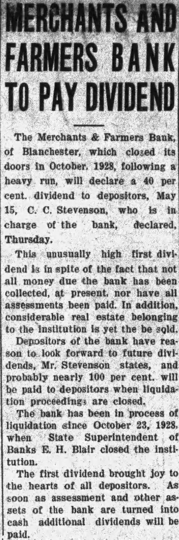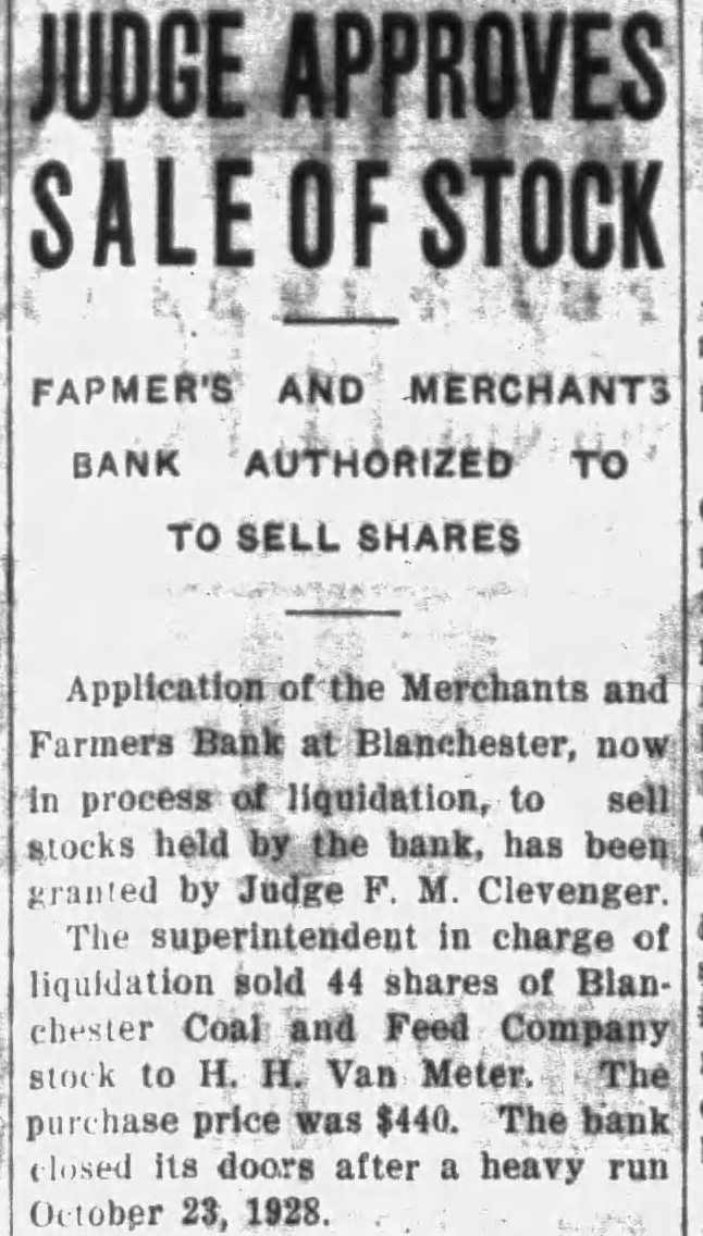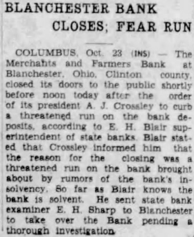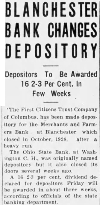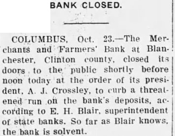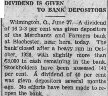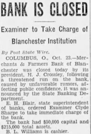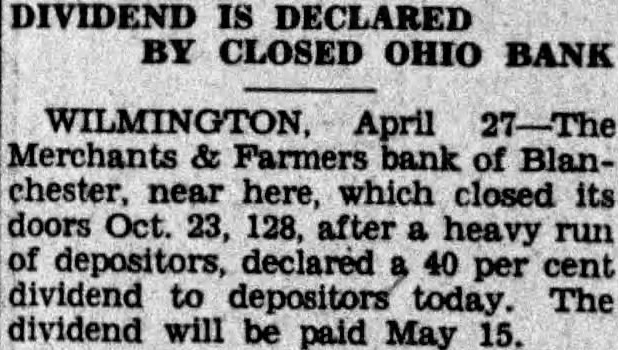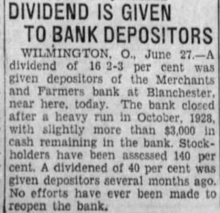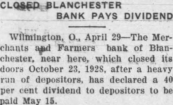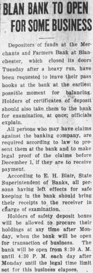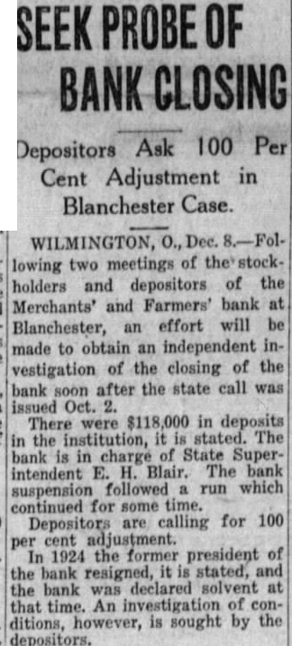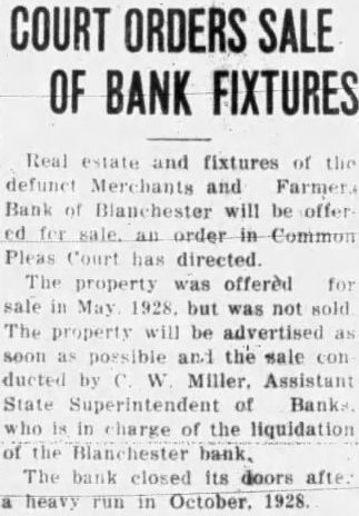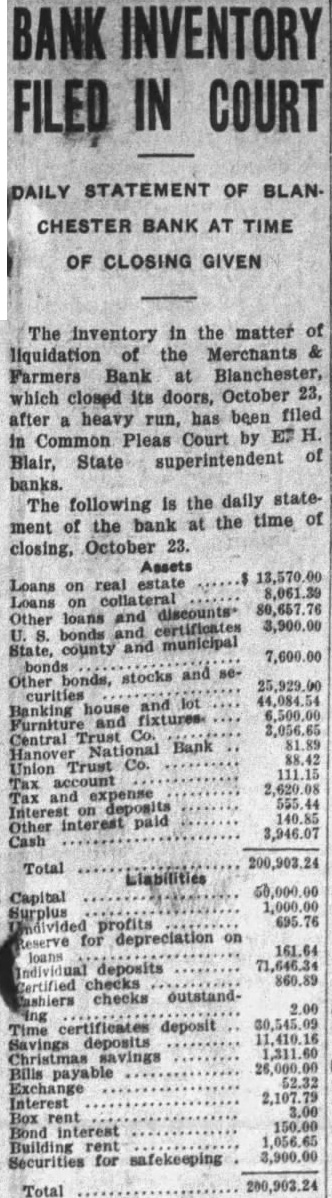 The inventory in the matter of liquidation of the Merchants & Farmers Bank at Blanchester, which closed its doors, October 23, after heavy run, has been filed in Common Pleas Court by EF H. Blair, State superintendent of banks. The following is the daily statement of the bank at the time of closing, October 23. Assets Loans on real estate 8,061.39 Loans on collateral 80,657.76 Other loans and discounts* 3,900.00 bonds and certificates State, county and municipal 7,600.00 Other bonds bonds, stocks and se25,929.00 curities and lot 44,084.54 Banking Furniture house and fixtures. 6,500.00 3,056.65 Central Trust Co. 81.89 Hanover National Bank 88.42 Union Trust Co. account Tax Tax and expense 2,620.08 Interest on deposits 140.85 Other interest paid 3,946.07 Cash 200,903.24 Total Liabilities 50,000.00 Capital 1,000.00 Surplus profits 695 for depreciation on 161.64 loans Individual deposits 71,646.34 860.89 2.00 Time certificates deposit 11,410.16 Savings deposits Christmas savings Bills payable Exchange 2,107.7 Interest 3.00 Box rent 150.00 Bond interest 1,056.65 Building rent safekeeping 3,900.00 Securities for 200,903.24 Total