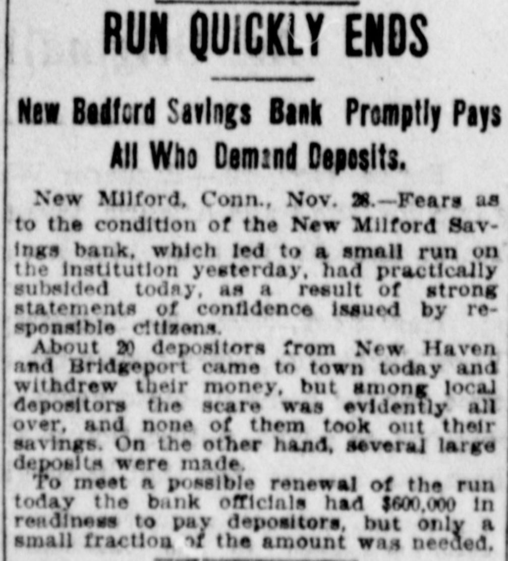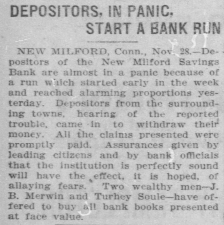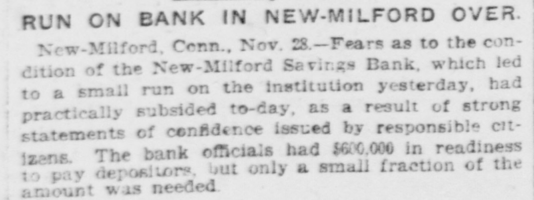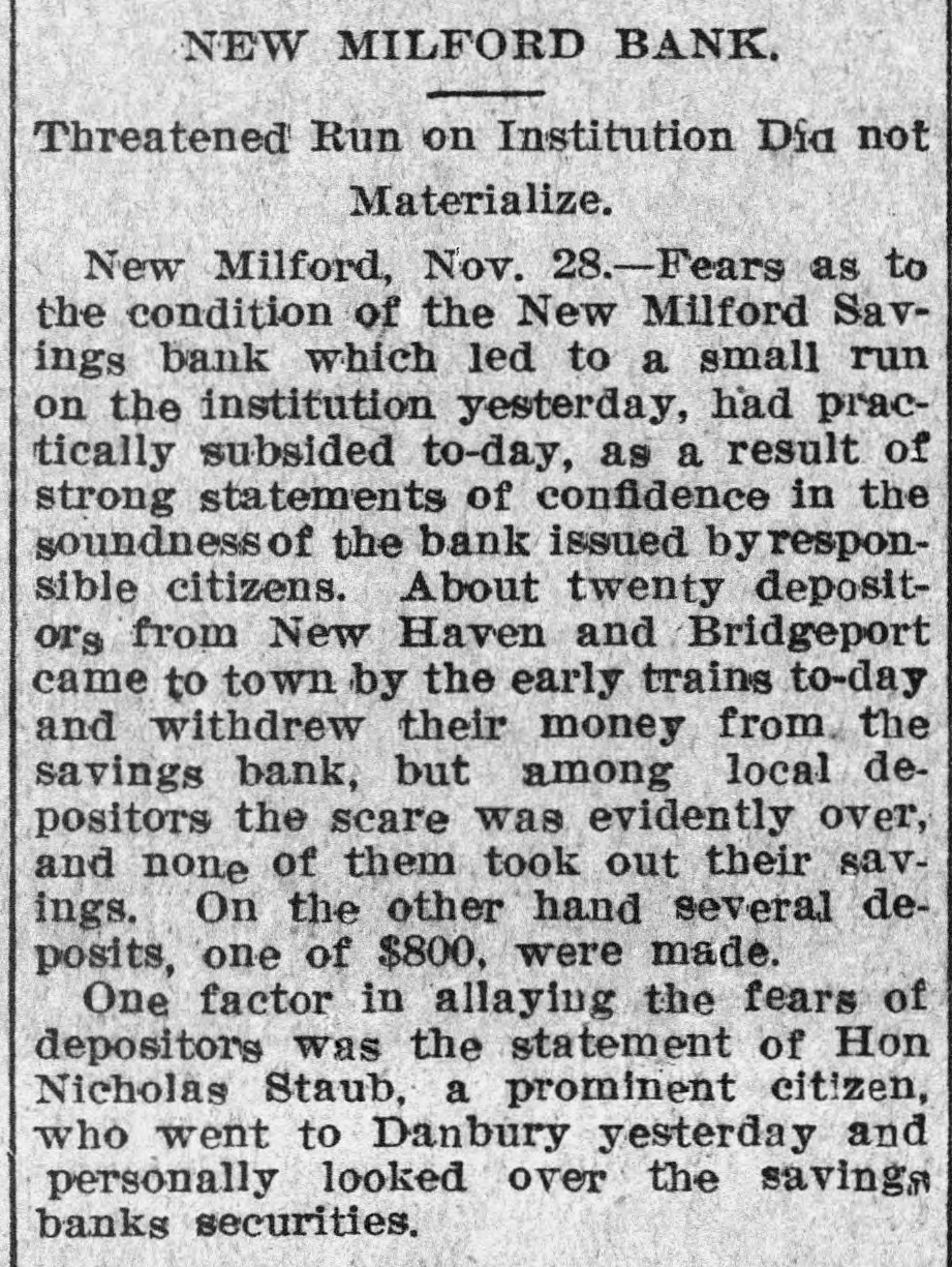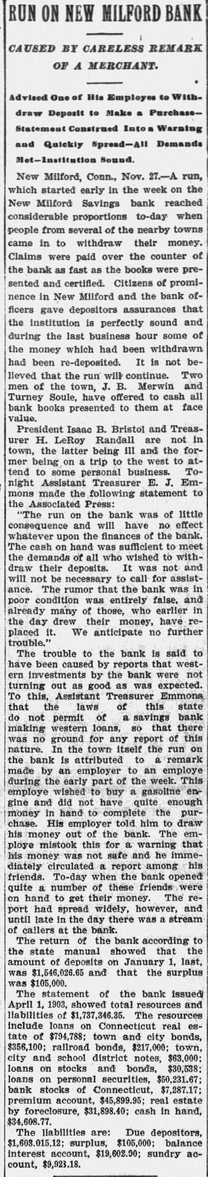 RUN ON NEW MILFORD BANK CAUSED BY CARELESS REMARK OF A MERCHANT. Advised One of His Employes to Withdraw Deposit to Make a PurchaseStatement Construed Into a Warning and Quickly Spread-All Demands Met-Institution Sound. New Milford, Conn., Nov. 27.-A run, which started early in the week on the New Milford Savings bank reached considerable proportions to-day when people from several of the nearby towns came in to withdraw their money. Claims were paid over the counter of the bank as fast as the books were presented and certified. Citizens of prominence in New Milford and the bank officers gave depositors assurances that the institution is perfectly sound and during the last business hour some of the money which had been withdrawn had been re-deposited. It is not believed that the run will continue. Two men of the town, J. B. Merwin and Turney Soule, have offered to cash all bank books presented to them at face value. President Isaac B. Bristol and TreasRandall are in latter ill town, urer H. the LeRoy being and the not former being on a trip to the west to attend to some personal business. Tonight Assistant Treasurer E. J. Emmons made the following statement to the Associated Press: "The run on the bank was of little and will have no effect the finances of whatever consequence upon the to bank. meet The cash on hand was sufficient all who It was draw the demands their deposits. of wished not to assist- with- and will not be necessary to call for ance. The rumor that the bank was in poor condition was entirely false, and already many of those, who earlier in the day drew their money, have replaced it. We anticipate no further trouble." The trouble to the bank is said to have been caused by reports that western investments by the bank were not turning out as good as was expected. To this, Assistant Treasurer Emmons that the laws of this state do not permit of a savings bank making western loans, so that there ground for any report of this the town on nature. was no In itself the remark run the bank is attributed to a made by an employer to an employe during the early part of the week. This employe wished to buy a gasoline engine and did not have quite enough money in hand to complete the purchase. His employer told him to draw his out of the bank. The emthis for a ploye money mistook and warning he imme- that his money was not safe diately circulated a report among his friends. To-day when the bank opened quite a number of these friends were on hand to get their money. The report had spread widely, however, and until late in the day there was a stream of callers at the bank. The return of the bank according to the state manual showed that the amount of deposits on January 1, last, was $1,546,026.65 and that the surplus was $105,000. The statement of the bank issued showed total resources liabilities April 1, 1903, of $1,737,346.35. The resources and include loans on Connecticut real estate of $794,788; town and city bonds, $356,100; railroad bonds, $217,000; town, city and school district notes, $63,000; loans on stocks and bonds, $30,538; loans on personal securities, $50,231.67; bank stocks of Connecticut, $7,287.17; premium account, $45,899.95; real estate by foreclosure, $31,898.40; cash in hand, $34,608.77. The liabilities are: Due depositors, $1,603,015.12; surplus, $105,000; balance interest account, $19,602.90; sundry account, $9,923.18.