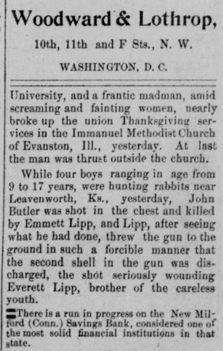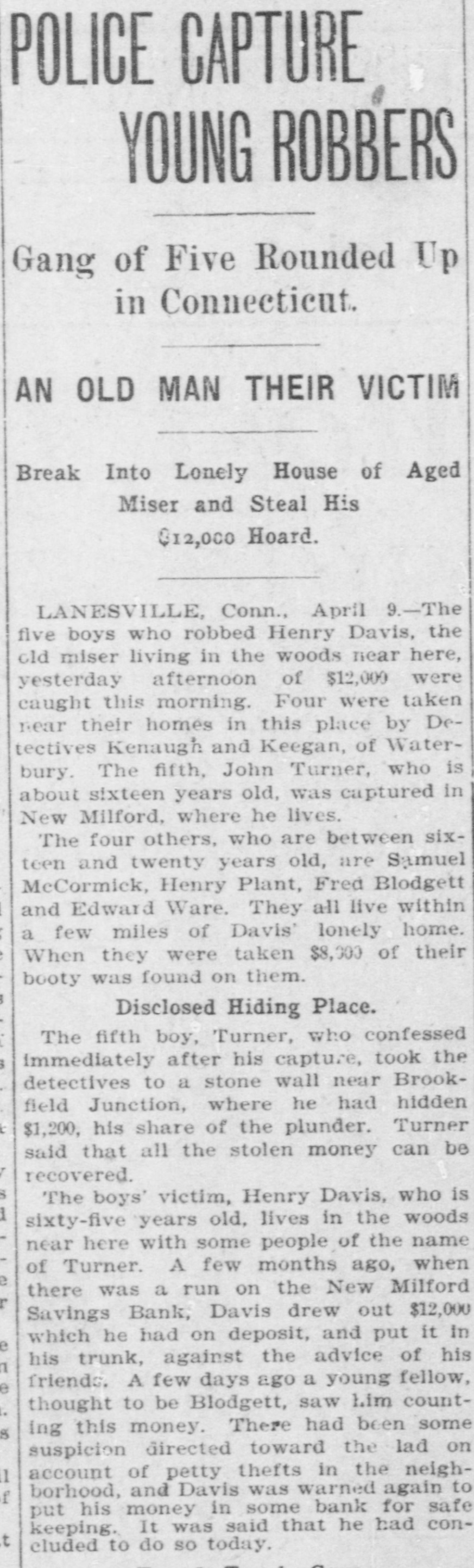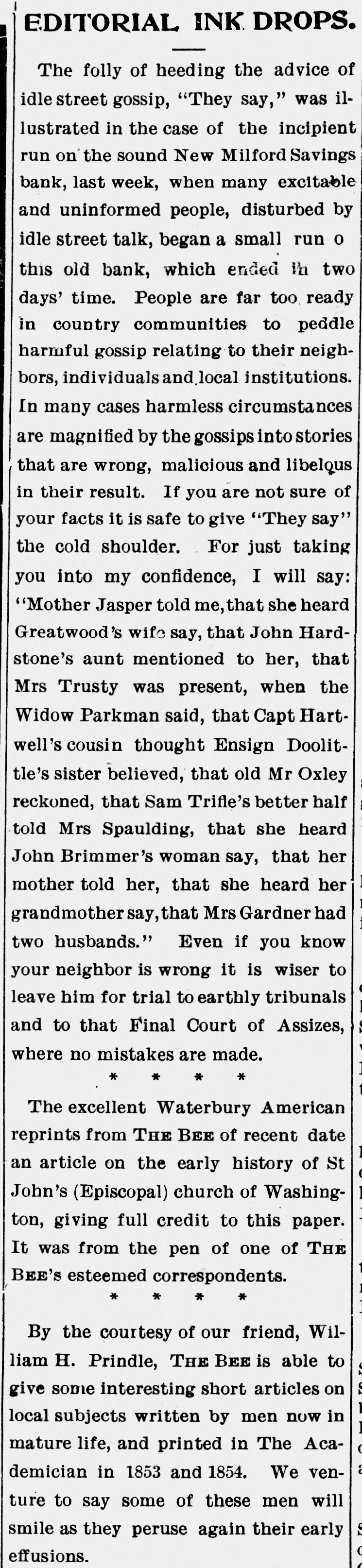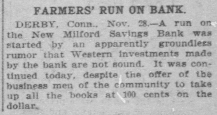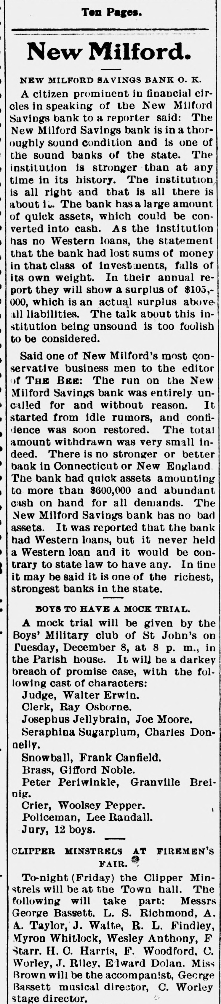 RUN ON NEW MILFORD BANK CAUSED BY CARELESS REMARK OF A MERCHANT. Advised One of His Employes to Withdraw Deposit to Make a PurchaseStatement Construed Into a Warning and Quickly Spread-All Demands Met-Institution Sound. New Milford, Conn., Nov. 27.-A run, which started early in the week on the New Milford Savings bank reached considerable proportions to-day when people from several of the nearby towns came in to withdraw their money. Claims were paid over the counter of the bank as fast as the books were presented and certified. Citizens of prominence in New Milford and the bank officers gave depositors assurances that the institution is perfectly sound and during the last business hour some of the money which had been withdrawn had been re-deposited. It is not believed that the run will continue. Two men of the town, J. B. Merwin and Turney Soule, have offered to cash all bank books presented to them at face value. President Isaac B. Bristol and TreasRandall are in latter ill town, urer H. the LeRoy being and the not former being on a trip to the west to attend to some personal business. Tonight Assistant Treasurer E. J. Emmons made the following statement to the Associated Press: "The run on the bank was of little and will have no effect the finances of whatever consequence upon the to bank. meet The cash on hand was sufficient all who It was draw the demands their deposits. of wished not to assist- with- and will not be necessary to call for ance. The rumor that the bank was in poor condition was entirely false, and already many of those, who earlier in the day drew their money, have replaced it. We anticipate no further trouble." The trouble to the bank is said to have been caused by reports that western investments by the bank were not turning out as good as was expected. To this, Assistant Treasurer Emmons that the laws of this state do not permit of a savings bank making western loans, so that there ground for any report of this the town on nature. was no In itself the remark run the bank is attributed to a made by an employer to an employe during the early part of the week. This employe wished to buy a gasoline engine and did not have quite enough money in hand to complete the purchase. His employer told him to draw his out of the bank. The emthis for a ploye money mistook and warning he imme- that his money was not safe diately circulated a report among his friends. To-day when the bank opened quite a number of these friends were on hand to get their money. The report had spread widely, however, and until late in the day there was a stream of callers at the bank. The return of the bank according to the state manual showed that the amount of deposits on January 1, last, was $1,546,026.65 and that the surplus was $105,000. The statement of the bank issued showed total resources liabilities April 1, 1903, of $1,737,346.35. The resources and include loans on Connecticut real estate of $794,788; town and city bonds, $356,100; railroad bonds, $217,000; town, city and school district notes, $63,000; loans on stocks and bonds, $30,538; loans on personal securities, $50,231.67; bank stocks of Connecticut, $7,287.17; premium account, $45,899.95; real estate by foreclosure, $31,898.40; cash in hand, $34,608.77. The liabilities are: Due depositors, $1,603,015.12; surplus, $105,000; balance interest account, $19,602.90; sundry account, $9,923.18.
