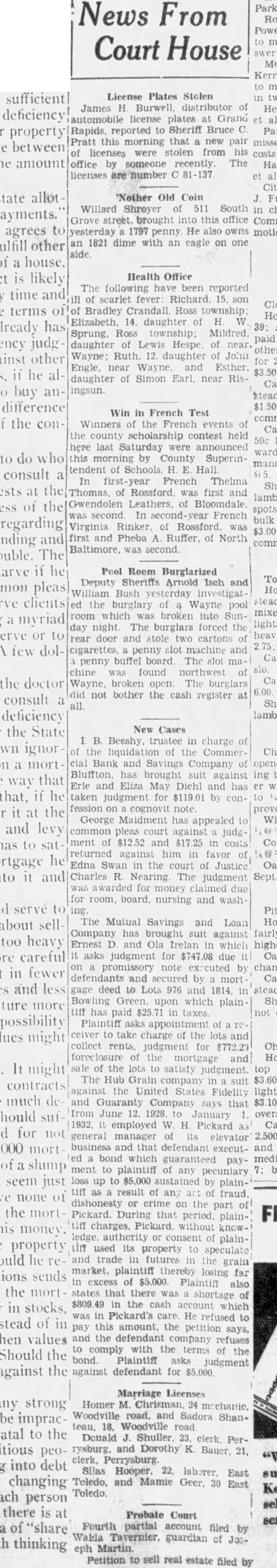 News From Court House License Plates Stolen James H. Burwell, distributor of automobile license plates at Grand Rapids, reported to Sheriff Bruce C Pratt this morning that a new pair of licenses were stolen from his costs office by someone recently The licenses are number C "Nother Old Coin Willard Shroyer of 511 South yesterday 1797 penny He also owns an 1821 dime with an eagle on one side Health Office The following have been reported ill of scarlet fever: Richard 15. son of Bradley Crandall. Ross township: Elizabeth. 14. daughter of H W daughter of Lewis Hespe. of near. Wayne: Ruth. 12. daughter of John Engle. near Wayne and Esther. daughter of Simon Earl. near Risingsun. Win in French Test Winners of the French events of the county scholarship contest held here last Saturday were announced this morning by County Superintendent of Schools, H E. Hall. In French Thelma Thomas, of Rossford, was first and Gwendolen Leathers, of Bloomdale was second. In second-year French Virginia Rinker, of Rossford, was first and Pheba A. Ruffer. of North Baltimore, was second. Pool Room Burglarized Deputy Sheriffs Arnold Isch and William Bush yesterday investigated the burglary of a Wayne pool room which was broken into Sunday night. The burglars forced the rear door and stole two cartons of cigarettes, penny slot machine and penny buffel board The slot machine was found northwest of Wayne. broken open The burglars did not bother the cash register at New Cases I. B Beeshy, trustee in charge of of the liquidation of the Commercial Bank and Savings Company of Bluffton. has brought suit against Erle and Eliza May Diehl and has taken judgment for $119.01 by confession on cognovit note. proved George Maidment has appealed to common pleas court against judgment of $12.52 and $17.25 in costs returned against him in favor of Edna Swan in the court of Justice Charles R. Nearing The judgment was awarded for money claimed due for room, board, nursing and washing The Mutual Savings and Loan Company has brought suit against Ernest D and Ola Irelan in which higher. it asks judgment for $747.08 due it on a promissory note exccuted by defendants and secured by mort gage deed to Lots 976 and 1814. in steady Bowling Green, upon which plain tiff has paid $25.71 in taxes. Plaintiff asks appointment of a ceiver to take charge of the lots and collect rents, judgment for $772.23 foreclosure of the mortgage and sale of the lots to satisfy judgment The Hub Grain company suit from June 12. 1928 January overs 3,000 ed a bond which guaranteed payment to plaintiff of any 7: pecuniary loss up to $5,000 sustained by plaintiff as result of any act of fraud, dishonesty or crime on the part of Pickard. During that period. plaintiff charges, Pickard, without knowledge, authority or consent of plaintiff used its property to speculate and trade in futures in the grain market, plaintiff thereby losing far in excess of $5,000 Plaintiff also $809 in the cash account which was in Pickard's care He refused to pay this amount, the petition says, refuses to comply with the terms of the Plaintiff asks judgment for Marriage Licenses Homer M. Chrisman, 24 mschanic, Woodville road, and Sadora Shanteau, 18. Woodville road Donald J. Shuller 23. clerk. Perclerk, Perrysburg. Silas Hooper, East 30 East Toledo. Probate Court Fourth partial account filed by Tavernier, guardian of JosPetition to sell real estate filed by