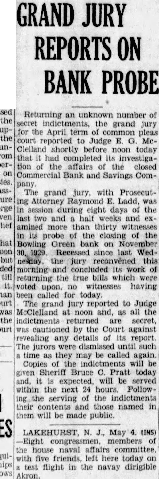 GRAND JURY REPORTS BANK PROBE Returning unknown number of indictments, the grand jury the April term common court reported Judge Clelland shortly before today had completed its investigation of the affairs the closed Commercial Bank and Savings Company. The grand jury, with ProsecutRaymond Ladd, was eight days the last two and weeks and amined than thirty its probe the closing of the Bowling Green bank on since last Wedthe jury this morning and its work returning the true bills which were upon, witnesses having called for today. The grand jury reported to Judge McClelland noon and, all the indictments cautioned by the Court against revealing details of its report. The jurors were until such time they may be called again. Copies of indictments will be given Sheriff Bruce Pratt today expected, will be served within the next hours. Followthe serving the indictments contents and those named them will be made public. May congressmen, house naval five left here today test flight in the navay dirigible Akron.