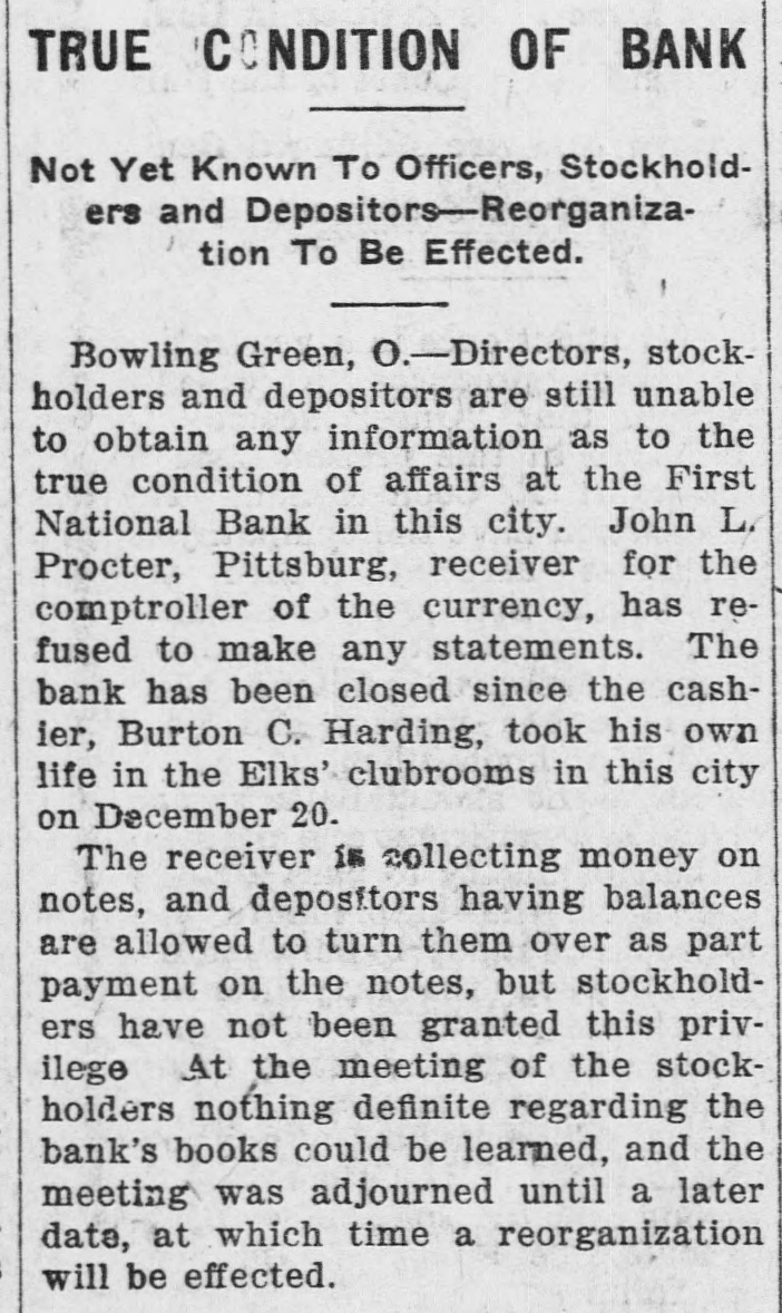 TRUE CONDITION OF BANK Not Yet Known To Officers, Stockholders and Depositors-Reorganization To Be Effected. Bowling Green, O.-Directors, stockholders and depositors are still unable to obtain any information as to the true condition of affairs at the First National Bank in this city. John L. Procter, Pittsburg, receiver for the comptroller of the currency, has refused to make any statements. The bank has been closed since the cashier, Burton C. Harding, took his own life in the Elks' clubrooms in this city on December 20. The receiver is collecting money on notes, and depositors having balances are allowed to turn them over as part payment on the notes, but stockholders have not been granted this privilege At the meeting of the stockholders nothing definite regarding the bank's books could be learned, and the meeting was adjourned until a later date, at which time a reorganization will be effected.