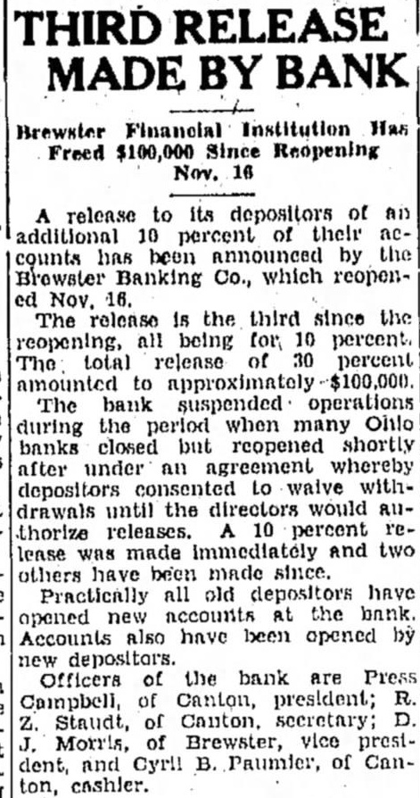 RELEASE MADE BY Brewster Financial Institution Has Freed $100,000 Since Reopening Nov. 16 release to its depositors of an additional 10 percent of their nccounts been by the Browster Banking Co., which reopenNov. The release is the third since the reopening, all being for percent. The total release of 30 percent amounted to The bank suspended operations during the period when many banks closed but reopened shortly after under an agreement whereby consented waive withdepositors drawals until the directors would allthorize releases. 10 percent lease made immediately And two others have been made since. Practically all old depositors have new accounts the bank. opened Accounts also have been opened by new depositors. Officers the bank are Press Campbell, of Canton, president; Staudt, of secretary; Morris, of Brewster, vice prestdent, and B. Paumier, of Canton, cashier.