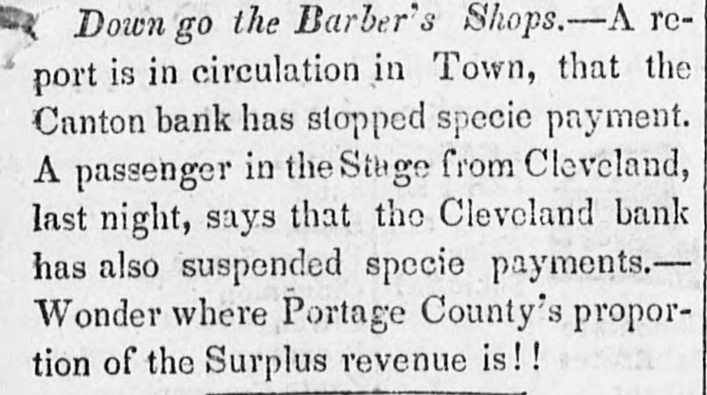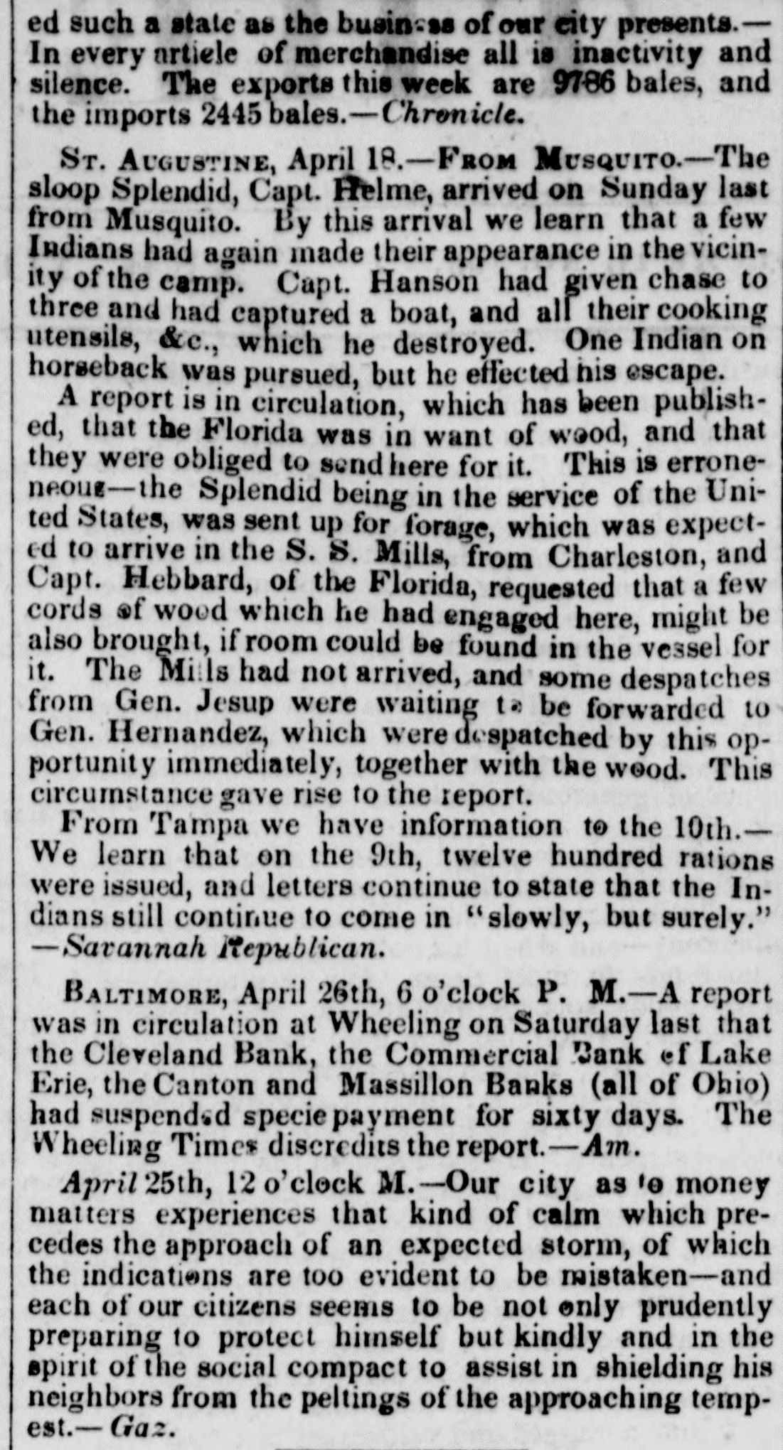ed such a state as the business of our city presents.In every artiele of merchandise all is inactivity and silence. The exports this week are 9786 bales, and the imports 2445 bales.-Chronicle. ST. AUGUSTINE, April 18.-FROM MUSQUITO.-The sloop Splendid, Capt. Helme, arrived on Sunday last from Musquito. By this arrival we learn that a few Indians had again made their appearance in the vicinity of the camp. Capt. Hanson had given chase to three and had captured a boat, and all their cooking utensils, &c., which he destroyed. One Indian on horseback was pursued, but he effected his escape. A report is in circulation, which has been published, that the Florida was in want of wood, and that they were obliged to send here for it. This is erroneneoug-the Splendid being in the service of the United States, was sent up for forage, which was expected to arrive in the S. S. Mills, from Charleston, and Capt. Hebbard, of the Florida, requested that a few cords of wood which he had engaged here, might be also brought, if room could be found in the vessel for it. The Mills had not arrived, and some despatches from Gen. Jesup were waiting to be forwarded to Gen. Hernandez, which were despatched by this opportunity immediately, together with the wood. This circumstance gave rise to the report. From Tampa we have information to the 10th.We learn that on the 9th, twelve hundred rations were issued, and letters continue to state that the Indians still continue to come in "slowly, but surely." -Sarannah Republican. BALTIMORE, April 26th, o'clock P. M.- report was in circulation at Wheeling on Saturday last that the Cleveland Bank, the Commercial Bank of Lake Erie, the Canton and Massillon Banks (all of Ohio) had suspendsd specie payment for sixty days. The Wheeling Times discredits the report.-Am. April 25th, 12 o'clock M. -Our city as to money matters experiences that kind of calm which precedes the approach of an expected storm, of which the indications are too evident to be mistaken-and each of our citizens seems to be not only prudently preparing to protect himself but kindly and in the spirit of the social compact to assist in shielding his neighbors from the peltings of the approaching tempest.- Gaz.
