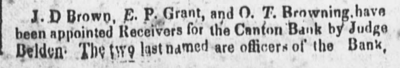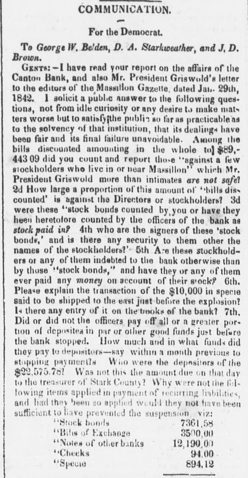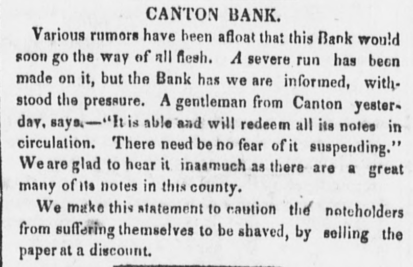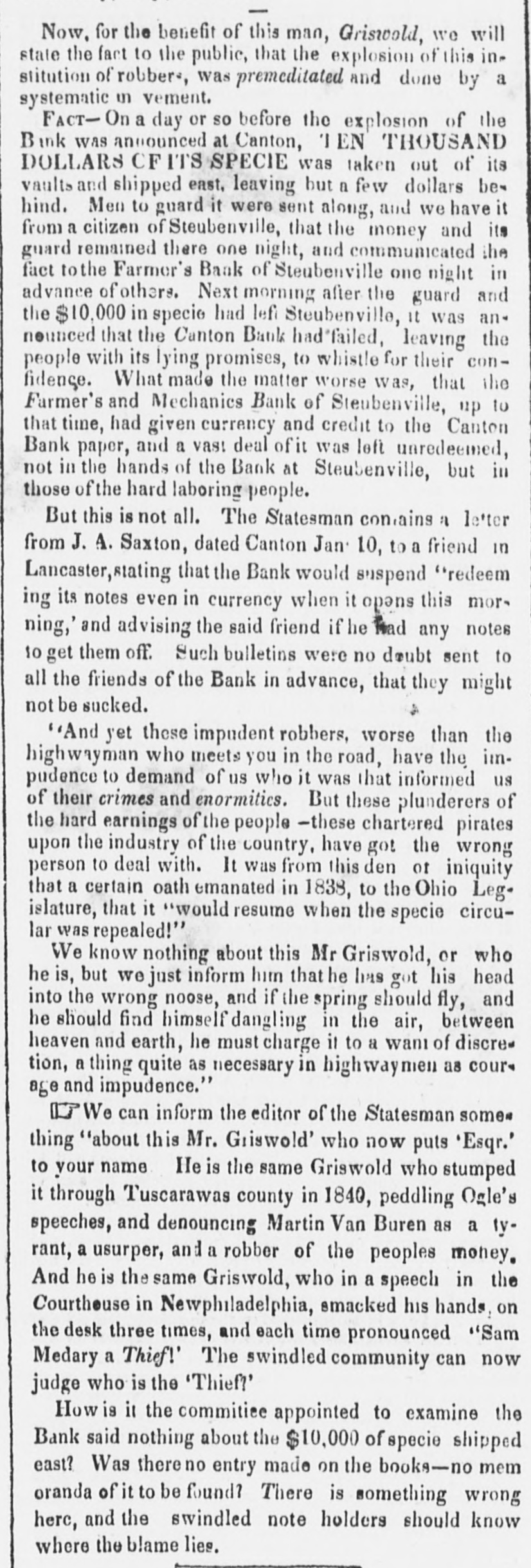 Now, for the benefit of this man, Griswold, we will state the fact to the public, that the explosion of this in. stitution of robber was premeditated and done by a systematic in vement. FACT- On a day or so before the explosion of the Bank was announced at Canton, TEN THOUSAND DOLLARS CF ITS SPECIE was taken out of its vaults and shipped east, leaving but a few dollars behind. Men to guard it were sent along, and we have it from a citizen of Steubenville, that the money and its guard remained there one night, and communicated the fact to the Farmer's Bank of Steubenville one night in advance of others. Next morning after the guard and the $10,000 in specie had left Steubenville, it was announced that the Canton Bank had failed, leaving the people with its lying promises, to whistle for their confidence. What made the matter worse was, that the Farmer's and Mechanics Bank of Steubenville, up to that time, had given currency and credit to the Canton Bank paper, and a vas! deal of it was left unredeemed, not in the hands of the Bank at Steubenville, but in those of the hard laboring people. But this is not all. The Statesman contains a letter from J. A. Saxton, dated Canton Jan 10, to a friend in Lancaster,stating that the Bank would suspend "redeem ing its notes even in currency when it opens this morning,' and advising the said friend if he had any notes to get them off. Such bulletins were no doubt sent to all the friends of the Bank in advance, that they might not be sucked. "And yet these impudent robbers, worse than the highwayman who meets you in the road, have the impudence to demand of us who it was that informed us of their crimes and enormities. But these plunderers of the hard earnings of the people -these chartered pirates upon the industry of the country, have got the wrong person to deal with. It was from this den of iniquity that a certain oath emanated in 1838, to the Ohio Legislature, that it "would resume when the specie circular was repealed!" We know nothing about this Mr Griswold, or who he is, but we just inform him that he has got his head into the wrong noose, and if the spring should fly, and he should find himself dangling in the air, between heaven and earth, he must charge it to a want of discre tion, a thing quite as necessary in highwaymen as cours age and impudence." DJ We can inform the editor of the Statesman some. thing "about this Mr. Griswold' who now puts 'Esqr.' to your name He is the same Griswold who stumped it through Tuscarawas county in 1840, peddling Ogle's speeches, and denouncing Martin Van Buren as a lyrant, a usurper, and a robber of the peoples money. And he is the same Griswold, who in a speech in the Courthouse in Newphiladelphia, smacked his hands, on the desk three times, and each time pronounced "Sam Medary a Thief!' The swindled community can now judge who is the 'Thief!' How is it the commitiee appointed to examine the Bank said nothing about the $10,000 of specie shipped east? Was there no entry made on the books-no mem oranda of it to be found? There is something wrong here, and the swindled note holders should know where the blame lies.