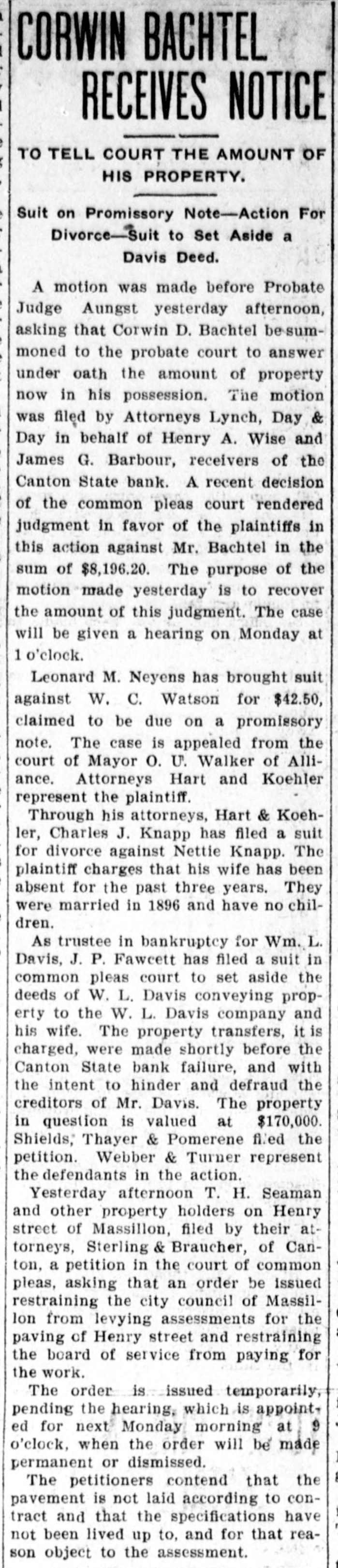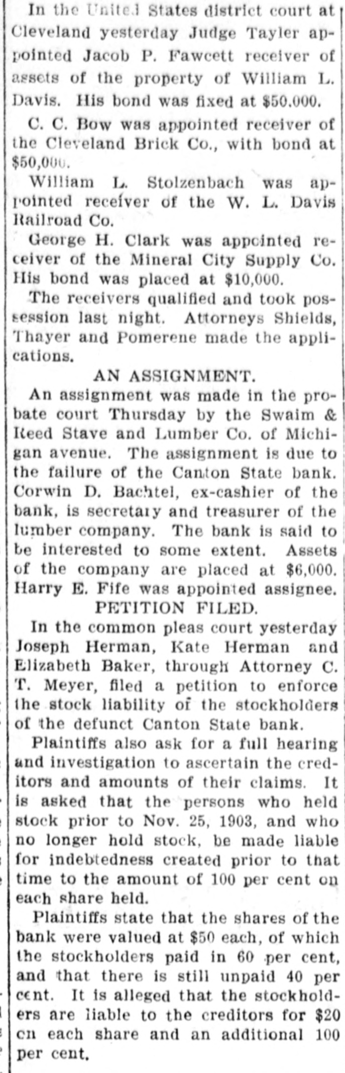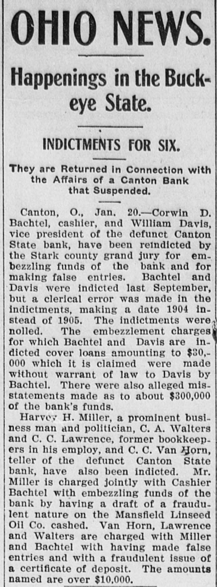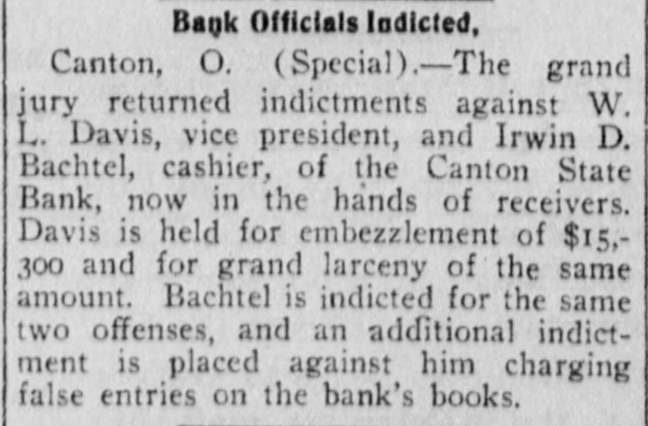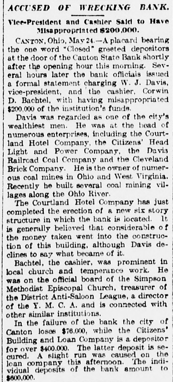 ACCUSED OF WRECKING BANK. Vice-President and Cashier Said to Have Misappropriated $200,000. CANTON, Ohio, May 24.-A placard bearing the one word "Closed" greeted depositors at the door of the Canton State Bank shortly after the opening hour this morning. Several hours later the bank officials issued a formal statement charging W. J. Davis, vice-president, and the cashier, Corwin D. Bachtel, with having misappropriated $200,000 of the institution's funds. Davis was regarded as one of the city's wealthiest men. He was at the head of numerous enterprises, including the Courtland Hotel Company, the Citizens' Head Light and Power Company, the Davis Railroad Coal Company and the Cleveland Brick Company. He is the owner of numerous coal mines in Ohio and West Virginia. Recently he built several coal mining villages along the Ohio River. The Courtland Hotel Company has just completed the erection of a new six story structure in which the bank is located. It is generally believed that considerable of the money taken went into the construction of this building, although Davis declines to say what became of it. Bachtel, the cashier, was prominent in local church and temperance work. He was on the official board of the Simpson Methodist Episcopal Church, treasurer of the District Anti-Saloon League, a director of the Y. M. C. A. and is connected with other similar institutions. In the failure of the bank the city of Canton loses $76,000, while the Citizens' Building and Loan Company is a depositor for over $400,000. The latter deposit is secured. A slight run was caused on the loan company this afternoon. The individual deposits of the bank amount to $600,000.
