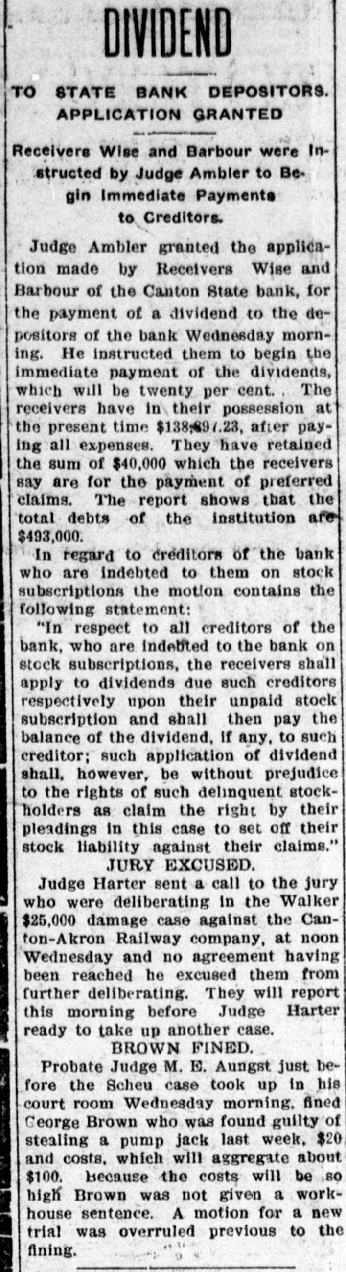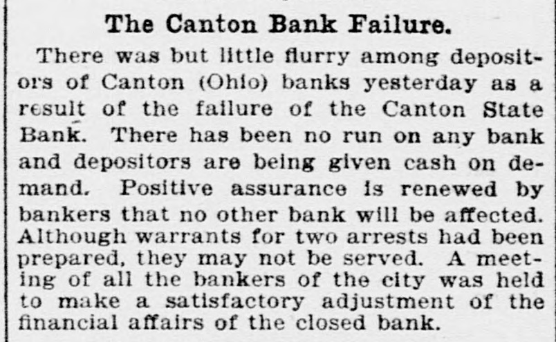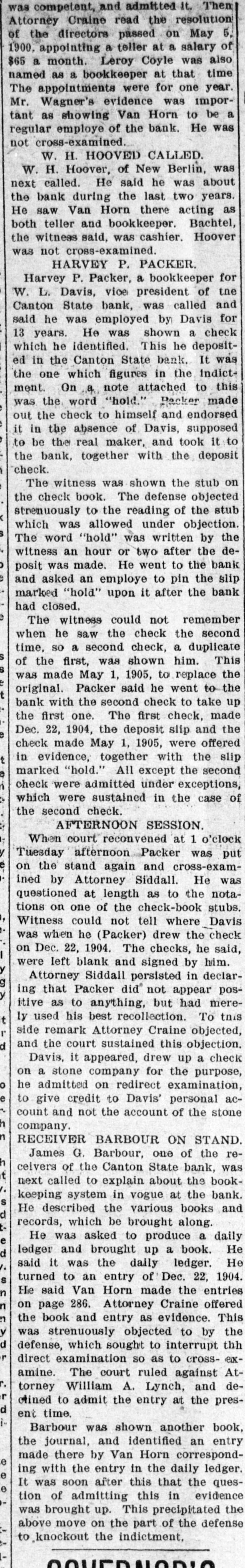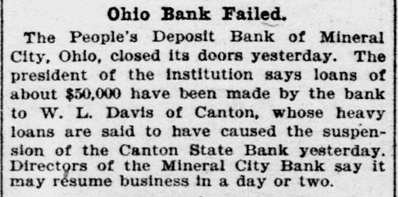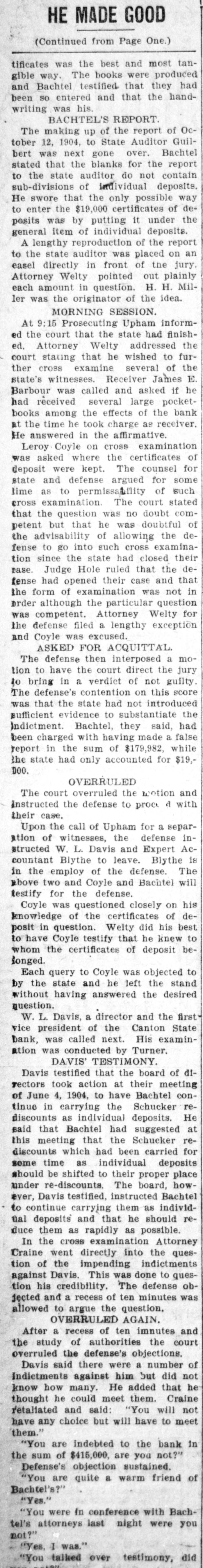 ACCUSED OF WRECKING BANK. Vice-President and Cashier Said to Have Misappropriated $200,000. CANTON, Ohio, May 24.-A placard bearing the one word "Closed" greeted depositors at the door of the Canton State Bank shortly after the opening hour this morning. Several hours later the bank officials issued a formal statement charging W. J. Davis, vice-president, and the cashier, Corwin D. Bachtel, with having misappropriated $200,000 of the institution's funds. Davis was regarded as one of the city's wealthiest men. He was at the head of numerous enterprises, including the Courtland Hotel Company, the Citizens' Head Light and Power Company, the Davis Railroad Coal Company and the Cleveland Brick Company. He is the owner of numerous coal mines in Ohio and West Virginia. Recently he built several coal mining villages along the Ohio River. The Courtland Hotel Company has just completed the erection of a new six story structure in which the bank is located. It is generally believed that considerable of the money taken went into the construction of this building, although Davis declines to say what became of it. Bachtel, the cashier, was prominent in local church and temperance work. He was on the official board of the Simpson Methodist Episcopal Church, treasurer of the District Anti-Saloon League, a director of the Y. M. C. A. and is connected with other similar institutions. In the failure of the bank the city of Canton loses $76,000, while the Citizens' Building and Loan Company is a depositor for over $400,000. The latter deposit is secured. A slight run was caused on the loan company this afternoon. The individual deposits of the bank amount to $600,000.