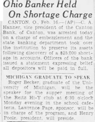 Ohio Banker Held On Shortage Charge CANTON of the Canton Bank, of was arrested today charge embezzlement and the state banking department took over the to preserve assets following discovery shortage in Officers of the bank all depositors will be paid in full. MICHIGAN GRADU ATE TO Roger Becker graduate the versity of Michigan will be the speaker for the supper meeting of the 6:30 o'clock Monday the cafeteria. Page sponsor be in charge of the program. and Henry Poole will