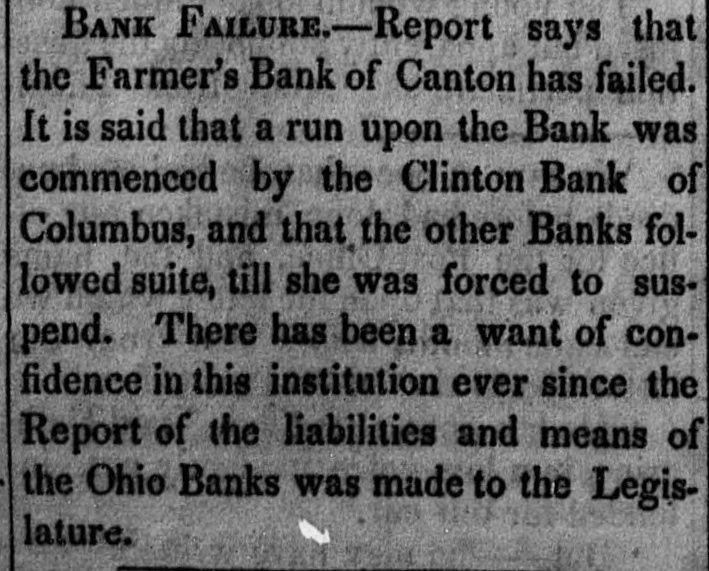 From the Elyria Republican. # BANK INSOLENCE. Among other questions propounded to the Farmers' Bank of Canton, in obedience to resolution of the legislature, were the two following, to which the two following iven: What were the causes that led you to suspend specie payment? Answer, by the Bank. The operation of the specie circular, and general embarrassment of the country. Q. At what period do you expect to resume? Ans; We will resume when the specie circular is repealed, and not before. We will now give the true answer to the first question, and we will take it from a report made by that same insolent institution. The prominent reason why that infamous institution suspended specie payments, may be learned from the fact that it had, as appears by said report, over three hundred and sixiy thousand dollars of its bilis in circulation, at the time of its suspension, and but fifteen thousand four hundred and fiftysseven dollars in specie to redeem its notes with; and that had made loans to its directors and stock-holders to the amount of nary-on thousand dollars, Yet the cashier of that insolent, swindling institution, has the impudence and capidity to answer under oath, that "the operation the specie circular," &c., is the true canse way that institution suspended specie payments. It is a matter well worthy of the consideration of the Legislature whether the cashier, 'nhs answer has not been guilty of perjury. Is there a candid man of any party, that for one moment cab beleive the cashier has assigned the true cause why that bank suspended? It promises to resume when "the specie circular is repeated." But has it come to this, that a bank will require certain laws to be passed or repealed before it will redeem its bills? This is the language of the Canton bank, to a question put by direction of the legislature of this state, Were we to give our opinion upon the time of a resumption of specie payments by the Farmers Bank of Canton, it would be that it never would take place, The last report made by that bank, a short time since, shows the circulation to be $248,608.00, its loans to stockholders to be $99 475,00, aud its specie on hand buta trifle over $19,000. This sad state of things, the cashier on oath! states bas resulted fron "the operation of the specie circular!" A man that could make such a statement as that under oath, may do well enough for a bank officer, but we have our opinion as to his moral fitness for anyhonorable or honest ods cupation. # LAKE NAVIGATION There is every indication that the navigation of Lake Erie will be resumed in a very short time. A storm from the south west has driven the detached portions of ice, which are rapidly decaying into the Niagara river, down which they are descending in large masses. The waters of the Lake are already perceptible beyond Sturgeon Point, about twelve miles from this city. If any of our steamboats were in readiness, it is the general opinion, on the wharves, that a postage could be effected to Detroit. [Buff Jour., March 24.. # BEWARE OF FRAUD. Bills of the Farmers' and Merchants' Bank of St. Joseph's at Centerville, are probably worthless, The Detroit Free Press of March 12th gives a letter from Thomas Fitzgerald, one of the Bank Commissioners' who sontes that the Bank "is an illegal, if not a fraudelent concern." He's circulation at shout $20,000, a portion of which, we have reason to believe is in this vicinity and will be offered.-[New Yorker. # MORE FRAUDS. The Cincinna i Gazette cautions the public against receiving $5 bills, purporting to he of be of the Farmer's Bank of Canton, just put in circulation. The vignette of the counterfeit is a wagon and horses; the genuine is two females in sitting posture; the counterfeits are also larger than the genuine of Letter C dated 10th May, 1837. The notes were engraved for Farmer's Bank in Houston, Texas; but have been so altered as to read Farmers' Bank of Canton, Ohio.' [Herald & Gazelle The Cleveland Advertiser of March 27, announces on the authority of the Detroit Pross, the capture of Gen. Southerland and his Aid. They are to be taken to Toronto and tried for high treason. The Detroit Free Press says Gen. Southerland and Aid, Capt Spencer, were taken prisoners on Sunday afternoon Inst by Mr. Price, postmaster at Sandwich. It is expected that he will have an immediate trial at Malden, by a Court Martial. The History of Navy Island and the Canadian War of '38 is likely to be lost to the world. # STOCKS IN NEW YORK. The New York Commercial of Saturday says: The sales at the stock Exchange to-day were large in amount almost beyond precedent. Over fifteen hundred shares of United States Bank Stock were sold at an advance of about one per cent from yesterdayed mostly, it is said. hougtition