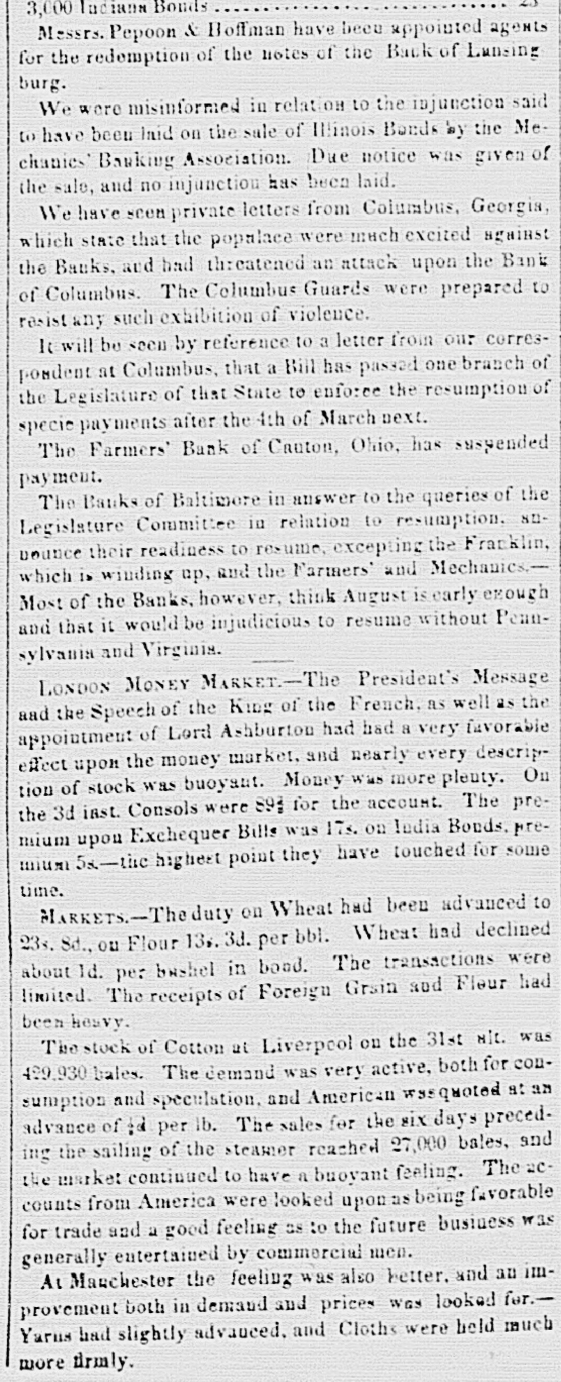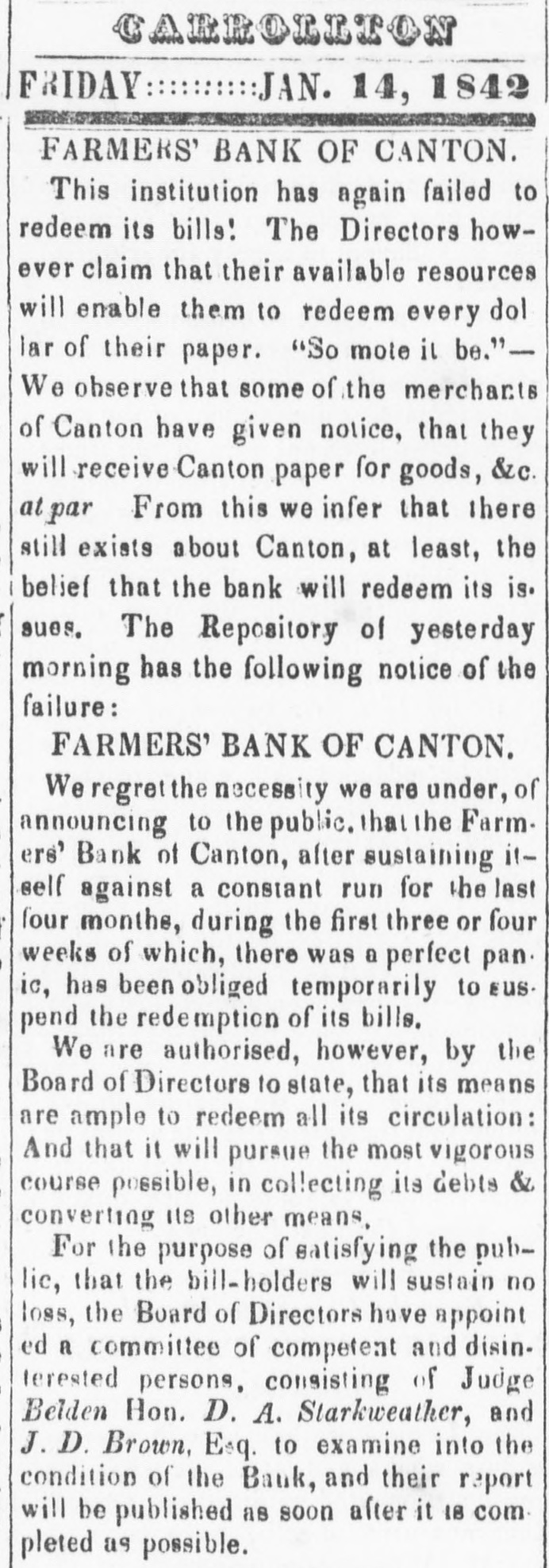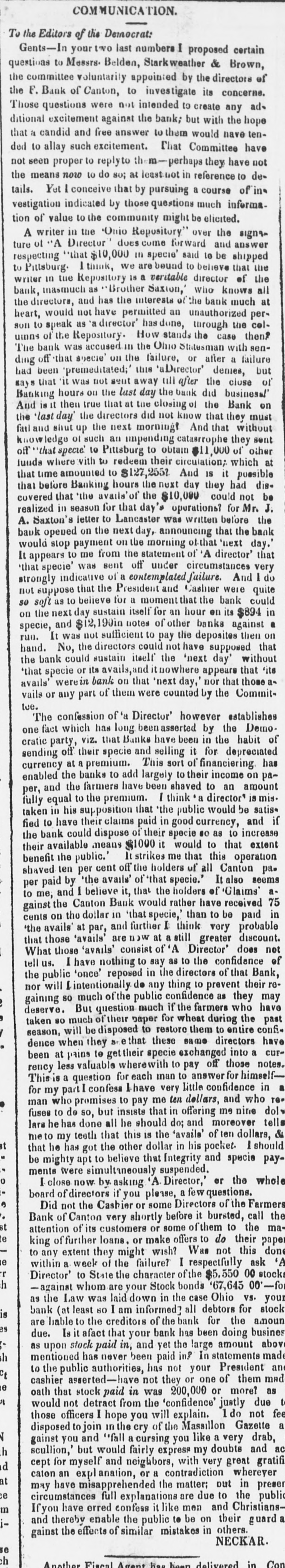 COMMUNICATION. To the Editors your of the two Democrat: last numbers I proposed Brown, certain Gents-In Messrs. Belden, Stark weather & directors of questions to voluntarily appointed by the concerns. the committee of Canton, to investigate its the F. were not intended to create any Those Bank questions the hope ad. excitement against the bank; but with have tenditional candid and free answer to them would have that a such excitement. That Committee have not ded to allay to replyto them-perhaps reference they to denot seen proper now to do 80; at least not in of in the means Yet I conceive that by pursuing a course informatails. indicated by those questions much elicited. vestigation value to the community might be the tion of in the Onio Repository." over and answer sign A writer Director does come ward shipped ture respecting of ..A "that $10,000 we 111 are specie' bound said to believe to be that the the to Pittsburg. Repository 1 tink 18 a veritable director knows of all writer in the Brother Saxion," who much at bank, masmuch and as has the interests of the bank perthe directors, not have permitted an unauthorized celheart, would 'a director' has done, through the then son to speak Repository- as How stands the case with senuinns of the accused in the Ohio Statesman bank was specie on the failure. or a ding off this had The that 'premeditated;' 'aDirector' after after the denies, close failure but of been was not gent away till business! mays that it on the last day the bank did Bank on Banking hours true that at the closing of the must And is it the directors did not know the last the next morningf And that faul and shut of up such an impending catasrrophe of day' then that they they without other sent knowledge specie" to Pittsburg to obtain $11,000 which at off "that where with to redeem their circulation; it possible funds amounted to $127,255? And IS time hours the next day the avails of the $10,000 covered that that before that Banking they could for had not Mr. dis- be J. season for that day' operations? before the realized in letter to Lancaster was written the bank A. Saxton's on the next day, announcing that bauk payment on the morning of-that would stop to me from the statement of 'A It appears sent off under I do opened was circumstances director' 'next And day. very that that specie' indicative of a contemplated failure. quite strongly that the President and Cashier bank were could not suppose believe for a moment that the so soft as to sustain itself for an hour en its the notes of other on next and day $12,190in banks against $894 then on in a specie, not sufficient to pay the deposites that the directors could not have run. It No, was supposed without hand. could sustain itself the 'next day' 'its the bank or its avails, and it nowhere appears that those 'that specie werein bank on that 'next day, nor that aavails' vails or any part of them were counted by the Committoe. confession of 'a Director' however establishes DemoThe which has long been asserted by the habit of one fact party, viz. that Banks have been in the depreciated cratic off their specie and selling it for has at a premium. This sort of on the banks to add largely to their the farmers have been shaved to an sending currency enabled and financiering director' income amount is mis. paper, equal to the premium. I think a satis. fully in his supposition that the public would be if taken their claims paid in good currency, and fied could dispose of their specie so as to means $1000 it would to the bank to available have that increase extent their the public.' It strikes me that this operation benefit ten per cent off the holders of all Canton pa= shaved 'the avails' of 'that specie. It also seems aper I believe it, that the holders of to me, Canton Bank would rather have 75 in gainst paid the and by 'Glaims' received paid dollar in 'that specie, than to be cents at and further I think very 'avails' are now at a still greater that 'the avails those on the par, does probable discount. net those 'avails' consist of 'A Director' of What I have nothing to say as to the confidence tell public us. 'once' reposed in the directors of that Bank, the will intentionally de any thing to prevent their renor so much of the public confidence as they may gaining But question much if the farmers who have deserve. of their paper for wheat during the past be disposed to restore them to taken season, so will much directors entire confi- have dence when they Sr. that these same been at pains to their specie exchanged into a curless valuable wherewith to pay off those himself- notes. rency a for each man to answer for a confess I have very little This for my is part question dollars, confidence and who in , who promises to pay me ten re= man de but insists that in offering me nine dol lara has done all he should do; and moreover fuses he to so, dollars, tells & to my teeth that this is the 'avails' of ten t that me he has got the other dollar in his pocket. I should be mighty apt to believe that Integrity and specie payments were simultaneously suspended. o I close now by asking 'A Director," or the whole board of directors if you please, a few questions. , Did not the Cashier or some Directors of the Farmers Bank of Canton very shortly before it bursted, call the t attention of its customers or some of them to the ma e king of further loans. or make offers to do their paper to any extent they might wish? Was not this don e within a week of the failure? I respectfully ask 'A r Director' to State the character of the $5,550 00 stocks h -against whom are your Stock bonds 67,645 00'-for was laid down in the case Ohio vs. your least 60 I am informed? all s as bank the (at Law debtors for the for amoun stock are liable to the creditors of the bank $ due. Is it afact that your bank has busines as stock in, and yet the large amount h upon paid been In statements doing above made mentioned has never been paid in? to the has not your an t