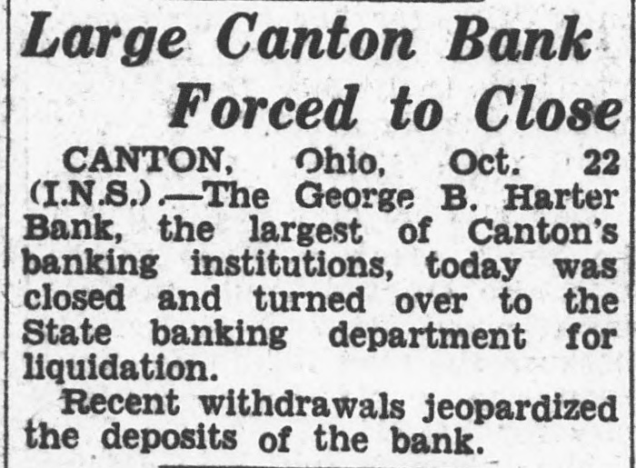 Large Canton Bank Forced to Close CANTON, Ohio, Oct. 22 (I.N.S.).The George B. Harter Bank, the largest of Canton's banking institutions, today was closed and turned over to the State banking department for liquidation. Recent withdrawals jeopardized the deposits of the bank.