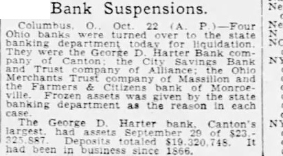 Bank Suspensions. banks turned to George Harter Bank and Frozen bank Monroewas the banking department as the reason in each The George Harter bank. Canton's assets had been in since