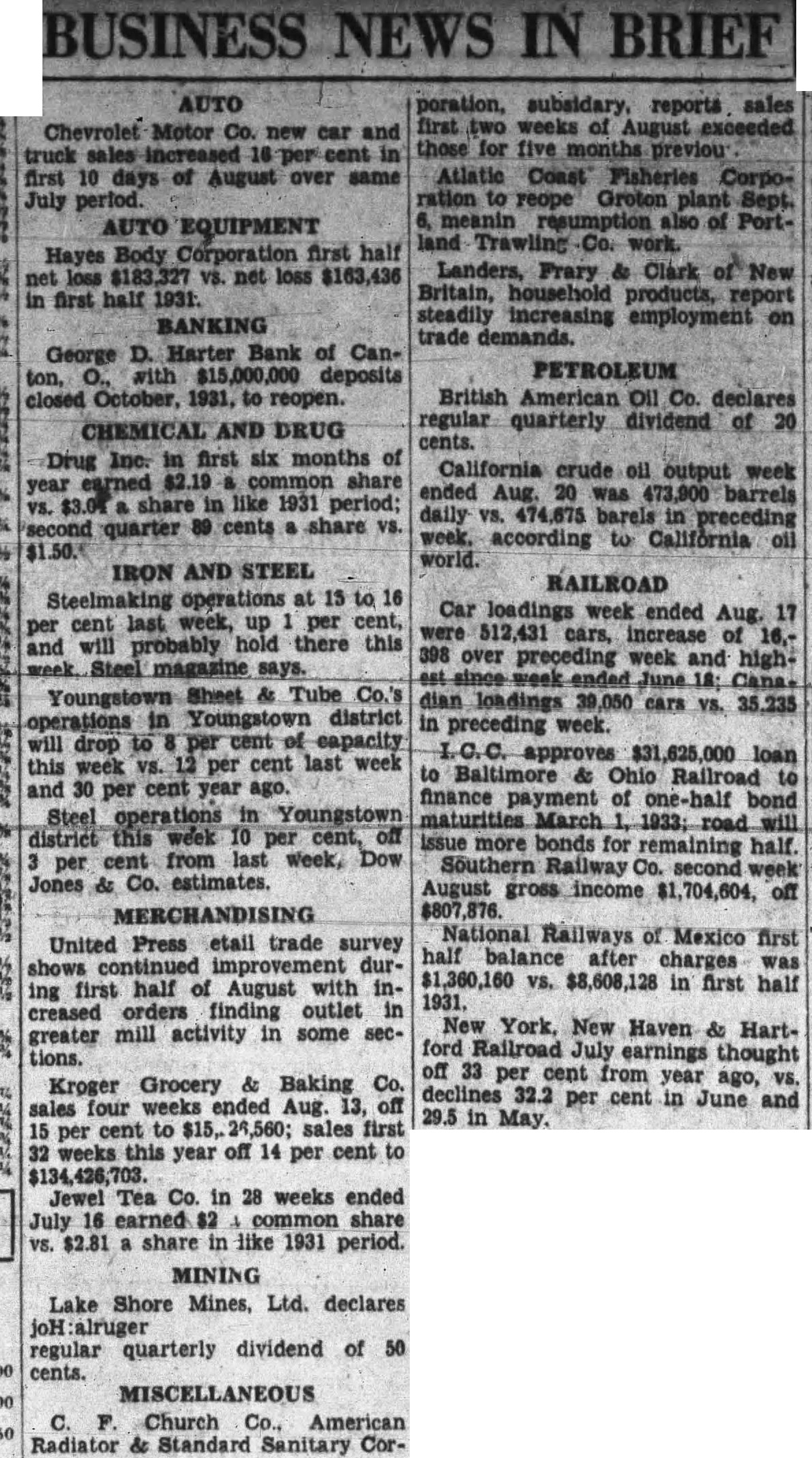 BUSINESS NEWS IN BRIEF AUTO Chevrolet Motor Co. new car and truck sales 16 per cent in first 10 days of August over same July AUTO EQUIPMENT Hayes Body Corporation first half net loss $183,327 vs. net loss $163,436 in first half 1931. BANKING George D. Harter Bank of Canton, with $15,000,000 deposits closed October, 1931, to reopen. CHEMICAL AND DRUG Drug Inc. in first six months of $2.19 common share year vs. $3.04 share in like 1931 period; second quarter 89 cents a share vs. IRON AND STEEL Steelmaking operations at 13 to 16 per cent last week, up per cent, and will probably hold there this week. Steel magazine says. Youngstown Sheet & Tube Co.'s operations in Youngstown district will drop to 8 per cent of capacity this week vs. 12 per cent last week and 30 per cent year ago. Steel operations in Youngstown district this week 10 per cent, off per cent from last week, Dow Jones & Co. estimates. MERCHANDISING United Press etail trade survey shows continued improvement during first half of August with increased orders finding outlet in greater mill activity in some sections. Kroger Grocery & Baking Co. sales four weeks ended Aug. 13, off 15 per cent to $15, 25,560; sales first 32 weeks this year off 14 per cent to $134,426,703. Jewel Tea Co. in 28 weeks ended July 16 earned $2 common share vs. $2.81 share in like 1931 period. MINING Lake Shore Mines, Ltd. declares joH alruger regular quarterly dividend of 50 cents. MISCELLANEOUS C. F. Church Co., American Radiator & Standard Sanitary Cor- first weeks of those for five months previou Atlatic Coast Fisheries Corporation to reope Groton plant Sept. meanin also of Portland Trawling Co. work. Landers, Frary & Clark of New Britain, household products, report steadily increasing employment on trade demands. PETROLEUM British American Oil Co. declares regular quarterly dividend of 20 cents. California crude oil output week ended Aug. 20 was 473,900 barrels daily vs. 474,675 barels in preceding week. according to California oil world. RAILROAD Car loadings week ended Aug. 17 were 512,431 cars, increase of 16,398 over preceding week and highest. since week ended June 18: Cana. dian loadings 39,050 cars vs. 35.235 in preceding week. I.C.C. approves $31,625,000 loan to Baltimore & Ohio Railroad to finance payment of one-half bond maturities March 1. 1933; road will issue more bonds for remaining half. Southern Railway Co. second week August gross income $1,704,604, off $807 National Railways of Mexico first half balance after charges was $1,360,160 vs. $8,608,128 in first half 1931. New York, New Haven & Hartford Railroad July earnings thought off 33 per cent from year ago, vs. declines 32.2 per cent in June and 29.5 in May.
