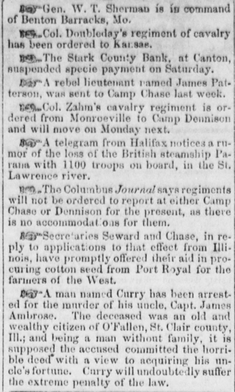 BOY Gen. W. T. Sherman is in command of Benton Barracks, Mo. RES Col. Doubleday's regiment of cavalry has been ordered to Kar.sas. The Stark County Bank, at Canton, suspended specie payment on Saturday. par A rebel lieutenant named James Patterson, was sent to Camp Chase last week. new Col. Zahm's cavalry regiment is ordered from Monroeville to Camp Dennison and will move on Monday next. Bay A telegram from Halifax notices a mor of the loss of the British steamship Parana with 1100 troops on board, in the St. Lawrence river. nen The Columbus Journal says regiments will not be ordered to report at either Camp Chase or Dennison for the present, as there is no accommodations for them. BEY Secretaries Seward and Chase, in reply to applications to that effect from Illinois, have promptly offered their aid in procuring cotton seed from Port Royal for the farmers of the West. DGT-A man named Curry has been arrested for the murder of his uncle, Capt. James Ambrose. The deceased was an old and wealthy citizen of O'Fallen, St. Clair county, Ill.; and being a man without family, it is supposed the accused committed the horrible deed with a view to acquiring his uncle's fortune. Curry will undoubtedly suffer the extreme penalty of the law.