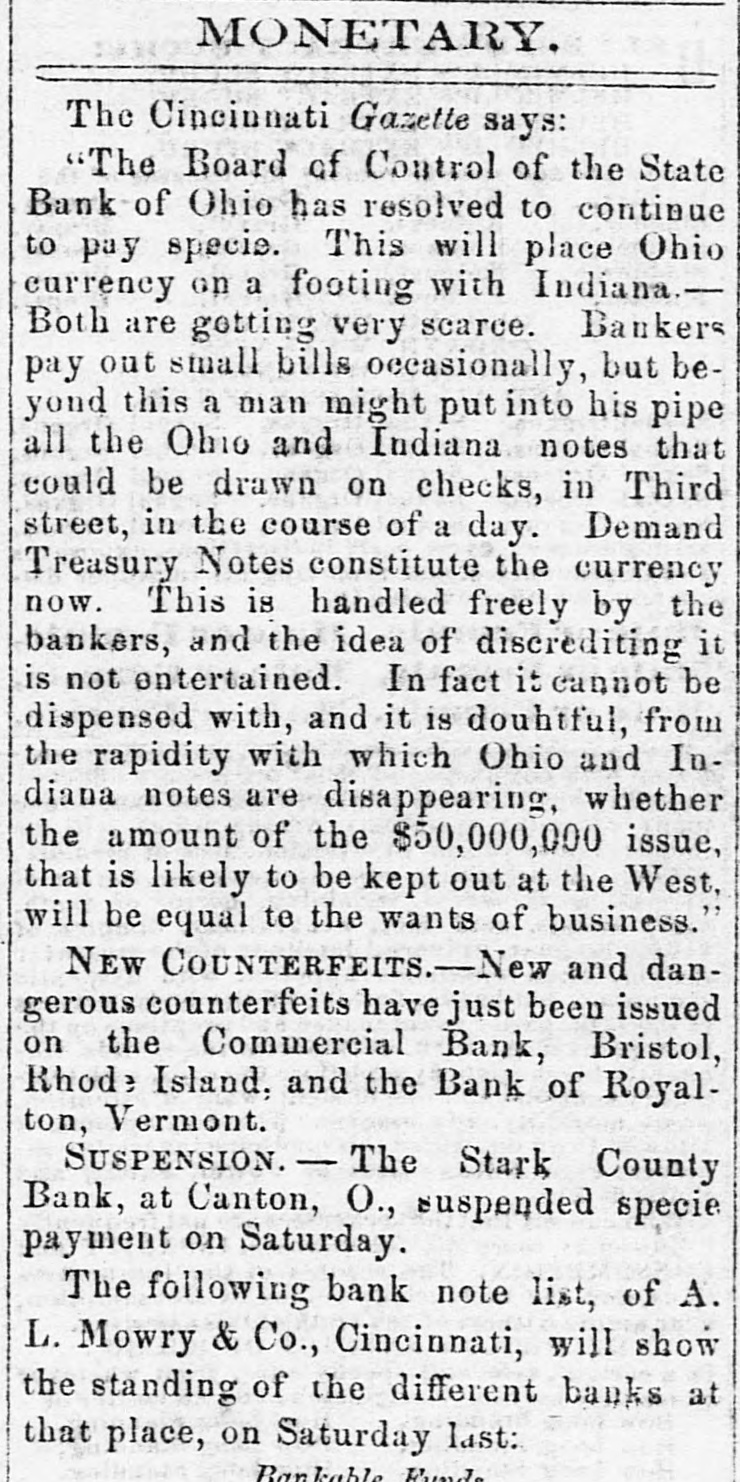 MONETARY. The Cincinnati Gazette says: "The Board of Control of the State Bank of Ohio has resolved to continue to pay specie. This will place Ohio currency on a footing with Indiana.Both are getting very scarce. Bankers pay out small bills occasionally, but beyoud this a man might put into his pipe all the Ohio and Indiana notes that could be drawn on checks, in Third street, in the course of a day. Demand Treasury Notes constitute the currency now. This is handled freely by the bankers, and the idea of discrediting it is not entertained. In fact it cannot be dispensed with, and it is douhtful, from the rapidity with which Ohio and Indiana notes are disappearing, whether the amount of the $50,000,000 issue, that is likely to be kept out at the West, will be equal te the wants of business." NEW COUNTERFEITS.-New and dangerous counterfeits have just been issued on the Commercial Bank, Bristol, Rhode Island, and the Bank of Royalton, Vermont. SUSPENSION. - The Stark County Bank, at Canton, O., suspended specie payment on Saturday. The following bank note list, of A. L. Mowry & Co., Cincinnati, will show the standing of the different banks at that place, on Saturday last: Bankable Funda