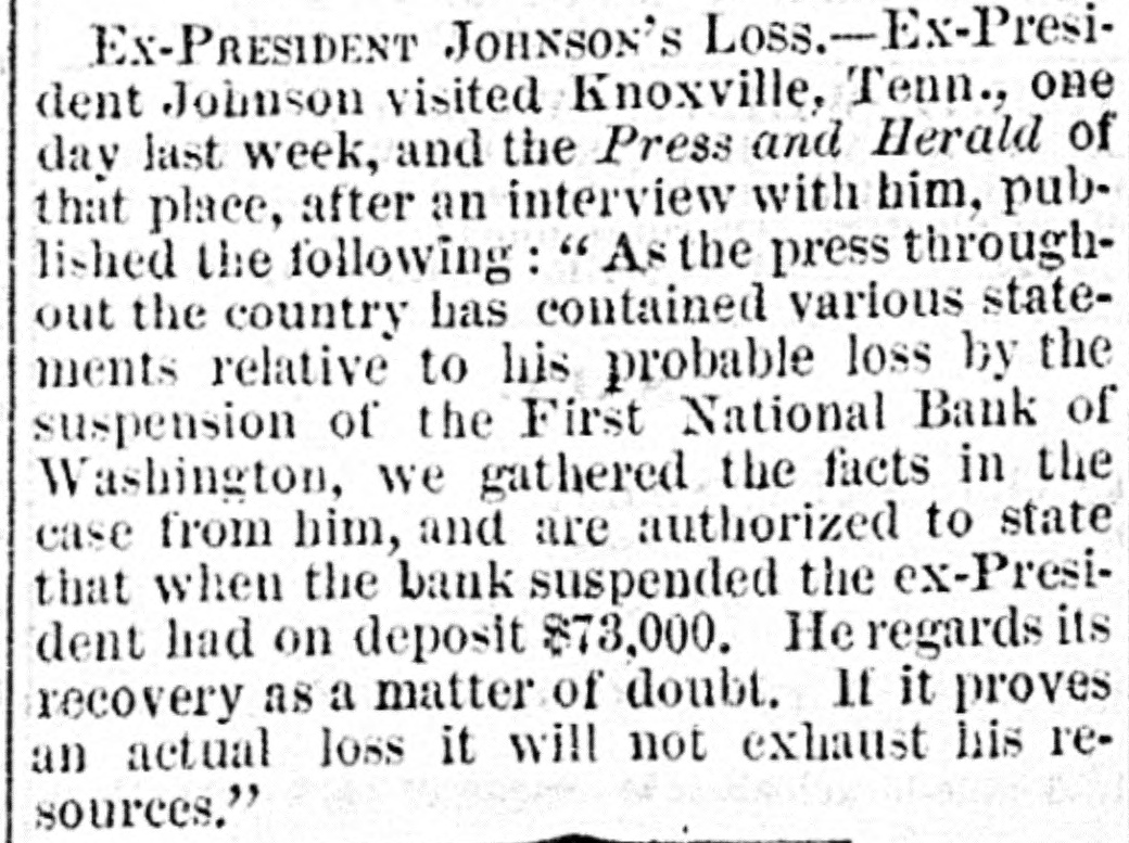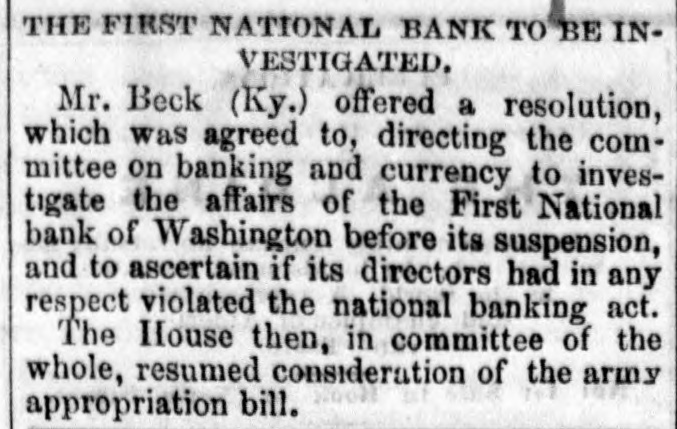 of others, for that institution was more or less complicated by the banking business of Jay Cooke & Co., and the Pacific railroad bonds, with which they are heavily loaded. The other banks of this city invested mostly within this District or in government securities, and are not involved in outside operations. Mr. Davis then stated their deposits to-day had about balanced that of the withdrawals made, and he antictpated no run on their house. Should it come they are abundantly able and ready to meet all demands. He thought depositors would return their money with Mr. Ruff in a few days again, as he could see no cause for alarm. He expressed his belief that the Freedmen's Savings Bank would not suffer much inconvenience, as they had plenty of currency to meet demands. ACTION OF GOV. SHEPHERD. At an early hour to-day Gov. Shepherd, with commendable forethought, anticipating, perhaps, that some of the banks might be run, and cramped for currency. called upon Secretary Richardson and made an arrangement both with him and Treasurer Spinner, to the effect that any bank of the District depositing at the sub-Treasury in New York, and that fact being telegrap hed to Treasurer Spinner, could procure all the currency desired, direct from the Treasury here. This will enable any bank to convert by telegraph any collateral securities they may hold into currency, and furnish abundant means to meet any emergency. AN ADDITIONAL NOTICE. At half-past one o'clock the following was placarded on the doors of the First National bank: Paper maturing this day in the hands of the First National bank may be found at the Metropolitan bank, (next door.") INTERVIEW WITH MR. TENNEY. At two o'clock, THE STAR reporter was admitted to the banking house of Jay Cooke & Co., and was received by Mr. Tenney, when the following conversation ensued: Reporter.-"Mr. Tenney, THE STAR is anxions to inform the public of the latest news concerning the unfortunate suspension of the banks you represent?" Mr. Tenney.-"You may state that all the clerical force of the office is busily engaged in preparing a statement for the public, and that it will be submitted to them as soon as practicable. You may also state that the firm expect in a few days to open their doors and resume business." THE EXCITEMENT OVER. At o'clock 15th street was virtually deserted, and did not present as animated an appearance as usual. There seems to be a growing contidence that all is well, and that the business of the bank will resume at an early period. The run on the Freedmen's Bank, however, continues to some extent, but hourly grows more languid. FIRM AS A ROCK. At half-past two o'clock the reporter of THE STAR called upon Mr. Stickney, of the Freedman's Savings bank. The rush at that hour still continued. He was informed that the bank would keep open until its usual honr-4 p. m.and that up to that hour he (Mr. S.) did not think that thirty thousand dollars would have been drawn. This is owing to the small individual deposits carried by the bank. There 18 a general feeling that the run will subside tomorrow, although the officers are preparing for any contingency. A RECEIVER APPOINTED At half-1 last two o'clock, Edwin L. Stanton, Secretary of the District of Columbia, called upon Controller Knox and accepted the position as receiver of the First National Bank. He will take charge at once.