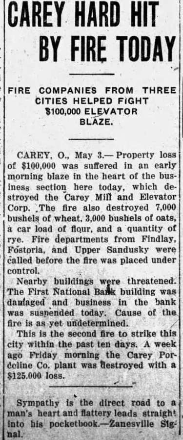 CAREY HARD HIT BY FIRE TODAY FIRE COMPANIES FROM THREE CITIES HELPED FIGHT $100,000 ELEVATOR BLAZE. CAREY. O., May Property loss of $100,000 was suffered in an early morning blaze in the heart of the business section here today, which destroyed the Carey Mill and Elevator Corp. The fire also destroyed 7,000 bushels of wheat. 3,000 bushels of oats, car load of flour, and quantity of rye. Fire departments from Findlay, Fostoria, and Upper Sandusky were called before the fire was placed under control. Nearby buildings were threatened. The First National Bank building was damaged and business in the bank was suspended today. Cause of the fire is undetermined. This is the second fire to strike this city within the past ten days. A week ago Friday morning the Carey Pordeline Co. plant was destroyed with loss. Sympathy the direct road to man's flattery leads straight into his