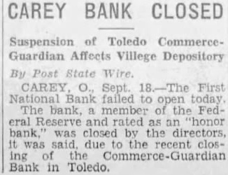 CAREY BANK CLOSED Suspension of Toledo CommerceGuardian Affects Villege Depository By Post State CAREY O., 18.-The First National Bank failed bank, member the FedReserve and rated bank,' closed by the directors, said, due the recent closCommerce-Guardian Bank in Toledo.