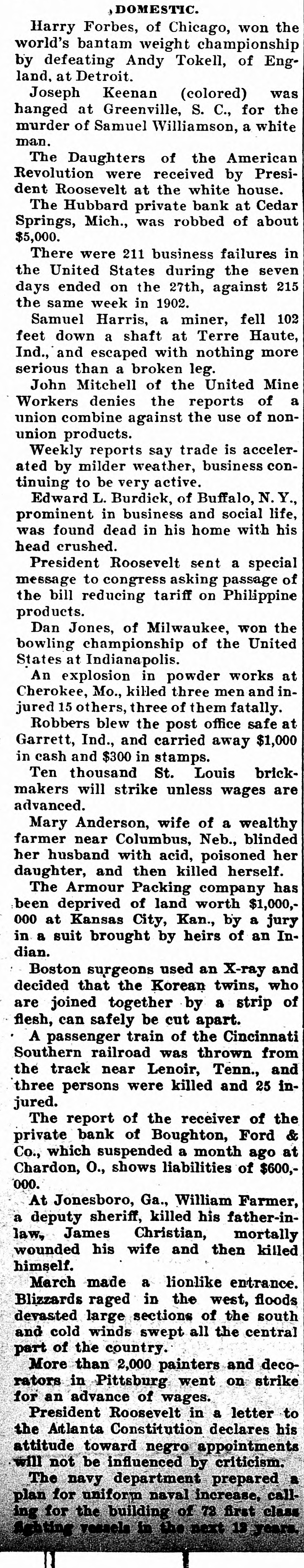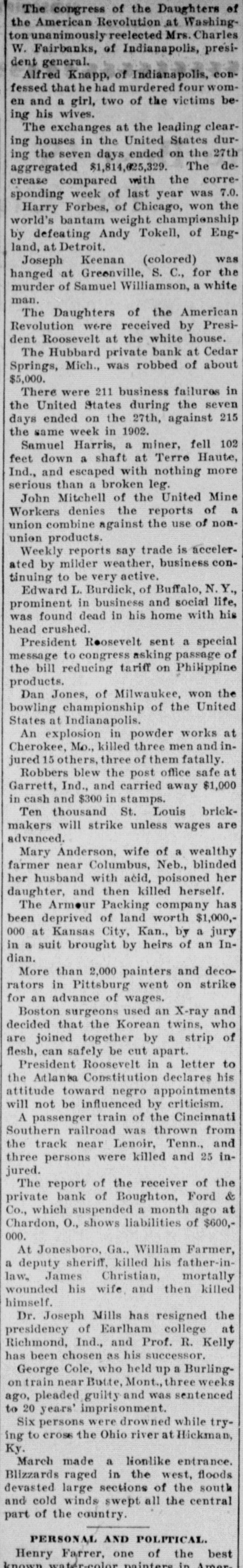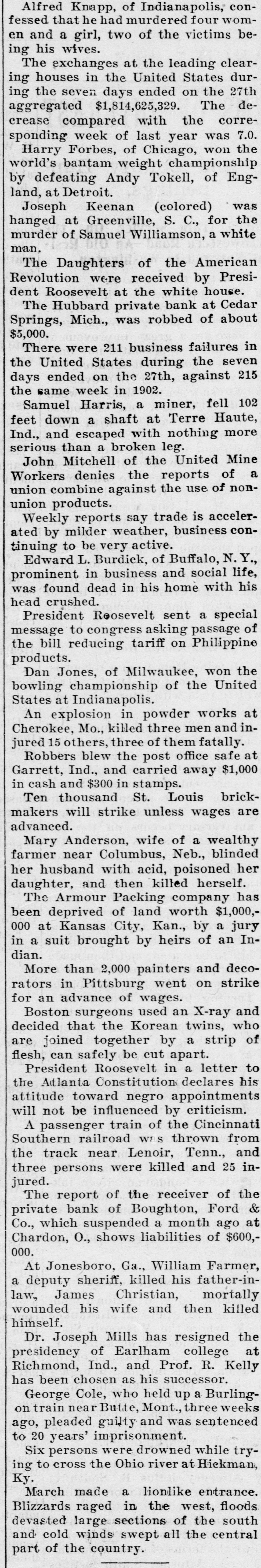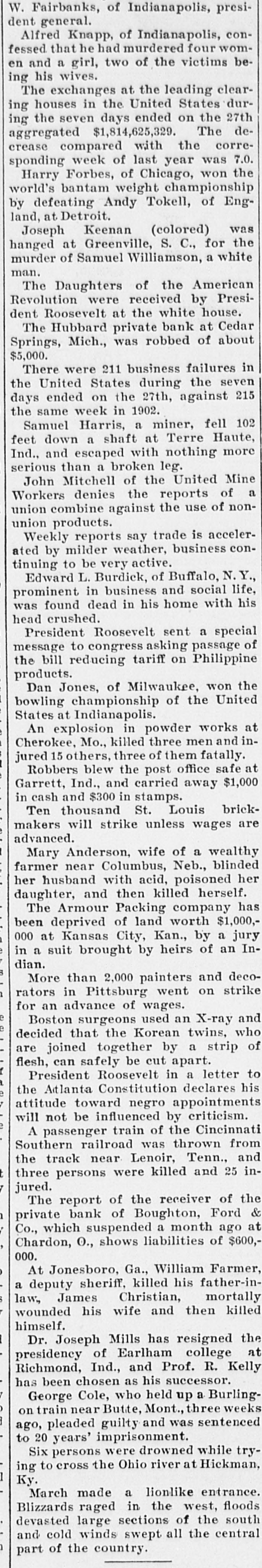 fessed that he had murdered four women and a girl, two of the victims being his wives. The exchanges at the leading clearing houses in the United States during the seven days ended on the 27th aggregated $1,814,625,329. The decrease compared with the corresponding week of last year was 7.0. Harry Forbes, of Chicago, won the world's bantam weight championship by defeating Andy Tokell, of England, at Detroit. Joseph Keenan (colored) was hanged at Greenville, S. C., for the murder of Samuel Williamson, a white man. The Daughters of the American Revolution were received by President Roosevelt at the white house. The Hubbard private bank at Cedar Springs, Mich., was robbed of about $5,000. There were 211 business failures in the United States during the seven days ended on the 27th, against 215 the same week in 1902. Samuel Harris, a miner, fell 102 feet down a shaft at Terre Haute, Ind., and escaped with nothing more serious than a broken leg. John Mitchell of the United Mine Workers denies the reports of a union combine against the use of nonunion products. Weekly reports say trade is accelerated by milder weather, business continuing to be very active. Edward L. Burdick, of Buffalo, N. Y., prominent in business and social life, was found dead in his home with his head crushed. President Roosevelt sent a special message to congress asking passage of the bill reducing tariff on Philippine products. Dan Jones, of Milwaukee, won the bowling championship of the United States at Indianapolis. An explosion in powder works at Cherokee, Mo., killed three men and injured 15 others, three of them fatally. Robbers blew the post office safe at Garrett, Ind., and carried away $1,000 in cash and $300 in stamps. Ten thousand St. Louis brickmakers will strike unless wages are advanced. Mary Anderson, wife of a wealthy farmer near Columbus, Neb., blinded her husband with acid, poisoned her daughter, and then killed herself. The Armour Packing company has been deprived of land worth $1,000,000 at Kansas City, Kan., by a jury in a suit brought by heirs of an Indian. More than 2,000 painters and deco rators in Pittsburg went on strike for an advance of wages. Boston surgeons used an X-ray and decided that the Korean twins, who are joined together by a strip of flesh, can safely be cut apart. President Roosevelt in a letter to the Atlanta Constitution declares his attitude toward negro appointments will not be influenced by criticism. A passenger train of the Cincinnat Southern railroad was thrown from the track near Lenoir, Tenn., and three persons were killed and 25 in jured. The report of the receiver of the private bank of Boughton, Ford & Co., which suspended a month ago at Chardon, 0., shows liabilities of $600, 000. At Jonesboro, Ga., William Farmer a deputy sheriff, killed his father-in law, James Christian, mortally wounded his wife and then kille himself. Dr. Joseph Mills has resigned the presidency of Earlham college a Richmond, Ind., and Prof. R. Kelly has been chosen as his successor. George Cole, who held up a Burling on train near Butte, Mont., three weeks ago, pleaded guilty and was sentenced to 20 years' imprisonment. Six persons were drowned while try ing to cross the Ohio river at Hickman