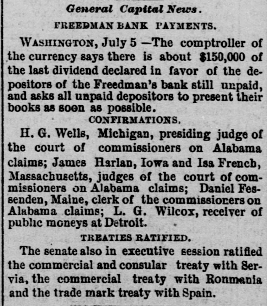 The Commissioners appointed under an act of Congress to wind up the affairs of the Freedmen's Savings and Trust Company report that, in addition to the 30 per cent. dividend heretofore paid, another dividend of 20 per cent. will probably be declared, making 50 per cent. in all. In order to enable them to do this, however, they ask Congress to purchase the Freedmen's Bank building in Washington, a large portion of which is now rented for Government offices, and a bill will soon be introduced for that purpose. The Commissioners have heretofore asked to be relieved from the duties imposed, and on submitting this bill, will reiterate that request.
