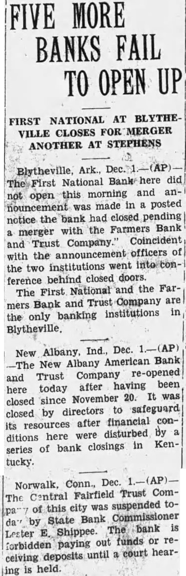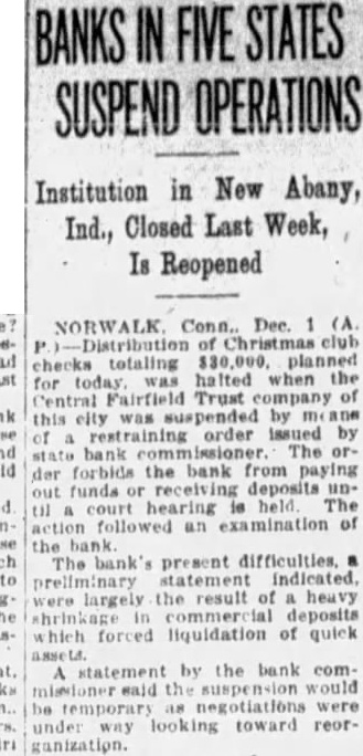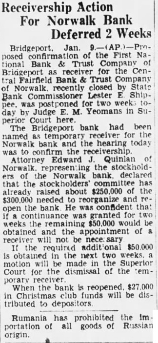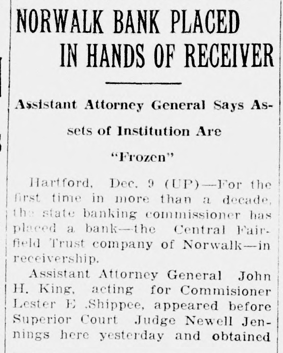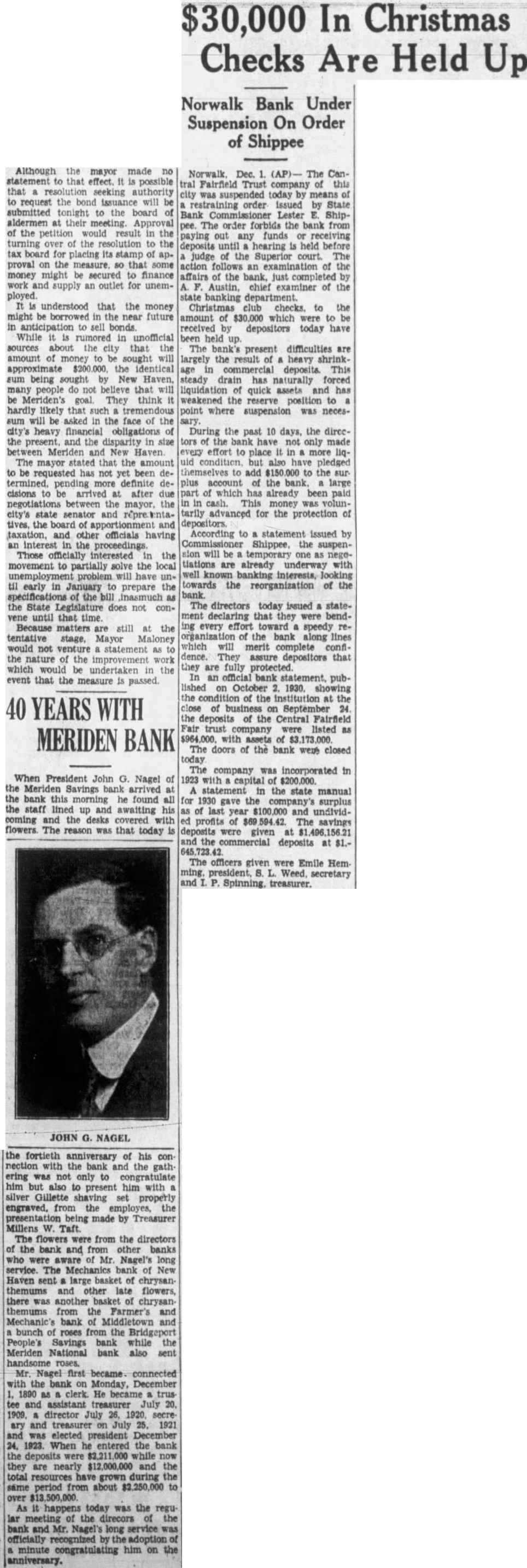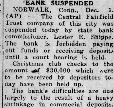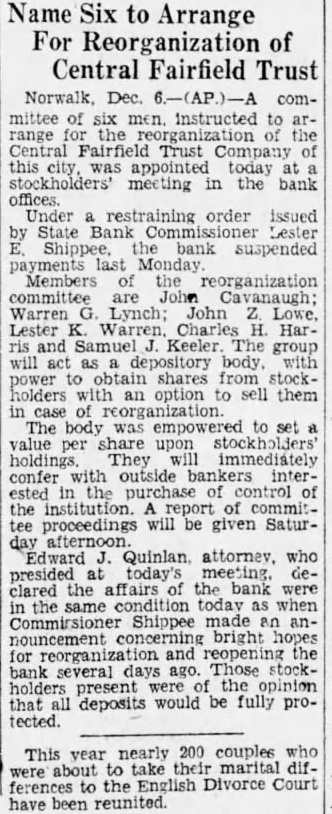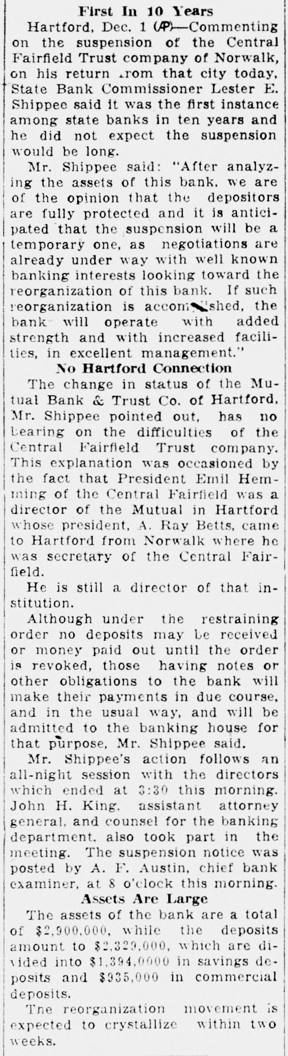 CENTRAL FAIRFIELD TRUST CO. CLOSED Norwalk Bank Business Halted by Order of Shippee DEPOSITORS BELIEVED SAFE State Commissioner Forbids Institution to Continue Until Difficulties Are Settled-Conmmercial Account Losses Blamed. Norwalk. Dec. 1 (AP)--The Central Fairfield Trust Co. of this city was suspended today by means of a restraining order issued by State Bank Commissioner Lester E. Shippee. The order forbids the bank from paying ( out any funds or receiving deposits until a hearing is held before a judge of the superior court. The ac1 tion follows an examination of the t bank. just completed, by A. F. Austin, chief examiner of the state banking department. Christmas Checks Delayed a Christmas club checks, to the r e amount of $30,000. which were to be received by depositors today, have t been held up. t The bank's present difficulties are largely the result of a heavy shrink( age in commercial deposits. This steady drain has naturally forced liquidation of quick assets and has weakened the reserve position to a point where suspension was necessary. During the past 10 days. the directors of the bank have not only made every effort to place it in a S more liquid condition. but also have pledged themselves to add $150,000 to the surplus account of the bank, C a large part of which has already been paid in in cash. This money was voluntarily advanced for the protection of depositors. Plan Reorganization According to a statement issued by Commissioner Shippee. the suspension will be a temporary one. as negotiations are already under way with well known banking interests, looking towards the reorganization of the bank. The directors today issued a statement declaring that they were bending every effort toward a speedy reorganization of the bank C along lines which will merit complete confidence. They assure depositors that they are fully protected. The bank has a capital of $200.000. The company was incorporated in 1923. A statement in the state manual for 1930 gave the company's surplus as of last year $100,000 and undivided profits of $69,594.42. The savings deposits were given at $1. 496.156.21 and the commercial deposits at $1,645,723.42. Officers of Concern The officers given were Emile Hemming, president: S. L. Weed, secretary, and I. P. Spining. treasurer. In an official statement. published on October 2. 1930, showing the condition of the institution at the close of business on Sept. 24, the deposits of the Central Fairfield Trust Co. were listed as $964,000. with as(Continued on Page Two)
