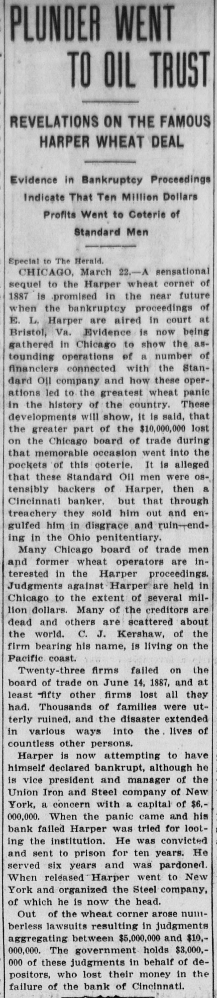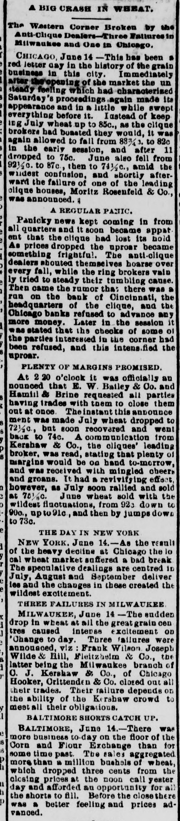 A BIG CRASH IN WHEAT. The Western Corner Broken by the Anti-Clique Dealore-Three Failuresin Milwaukee and One in Chicago. CHICAGO, June 14 -This has been a red letter day in the history of the grain business in this city. Immediately after the'opening of the market the un steady feeling which had characterized Saturday's proceedings again made its appearance and in a little while swept everything before it. Iastead of keep ing July wheat up to 85c., as the clique brokers had bussted they would, it was again allowed to fall from 83343. to 82c in the early session, and after 11 dropped to 75c. June also fell from 921/20. to 87c., then to 741/2c., amid the wiidest confusion, and shortly afterward the failure of one of the leading olique houses, Moritz Rosenfeld & Co., was announced. 4 A REGULAR PANIC. Panicky news kept coming in from all quarters and it soon became appat. ent that the clique had lost its hold As prices dropped the uproar became something frightful. The anti-clique dealers abouted themselves hoarse over every fall, while the ring brokers vain ly tried to steady their tumbling cause. Then came the rumor that there was a ran on the bank of Cincinnati, the headquarters of the clique, and the Chicago banks refused to advance any more money. Later in the session it was stated that the checks of some of the parties interested in the corner had been refused, and this intens.fied the uproar. PLENTY OF MARGINS PROMISED. At 20 o'clock it was officially an nounced that E. W. Bailey & Co. and Hamili & Brine requested all parties having trades with toem to close them out at once. Theinstant this announce 8 ment was made July wheat dropped to 8 721/1c, but soon recovered and went back to 74c. A communication from y Kershaw & Co., the cliques' leading P B broker. was read, stating that plenty of margins would be 00 hand to-morrow, and was received with mingled cheers and groans. It had a revivifying effect, n however, as July soon rallied and sold at 751/cc. June wheat sold with the o wildest fluctuations, from 92c down to 90o., upto91c, and then by jumps down to 73c. THE DAY IN NEW YORK NEW YORK. June 14.-As the reault of the heavy decline at Chicago the lo cal wheat market suffered a bad break The speculative dealings are centred ID July, August and September deliver les and the changes in these created the wildest excitement. THREE FAILURES IN MILWAUKEE MILWAUKEE, June 14 -The endden drop in wheat at all the great grain cen tres caused intense excitement OD Change to day. Three failures were annoueced, viz : Frank Wilson Joseph Wilde & Hill, Fleitzheim & Co., the latter being the Milwaukee branch of O. J. Kershaw & Co., of Chicago Hooker, Crittenden & Co. closed out all their trades. Their railure depends on the ability of the Kershaw crowd to mest their obligations. BALTIMORE SHORTS CATCH UP. BALTIMORE, June 14.-There was e more business to-day on the floor of the 8 Corn and Flour Exchange than for B some time past. The sales aggregated p more than a million bushels of wheat, h which dropped three cents from the closing prices at the noon call yester 11 day and afforded an opportunity for all h the shorts to fill. Before the closethere p was a better feeling and prices advanced.