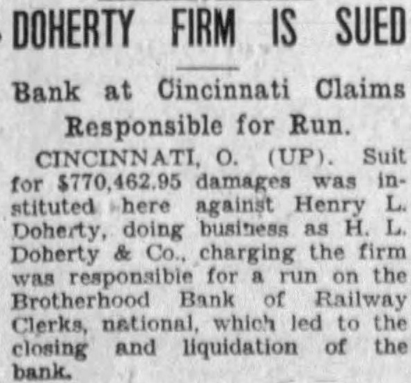 FIRM IS SUED Bank at Cincinnati Claims Responsible for Run. Suit for damages was stituted here against Henry Doherty, doing business Doherty charging the firm for on the Brotherhood Railway Clerks, which led to closing and liquidation of the