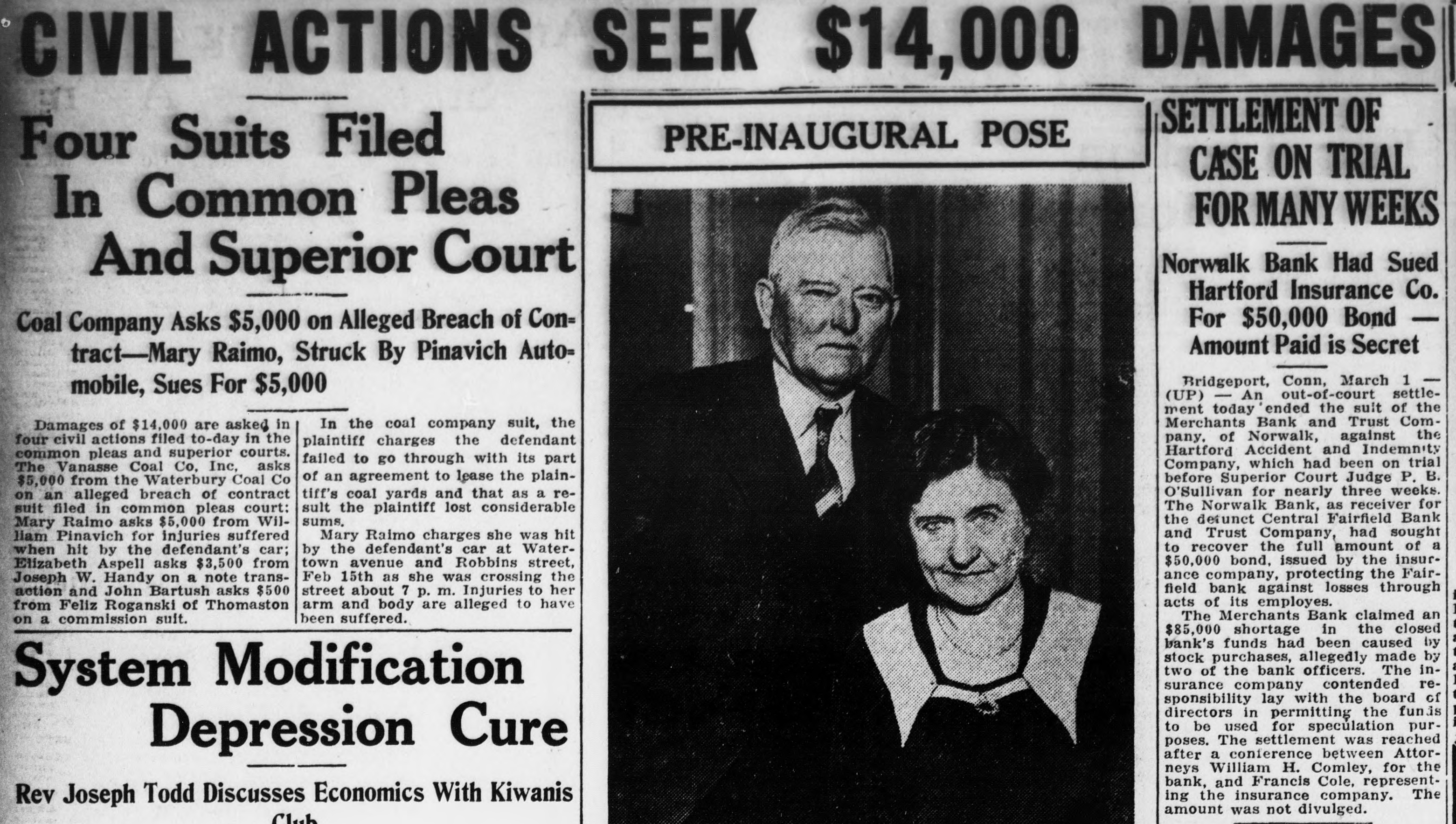 CIVIL ACTIONS SEEK $14,000 DAMAGES SETTLEMENT OF PRE-INAUGURAL POSE Four Suits Filed CASE ON TRIAL In Common Pleas FOR MANY WEEKS Norwalk Bank Had Sued And Superior Court Hartford Insurance Co. For $50,000 Bond Coal Company Asks $5,000 on Alleged Breach of Con= Amount Paid is Secret tract-Mary Raimo, Struck By Pinavich Auto= Bridgeport, Conn, March 1 mobile, Sues For $5,000 (UP) - An out-of-court settlement today ended the suit of the Merchants Bank and Trust ComIn the coal company suit, the Damages of $14,000 are asked in pany. of Norwalk, against the four civil actions filed to-day in the plaintiff charges the defendant Hartford Accident and Indemnity common pleas and superior courts. failed to go through with its part Company, which had been on trial The Vanasse Coal Co. Inc. asks of an agreement to lease the plainbefore Superior Court Judge P. B. $5,000 from the Waterbury Coal Co O'Sullivan for nearly three weeks. tiff's coal yards and that as a reon an alleged breach of contract The Norwalk Bank, as receiver for sult the plaintiff lost considerable suit filed in common pleas court: the detunct Central Fairfield Bank sums. Mary Raimo asks $5,000 from Wiland Trust Company, had sought Mary Raimo charges she was hit liam Pinavich for injuries suffered to recover the full amount of a by the defendant's car at Waterwhen hit by the defendant's car; $50,000 bond, issued by the insurtown avenue and Robbins street, Elizabeth Aspell asks $3,500 from ance company, protecting the FairFeb 15th as she was crossing the Joseph W. Handy on a note transfield bank against losses through action and John Bartush asks $500 street about 7 p. m. Injuries to her acts of its employes. arm and body are alleged to have from Feliz Roganski of Thomaston The Merchants Bank claimed an been suffered. on a commission suit. $85,000 shortage in the closed bank's funds had been caused by stock purchases, allegedly made by two of the bank officers. The insurance company contended reSystem Modification sponsibility lay with the board of directors in permitting the funds to be used for speculation purposes. The settlement was reached Depression Cure after a conference between Attorneys William H. Comley, for the bank, and Francis Cole, representing the insurance company. The Rev Joseph Todd Discusses Economics With Kiwanis amount was not divulged.