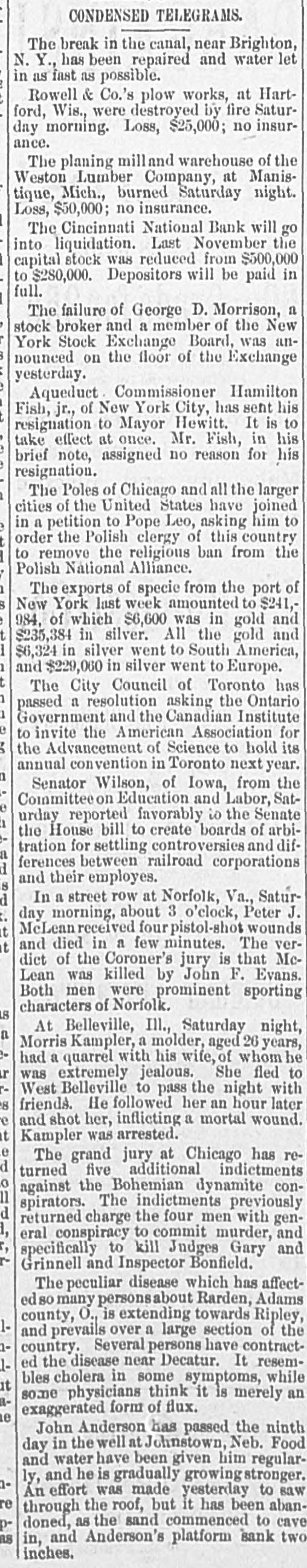CONDENSED TELEGRAMS. The break in the canal, near Brighton, N. Y., has been repaired and water let in as fast as possible. Rowell & Co.'s plow works, at Hartford, Wis., were destroyed by fire Saturday morning. Loss, $25,000; no insurance. The planing milland warehouse of the Weston Lumber Company, at Manistique, Mich., burned Saturday night. Loss, $50,000; no insurance. The Cincinnati National Bank will go into liquidation. Last November the capital stock was reduced from $500,000 to $280,000. Depositors will be paid in full. The failure of George D. Morrison, a stock broker and a member of the New York Stock Exchange Board, was announced on the floor of the Exchange yesterday. Aqueduct Commissioner Hamilton Fish, jr., of New York City, has sent his resignation to Mayor Hewitt. It is to take effect at once. Mr. Fish, in his brief note, assigned no reason for his resignation. The Poles of Chicago and all the larger cities of the United States have joined in a petition to Pope Leo, asking him to order the Polish clergy of this country to remove the religious ban from the Polish National Alliance. The exports of specie from the port of New York last week amounted to $241, 984, of which $6,600 was in gold and $235,384 in silver. All the gold and $6,324 in silver went to South America, and $229,060 in silver went to Europe. The City Council of Toronto has passed a resolution asking the Ontario Government and the Canadian Institute to invite the American Association for the Advancement of Science to hold its annual convention in Toronto next year. Senator Wilson, of Iowa, from the Committee on Education and Labor, Saturday reported favorably is the Senate the House bill to create boards of arbitration for settling controversies and differences between railroad corporations and their employes. In a street row at Norfolk, Va., Saturday morning, about 3 o'clock, Peter J. McLean received four pistol-shot wounds and died in a few minutes. The verdict of the Coroner's jury is that McLean was killed by John F. Evans. Both men were prominent sporting characters of Norfolk. is At Belleville, Ill., Saturday night, a Morris Kampler, a molder, aged 26 years, had a quarrel with his wife, of whom he r was extremely jealous. She fled to West Belleville to pass the night with 8 friends. He followed her an hour later e and shot her, inflicting a mortal wound. it Kampler was arrested. e The grand jury at Chicago has returned five additional indictments o against the Bohemian dynamite conspirators. The indictments previously returned charge the four men with general conspiracy to commit murder, and specifically to kill Judges Gary and Grinnell and Inspector Bonfield. The peculiar disease which has affectmany personsabout Rarden, Adams county, O. is extending towards Ripley, 1and prevails over a large section of the country. Several persons have contracted the disease near Decatur. It resem1bles cholera in some symptoms, while it some physicians think it is merely an exaggerated form of flux. e John Anderson has passed the ninth day in the well at Johnstown, Neb. Food and water have been given him regularly, and he is gradually growing stronger. hAn effort was made yesterday to saw re through the roof, but it has been aban doned, as the sand commenced to cave pas in, and Anderson's platform sank inches.