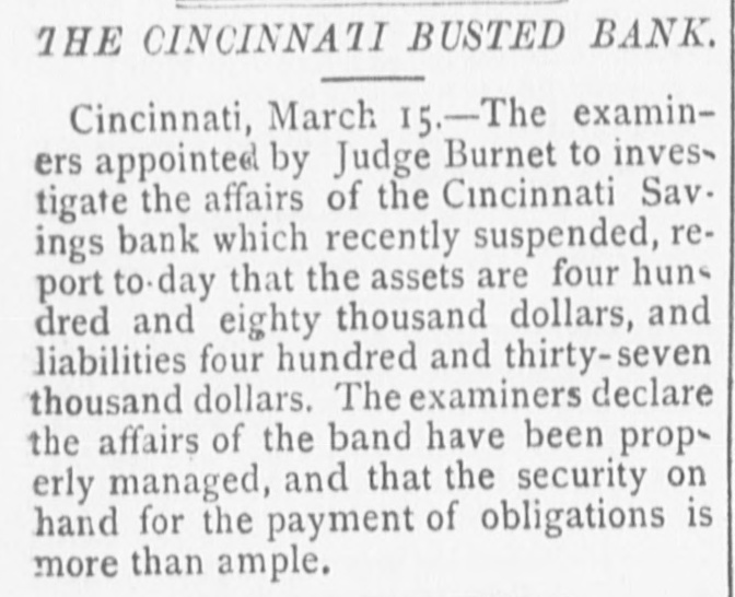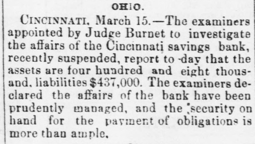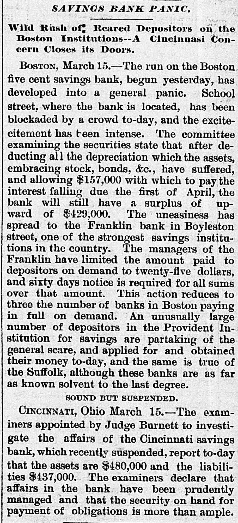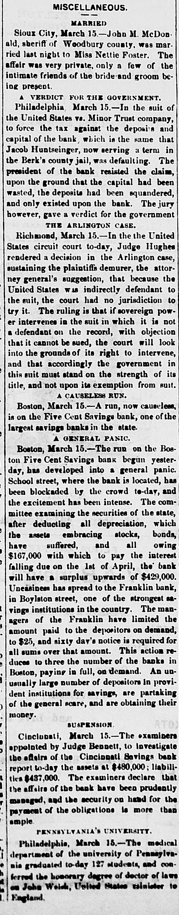 MISCELLANEOUS. MARRIED Sioux City, March 15.-John M. McDonald, sheriff of Woodbury county, was married last night to Miss Nettie Foster. The affair was very private, only a few of the intimate friends of the bride and groom being present. A VERDICT FOR THE GOVERNMENT. Philadelphia March 15.-In the suit of the United States vs. Minor Trust company, to force the tax against the deposits and capital of the bank which is the same that Jacob Huntseinger, now serving a term in the Berk's county jail, was defaulting. The president of the bank resisted the claim, upon the ground that the capital had been wasted, the deposits had been squandered, and only existed upon the bank. The jury however, gave a verdict for the government THE ARLINGTON CASE. Richmond, March 15.-In the the United States circuit court to-day, Judge Hughes rendered a decision in the Arlington case, sustaining the plaintiffs demurer, the attorney general's suggestion, that because the United States was indirectly defendant to the suit, the court had no jurisdiction to try it. The ruling is that if sovereign power intervenes in the suit in which it is not a defendant on the record, with objection that it cannot be sued, the court will look into the grounds of its right to intervene, and that accordingly the government in this suit must stand on the strength of its title, and not upon its exemption from suit. A CAUSELESS RUN. Boston, March 15.-A run, now causeless, is on the Five Cent Savings bank, one of the largest savings banks in the state. A GENERAL PANIC. Boston, March 15.-The run on the Boston Five Cent Savings bank begun yesterday, has developed into a general panic. School street, where the bank is located, has been blockaded by the crowd to-day, and the excitement has been intense. The committee examining the securities of the state, after deducting all depreciation, which the assets embracing stocks, bonds, have suffered, and all owing $167,000 with which to pay the interest falling due on the 1st of April, the bank will have a surplus upwards of $429,000. Uneasiness has spread to the Franklin bank, in Boylaton street, one of the strongest savings institutions in the country. The managera of the Franklin have limited the amount paid to the depositors on demand, to $25, and sixty day's notice is required for all sums over that amount. This action reduces to three the number of the banks in Boston, paying in full, on demand. An unusually large number of depositors in provident institutions for savings, are partaking of the general scare, and are obtaining their b money. SUSPENSION Cinclubati, March 15.-The examiners appointed by Judge Bennett, to Investigate the affairs of the Cincionati Savings bank report to-day the assets at $480,000; liabilities $437,000. The examiners declare that the affairs of the bank have been prudently managed, and the security on hand for the payment of the obligations is more than ample PENNSYLVANIA'S UNIVERSITY. Philadelphia, March 15.-The medical department of the university of Pennsylvania graduated to-day 127 students, and conh terred the honorary degree of doctor of laws a on John Weigh, United States minister to England,