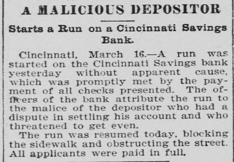 A MALICIOUS DEPOSITOR Starts a Run on a Cincinnati Savings Bank. Cincinnati, March 16.-A run was started on the Cincinnati Savings bank yesterday without apparent cause, which was promptly met by the payment of all checks presented. The offloers of the bank attribute the run to the malice of the depositor who had a dispute in settling his account and who threatened to get even. The run was resumed today, blocking the sidewalk and obstructing the street. All applicants were paid in full.