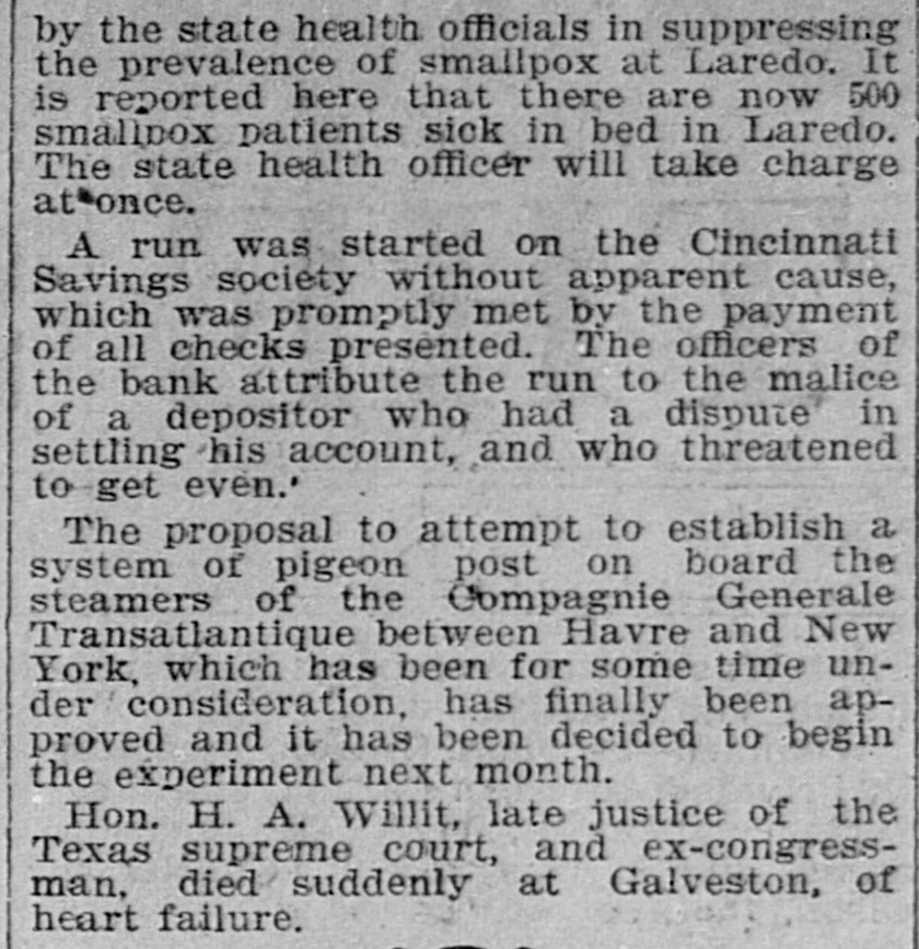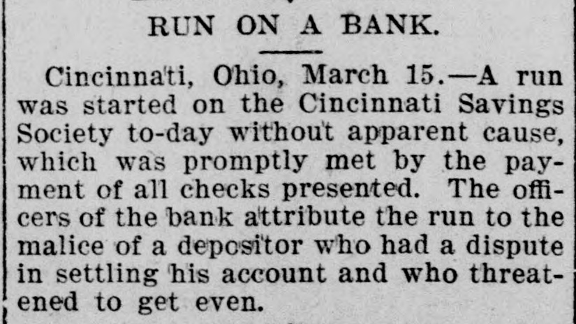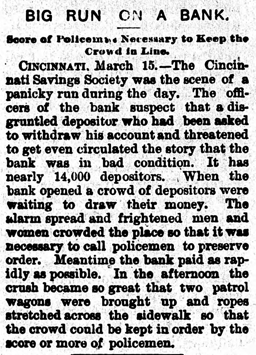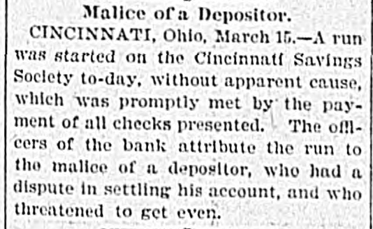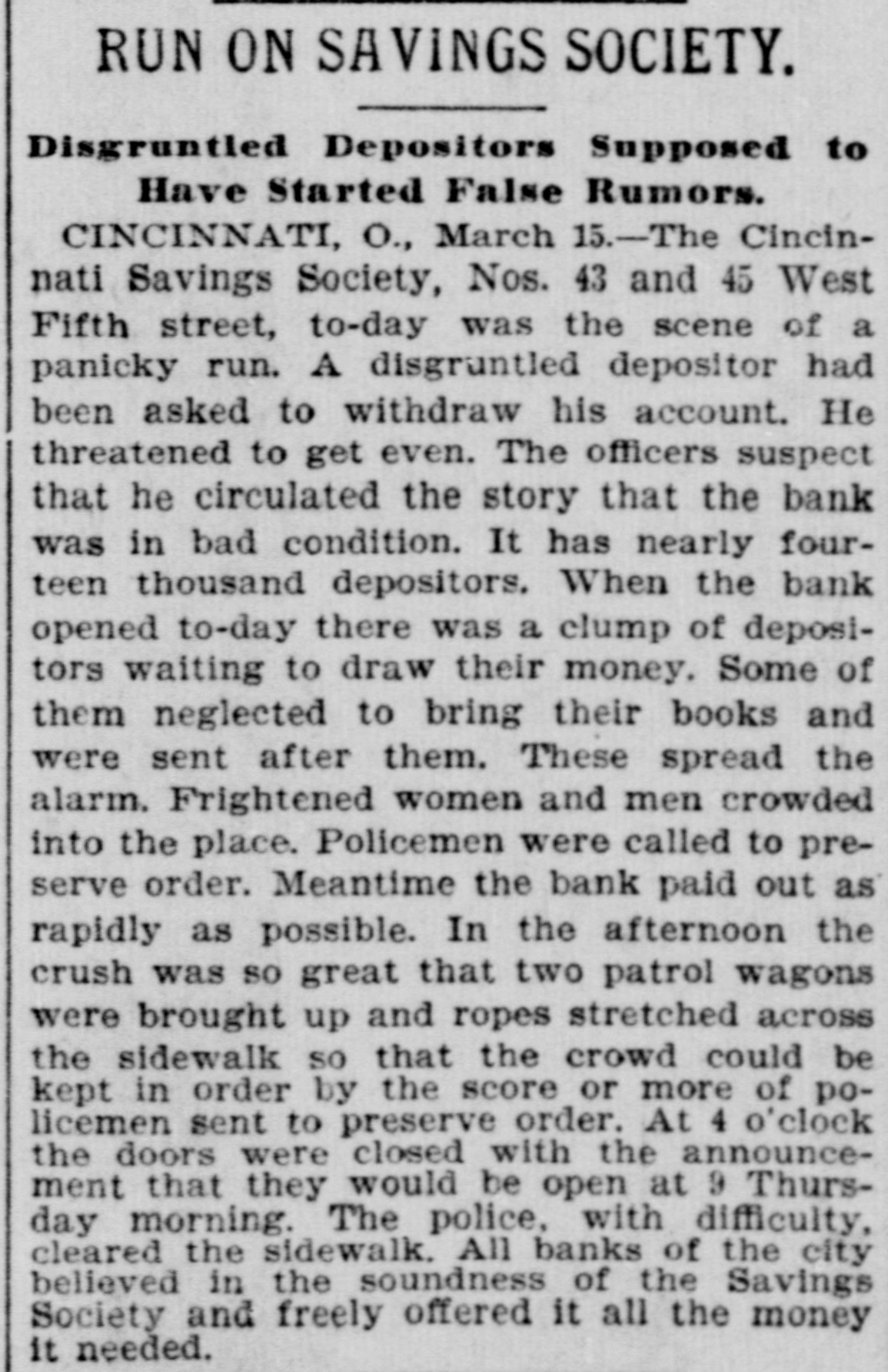 RUN ON SAVINGS SOCIETY. Disgruntled Depositors Supposed to Have Started False Rumors. CINCINNATI, O., March 15.-The Cincinnati Savings Society, Nos. 43 and 45 West Fifth street, to-day was the scene of a panicky run. A disgrantled depositor had been asked to withdraw his account. He threatened to get even. The officers suspect that he circulated the story that the bank was in bad condition. It has nearly fourteen thousand depositors. When the bank opened to-day there was a clump of depositors waiting to draw their money. Some of them neglected to bring their books and were sent after them. These spread the alarm. Frightened women and men crowded into the place. Policemen were called to preserve order. Meantime the bank paid out as rapidly as possible. In the afternoon the crush was so great that two patrol wagons were brought up and ropes stretched across the sidewalk so that the crowd could be kept in order by the score or more of policemen sent to preserve order. At 4 o'clock the doors were closed with the announcement that they would be open at 9 Thursday morning. The police, with difficulty, cleared the sidewalk. All banks of the city believed in the soundness of the Savings Society and freely offered it all the money it needed.