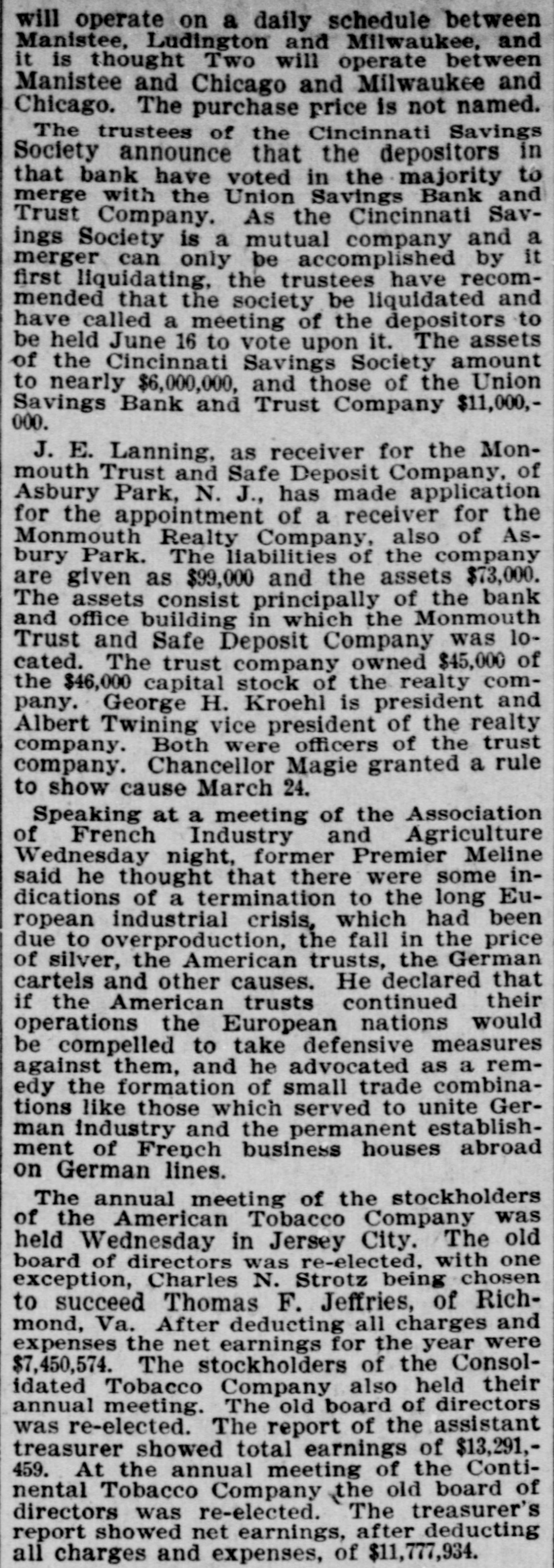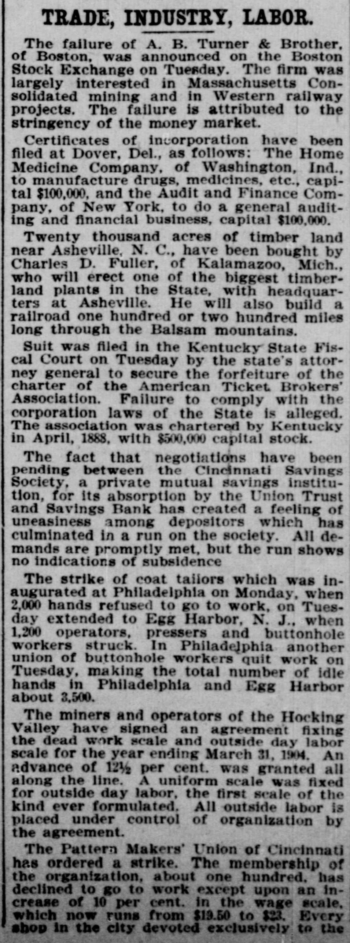 TRADE, INDUSTRY, LABOR. The failure of A. B. Turner & Brother, of Boston, was announced on the Boston Stock Exchange on Tuesday. The firm was largely interested in Massachusetts Consolidated mining and in Western railway projects. The failure is attributed to the stringency of the money market. Certificates of incorporation have been filed at Dover, Del., as follows: The Home Medicine Company, of Washington, Ind., to manufacture drugs, medicines, etc., capital $100,000, and the Audit and Finance Company, of New York, to do a general auditing and financial business, capital $100,000. Twenty thousand acres of timber land near Asheville, N. C., have been bought by Charles D. Fuller, of Kalamazoo, Mich., who will erect one of the biggest timberland plants in the State, with headquarters at Asheville. He will also build a railroad one hundred or two hundred miles long through the Balsam mountains. Suit was filed in the Kentucky State Fiscal Court on Tuesday by the state's attorney general to secure the forfeiture of the charter of the American Ticket Brokers' Association. Failure to comply with the corporation laws of the State is alleged. The association was chartered by Kentucky in April, 1888, with $500,000 capital stock. The fact that negotiations have been pending between the Cincinnati Savings Society, a private mutual savings institution, for its absorption by the Union Trust and Savings Bank has created a feeling of uneasiness among depositors which has culminated in a run on the society. All demands are promptly met, but the run shows no indications of subsidence The strike of coat tailors which was inaugurated at Philadelphia on Monday, when 2,000 hands refused to go to work, on Tuesday extended to Egg Harbor, N. J., when 1,200 operators, pressers and buttonhole workers struck. In Philadelphia another union of buttonhole workers quit work on Tuesday, making the total number of idle hands in Philadelphia and Egg Harbor about 3,500. The miners and operators of the Hocking Valley have signed an agreement fixing the dead work scale and outside day labor scale for the year ending March 31, 1904. An advance of 12½ per cent. was granted all along the line. A uniform scale was fixed for outside day labor, the first scale of the kind ever formulated. All outside labor is placed under control of organization by the agreement. The Pattern Makers' Union of Cincinnati has ordered a strike. The membership of the organization, about one hundred. has declined to go to work except upon an increase of 10 per cent. in the wage scale, which now runs from $19.50 to $23. Every shop in the city devoted exclusively to the