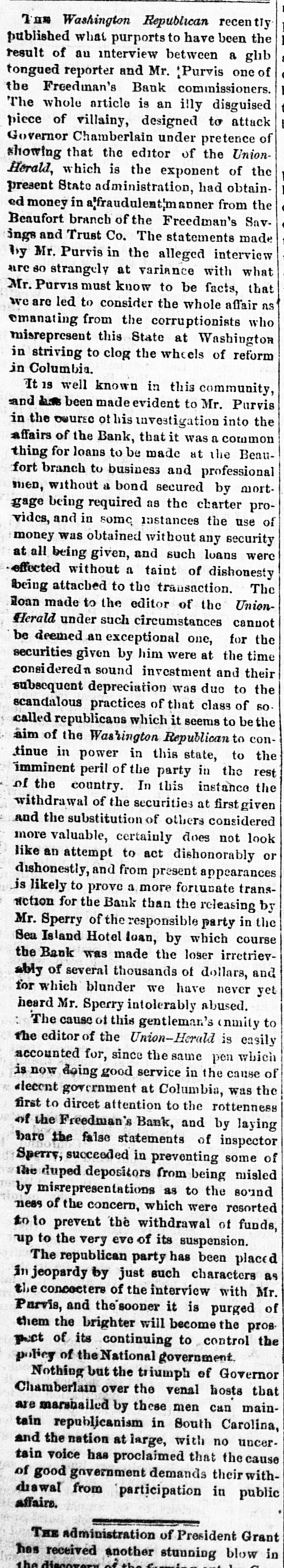 Tan Washington Republican recently published what purports to have been the result of au interview between a glib tongued reporter and Mr. (Purvis one of the Freedman's Bank commissioners. The whole article is an illy disguised piece of villainy, designed to attack Governor Chamberlain under pretence of showing that the editor of the UnionHerald, which is the exponent of the present State administration, had obtained money in affraudulent;manner from the Beaufort branch of the Freedman's Savings and Trust Co. The statements made by Mr. Purvis in the alleged interview are 80 strangely at variance with what Mr. Purvis must know to be facts, that we are led to consider the whole affair as emanating from the corruptionists who misrepresent this State at Washington in striving to clog the wheels of reform in Columbia. It 18 well known in this community, and has been made evident to Mr. Purvis in the ovure ot his investigation into the that it was a affairs of the Bank, common thing for loans to be made at the Beaufort branch to business and professional men, without a bond secured by mortgage being required as the charter provides, and in some instances the use of money was obtained without any security at all being given, and such loans were a taint of effected without dishonesty being attached to the trausaction. The loan made to the editor of the UnionHerald under such circumstances cannot be deemed an exceptional one, for the securities given by him were at the time considered sound investment and their subsequent depreciation was due to the scandalous practices of that class of so. called republicans which it seems to be the aim of the Washington Republican to continue in power in this state, to the imminent peril of the party in the rest of the country. In this instance the withdrawal of the securities at first given and the substitution of others considered more valuable, certainly does not look an attempt to act and from present to prove a more fortunate transthan the action is dishonestly, like likely for the Bank dishonorably appearances releasing by or Mr. Sperry of the responsible party in the which Sea Island Hotel loan, by course the Bank was made the loser irretrievably of several thousands of dollars, and for which blunder we have never yet heard Mr. Sperry intolerably abused. The cause of this gentleman's connity to the editor of the Union-Heruld is easily accounted for, since the same pen which is now doing good service in the cause of <lecent government at Columbia, was the first to direct attention to the rottenness of the Freedman's Bank, and by laying bare the false statements of inspector Sperry, succeeded in preventing some of the duped depositors from being misled by misrepresentations as to the sound ness of the concern, which were resorted to to prevent the withdrawal of funds, up to the very eve of its suspension. The republican party has been placed in jeopardy by just such characters as the concecters of the interview with Mr. Purvis, and the sooner it is purged of them the brighter will become the pros pest of its continuing to control the policy of the National government Nothing but the triumph of Governor Chamberlain over the venal hosts that are marshailed by these men can maintain republicanism in South Carolina, and the nation at large, with no uncertain voice has proclaimed that the cause of good government demands their withdrawal from participation in public affairs. THE administration of President Grant has received another stunning blow in the discovery of bee