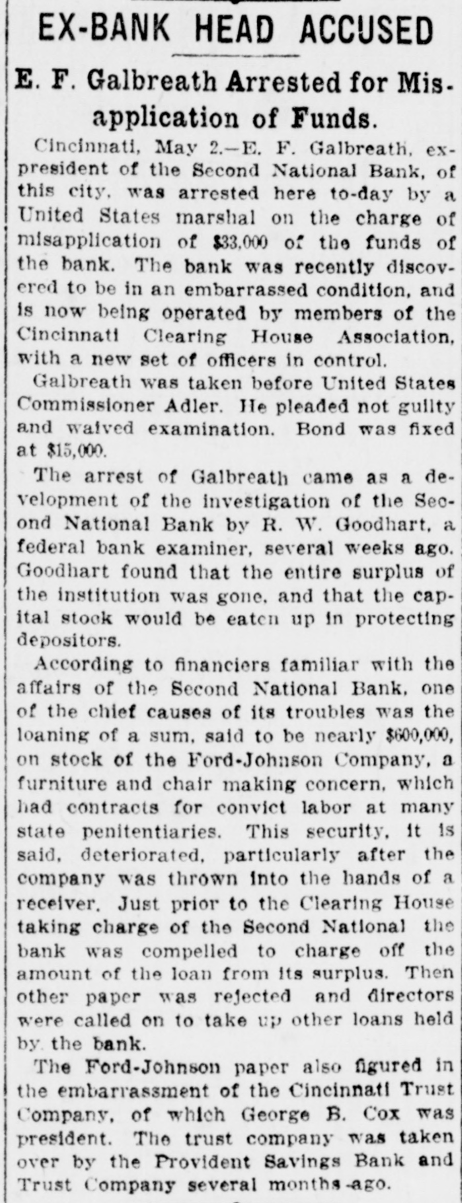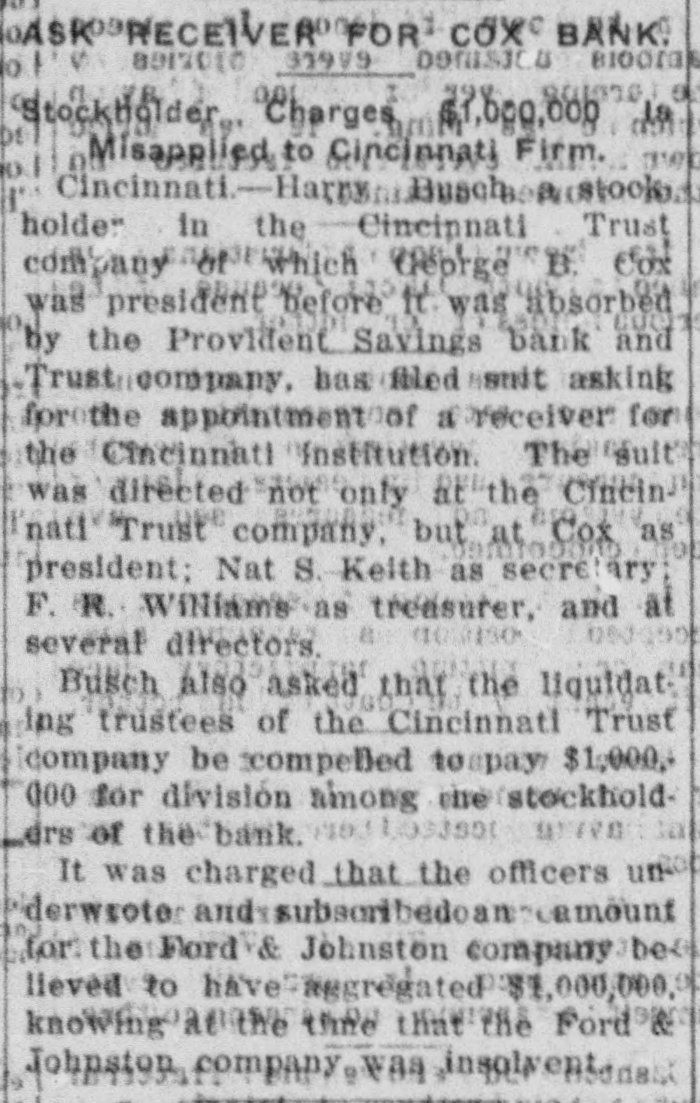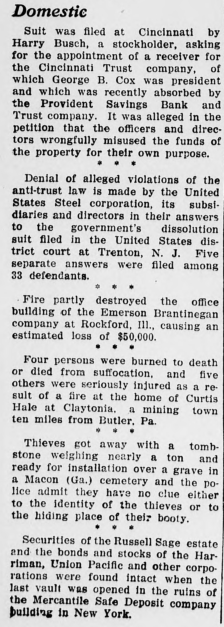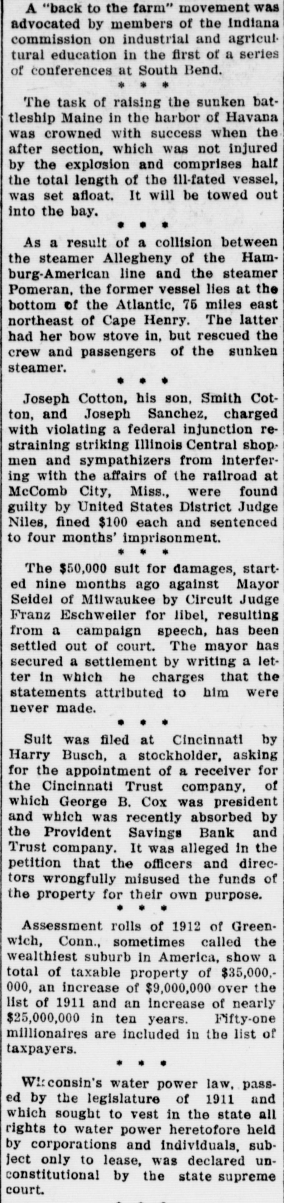 A "back to the farm" movement was advocated by members of the Indiana commission on industrial and agricultural education in the first of a series of conferences at South Bend. *** The task of raising the sunken battleship Maine in the harbor of Havana was crowned with success when the after section, which was not injured by the explosion and comprises half the total length of the ill-fated vessel, was set afloat. It will be towed out into the bay. ... As a result of a collision between the steamer Allegheny of the Hamburg-American line and the steamer Pomeran, the former vessel lies at the bottom of the Atlantic, 75 miles east northeast of Cape Henry. The latter had her bow stove in, but rescued the crew and passengers of the sunken steamer. Joseph Cotton, his son, Smith Cotton, and Joseph Sanchez, charged with violating a federal injunction restraining striking Illinois Central shop. men and sympathizers from interfering with the affairs of the railroad at McComb City, Miss., were found guilty by United States District Judge Niles, fined $100 each and sentenced to four months' imprisonment. The $50,000 suit for damages, started nine months ago against Mayor Seidel of Milwaukee by Circuit Judge Franz Eschweiler for libel, resulting from a campaign speech, has been settled out of court. The mayor has secured a settlement by writing a letter in which he charges that the statements attributed to him were never made. Suit was filed at Cincinnati by Harry Busch, a stockholder, asking for the appointment of a receiver for the Cincinnati Trust company, of which George B. Cox was president and which was recently absorbed by the Provident Savings Bank and Trust company. It was alleged in the petition that the officers and directors wrongfully misused the funds of the property for their own purpose. Assessment rolls of 1912 of Greenwich, Conn., sometimes called the wealthiest suburb in America, show a total of taxable property of $35,000,000, an increase of $9,000,000 over the list of 1911 and an increase of nearly $25,000,000 in ten years. Fifty-one millionaires are included in the list of taxpayers. Wirconsin's water power law, passed by the legislature of 1911 and which sought to vest in the state all rights to water power heretofore held by corporations and individuals, subject only to lease, was declared unconstitutional by the state supreme court.