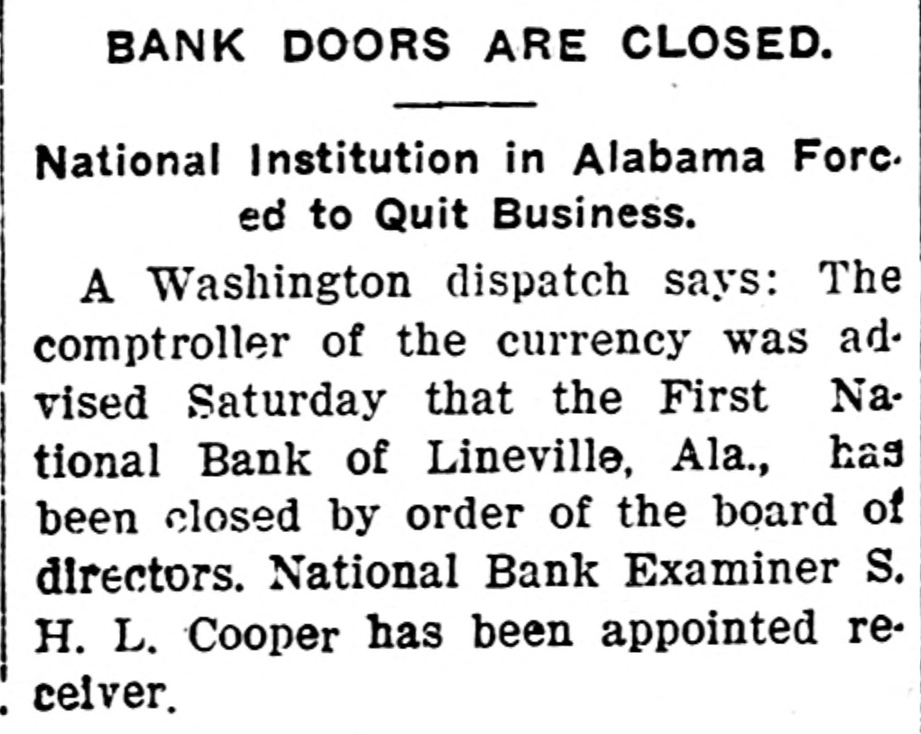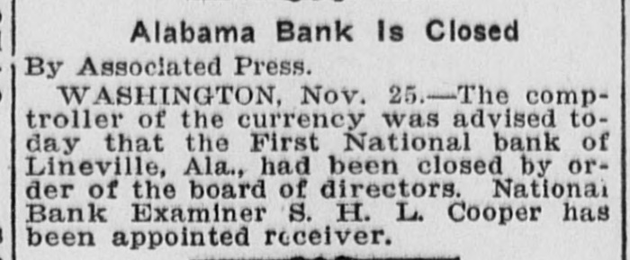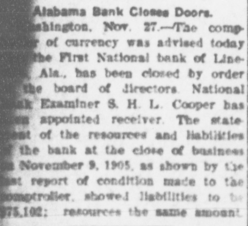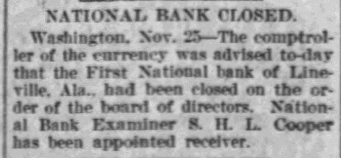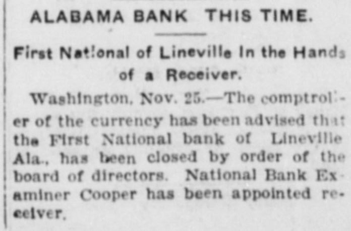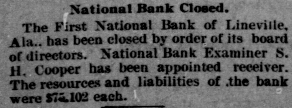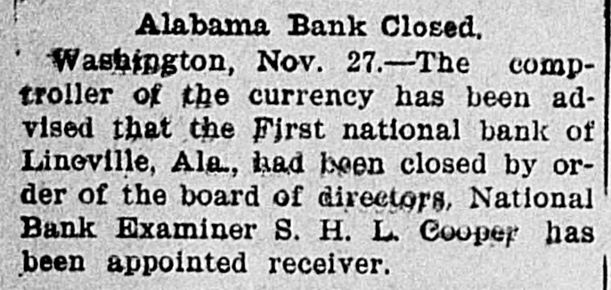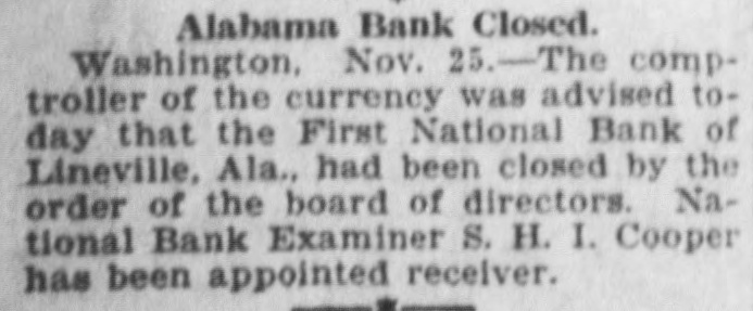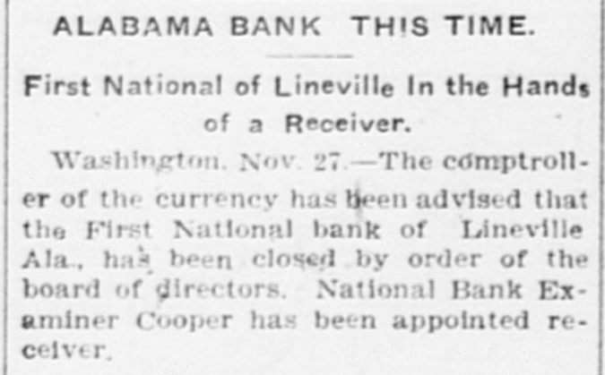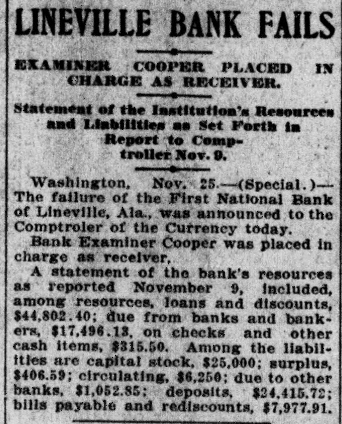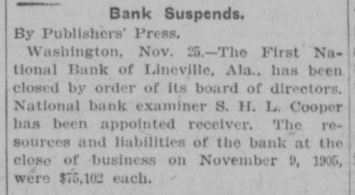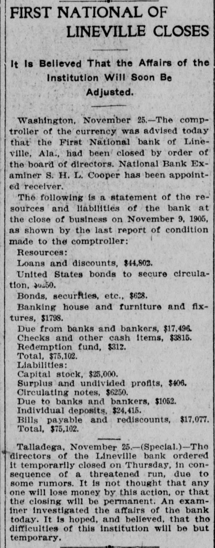 FIRST NATIONAL OF LINEVILLE CLOSES It Is Belleved That the Affairs of the Institution Will Soon Be Adjusted. Washington, November 25.-The comptroller of the currency was advised today that the First National bank of Lineville, Ala., had been closed by order of the board of directors. National Bank Examiner S. H. L. Cooper has been appointed receiver. The following is a statement of the resources and liabilities of the bank at the close of business on November 9, 1905, as shown by the last report of condition made to the comptroller: Resources: Loans and discounts, $44,802. United States bonds to secure circulation, $0250. Bonds, securities, etc., $628. Banking house and furniture and fixtures, $1798. Due from banks and bankers, $17,496 Checks and other cash items, $3815. Redemption fund, $312. Total, $75,102. Liabilities: Capital stock, $25,000. Surplus and undivided profits, $406. Circulating notes, $6250. Due to banks and bankers, $1052. Individual deposits, $24,415. Bills payable and rediscounts, $17,077. Total, $75,102. Talladega, November 25.-(Special.)-The directors of the Lineville bank ordered it temporarily closed on Thursday, in consequence of a threatened run, due to some rumors. It is not thought that any one will lose money by this action, or that the closing will be permanent. An examiner investigated the affairs of the bank today. It is hoped, and believed, that the difficulties of this institution will be but temporary.
