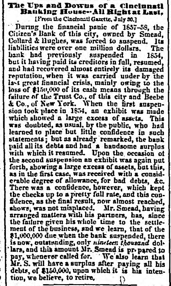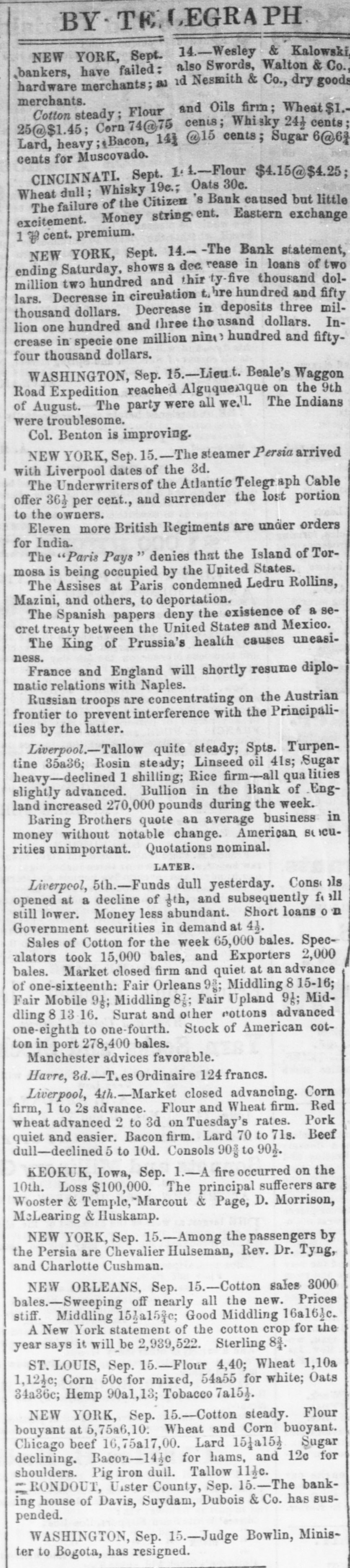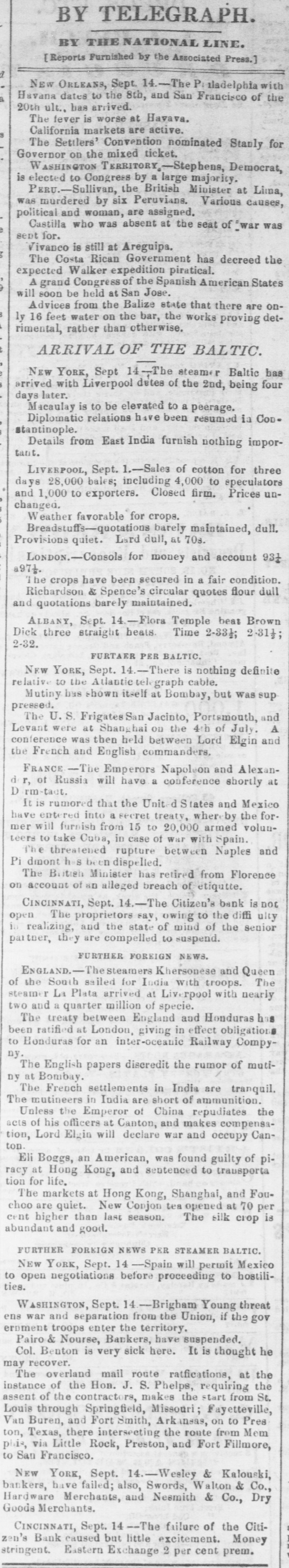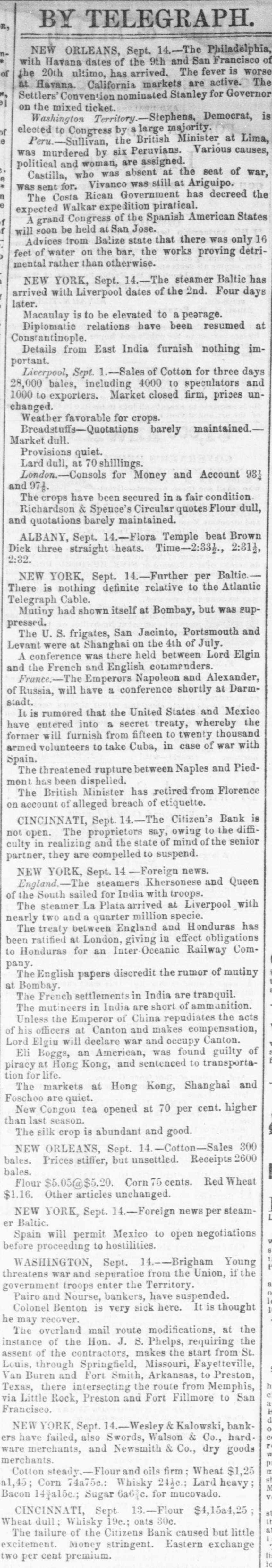 NEW ORLEANS, Sept. 14.-The Philadelphia, with Havana dates of the 9th and San Francisco of of the 20th ultimo, has arrived. The fever is worse at Havana. California markets are active. The Settlers' Convention nominated Stanley for Governor on the mixed ticket. Washington Territory.-Stephens. Democrat, is elected to Congress by a large majority. Peru.-Sullivan, the British Minister at Lima, was murdered by six Peruvians. Various causes, political and woman, are assigned. Castilla, who was absent at the seat of war, was for. Vivanco was still at Ariguipo. The sent Costa Rican Government has decreed the expected Walkar expedition piratical. A grand Congress of the Spanish American States will soon be held at San Jose. Advices from Balize state that there was only 16 feet of water on the bar, the works proving detrimental rather than otherwise. NEW YORK, Sept. 14.-The steamer Baltic has arrived with Liverpool dates of the 2nd. Four days later. Macaulay is to be elevated to a peerage. Diplomatic relations have been resumed at Constantinople. Details from East India furnish nothing important. Liverpool, Sept. 1.-Sales of Cotton for three days 28,000 bales, including 4000 to speculators and 1000 to exporters. Market closed firm, prices unchanged. Weather favorable for crops. Breadstuffs-Quotations barely maintained.Market dull. Provisions quiet. Lard dull, at 70 shillings. London.-Consols for Money and Account 93} and 97f. The crops have been secured in a fair condition Richardson & Spence's Circular quotes Flour dull, and quotations barely maintained. ALBANY, Sept. 14.-Flora Temple beat Brown Dick three straight heats. Time-2:331., 2:311, 2:32. NEW YORK, Sept. 14.-Further per Baltic.There is nothing definite relative to the Atlantic Telegraph Cable. Mutiny had shown itself at Bombay, but was suppressed. The U.S. frigates, San Jacinto, Portsmouth and Levant were at Shanghai on the 4th of July. A conference was there held between Lord Elgin and the French and English commanders. France.-The Emperors Napoleon and Alexander, of Russia, will have a conference shortly at Darmstadt. It is rumored that the United States and Mexico have entered into a secret treaty, whereby the former will furnish from fifteen to twenty thousand armed volunteers to take Cuba, in case of war with Spain. The threatened rupture between Naples and Piedmont has been dispelled. The British Minister has retired from Florence on account of alleged breach of etiquette. CINCINNATI, Sept. 14.-The Citizen's Bank is not open. The proprietors say, owing to the difficulty in realizing and the state of mind of the senior partner, they are compelled to suspend. NEW YORK, Sept. 14 -Foreign news. England.-The steamers Khersonese and Queen of the South sailed for India with troops. The steamer La Plata arrived at Liverpool with nearly two and a quarter million specie. The treaty between England and Honduras has been ratified at London, giving in effect obligations to Honduras for an Inter Oceanic Railway Company. The English papers discredit the rumor of mutiny at Bombay. The French settlements in India are tranquil. The mutineers in India are short of ammunition. Unless the Emperor of China repudiates the acts of his officers at Canton and makes compensation, Lord Elgiu will declare war and occupy Canton. Eli Boggs, an American, was found guilty of piracy at Hong Kong, and sentenced to transportation for life. The markets at Hong Kong, Shanghai and Foschoo are quiet. New Congou tea opened at 70 per cent. higher than last season. The silk crop is abundant and good. NEW ORLEANS, Sept. 14.-Cotton-Sales 300 bales. Prices stiffer, but unsettled. Receipts 2600 bales. Flour $5.05@$5.20. Corn 75 cents. Red Wheat $1.16. Other articles unchanged. NEW YORK, Sept. 14.-Foreign news per steamer Baltic. Spain will permit Mexico to open negotiations before proceeding to hostilities. WASHINGTON, Sept. 14.-Brigham Young threatens war and sepuration from the Union, if the government troops enter the Territory. Pairo and Nourse, bankers, have suspended. Colonel Benton is very sick here. It is thought he may recover. The overland mail route modifications, at the instance of the Hon. J. S. Phelps, requiring the assent of the contractors, makes the start from St. Louis, through Springfield, Missouri, Fayetteville, Van Buren and Fort Smith, Arkansas, to Preston, Texas, there intersecting the route from Memphis, via Little Rock, Preston and Fort Fillmore to San Francisco. NEW YORK, Sept. 14.-Wesley & Kalowski, bankers have failed, also Swords, Walson & Co., hard. ware merchants, and Newsmith & Co., dry goods merchants. Cotton and oils firm; Wheat $1,25 a1,45; Corn 74a75c.: Whisky 242c.; Lard heavy; Bacon 144a15c.; Sugar 6a61c. for mucovado. CINCINNATI, Sept 13.-Flour $4,15a4,25 ; Wheat dull; Whisky 19c.; oats 30c. The failure of the Citizens Bank caused but little excitement. Money stringent. Eastern exchange two per cent premium.