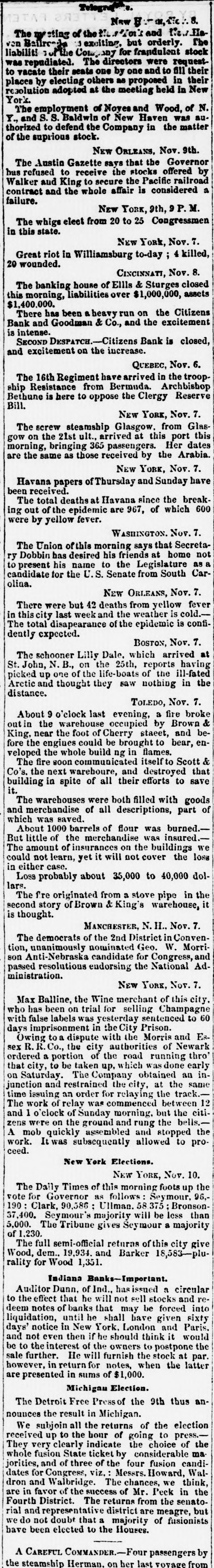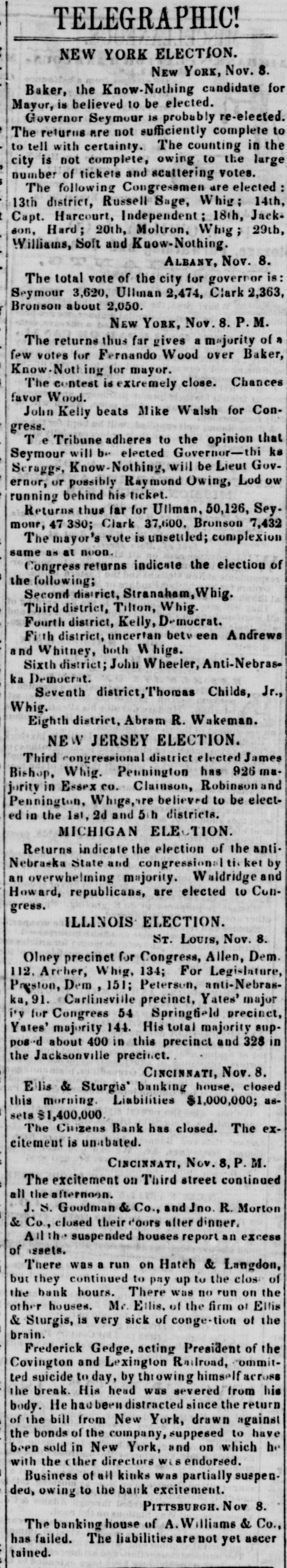 TELEGRAPHIC! NEW YORK ELECTION. NEW YORK, Nov. 8. Baker, the Know-Nothing candidate for Mayor, is believed to be elected. Governor Seymour is probably re-elected. The returns are not sufficiently complete to to tell with certainty. The counting in the city is not complete, owing to the lurge number of tickets and scattering votes. The following Congressmen are elected 13th district, Russell Sage, Whig; 14th, Capt. Harcourt, Independent 18th, Jackson, Hard; 20th, Moltron, Whig ; 29th, Williams, Soft and Know-Nothing. ALBANY, Nov. 8. The total vote of the city for governor is: Seymour 3,620, Ullman 2,474, Clark 2,363, Bronson about 2,050. NEW YORK, Nov. 8. P.M. The returns thus far gives a majority of a few votes for Fernando Wood over Baker, Know.Nott ing for mayor. The contest is extremely close. Chances favor Wood. John Kelly beats Mike Walsh for Congress. T e Tribune adheres to the opinion that Seymour will be elected Governor-thi ks Scraggs, Know-Nothing, will be Lieut Governor, or possibly Raymond Owing, Lod ow running behind his ticket. Returns thus far for Uliman, 50,126, Sey. mour, 47 380; Clark 37,600, Bronson 7,432 The mayor's vote is unsettled; complexion same as at noon. Congress returns indicate the election of the following; Second district, Stranaham, Whig. Third district, Tilton, Whig. Fourth district, Kelly, Democrat. Firth district, uncertan betw een Andrews and Whitney, both Migs. Sixth district; John Wheeler, Anti-Nebraska Democrat. Seventh district, Thomas Childs, Jr., Whig. Eighth district, Abram R. Wakeman. NEW JERSEY ELECTION. Third congressional district elected James Bishop, Whig. Pennington has 926 majority in Essex co. Clainson, Robinson and Pennington, Whigs,are believed to be elected in the 1st, 2d and 5th districts. MICHIGAN ELECTION. Returns indicate the election of the antiNebraska State and congressional ti. ket by an overwhelming majority. Waldridge and Howard, republicans, are elected to Congress. ILLINOIS ELECTION. ST. LOUIS, Nov. 8. Olney precinct for Congress, Allen, Dem. 112. Archer, Whig, 134; For Legislature, Preston, Dem, 151; Peterson, anti-Nebraska, 91. Carlinsville precinct, Yates' major i'y for Congress 54 Springfield precinct, Yates' majority 144. His total majority supposed about 400 in this precinct and 328 in the Jacksonville precinct. CINCINNATI, Nov. 8. Ellis & Sturgia' banking house, closed this morning. Liabilities $1,000,000; assets $1,400,000. The Citizens Bank has closed. The excitement is unabated. CINCINNATI, Nov. 8, P. M. The excitement on Third street continued all the afternoon. J. S. Goodman & Co., and Jno. R. Morton & Co., closed their doors after dinner. All the suspended houses report an excess of assets. There was a run on Hatch & Langdon, but they continued to pay up to the clos: of the bank hours. There was no run on the other houses. Mr. Ellis. of the firm of Ellis & Sturgis, is very sick of conge-tion of the brain. Frederick Gedge, acting President of the Covington and Lexington Railroad, committed suicide to day, by throwing himself across the break. His head was severed from his body. He distracted since the return of the bill from New York, drawn against the bonds of the company, suppesed to have been sold in New York, and on which he with the other directors was endorsed. Business of all kinks was partially suspended, owing to the bank excitement. PITTSBURGH. Nov 8. The banking house of A. Williams & Co., has failed. The liabilities are not yet ascer tained.
