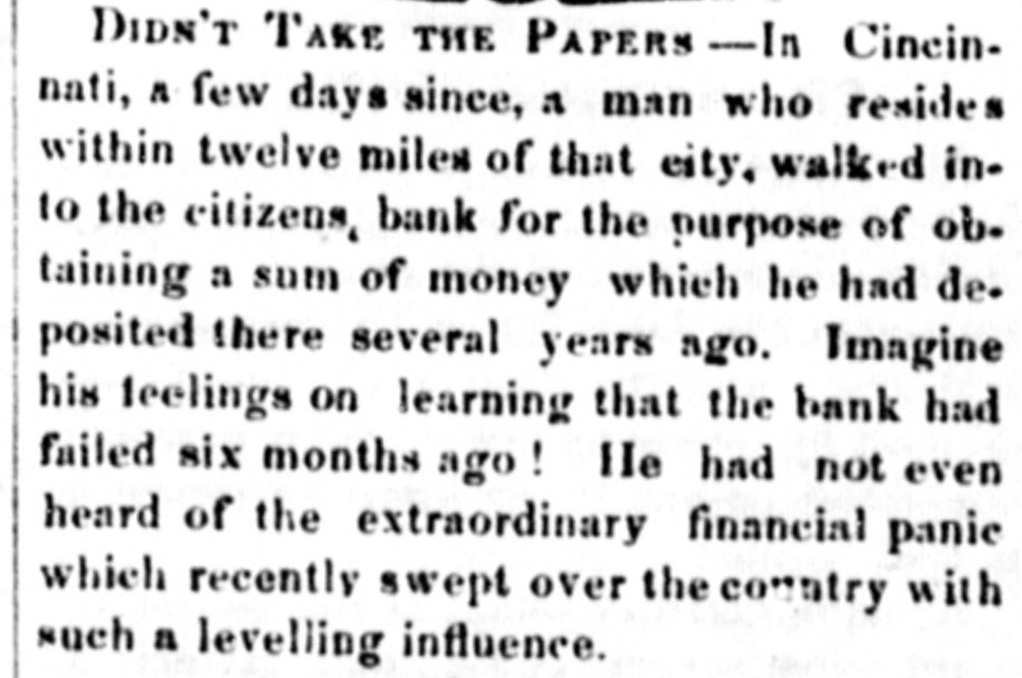 DIDN'T TAKE THE PAPERS -In Cincinnati, n few days since, n man who resides within twelve miles of that city, walked into the citizens, bank for the purpose of ob. taining a sum of money which he had de. posited there several years ago. Imagine his feelings on learning that the bank had failed six months ago! He had not even heard of the extraordinary financial panie which recently swept over the country with such a levelling influence.