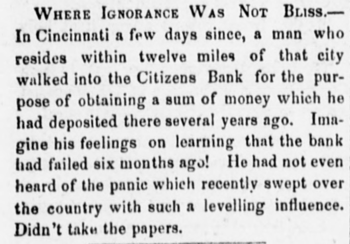 WHERE IGNORANCE WAS NOT BLISS.In Cincinnati a few days since, a man who resides within twelve miles of that city walked into the Citizens Bank for the purpose of obtaining a sum of money which he had deposited there several years ago. Imagine his feelings on learning that the bank had failed six months ago! He had not even heard of the panic which recently swept over the country with such a levelling influence. Didn't take the papers.