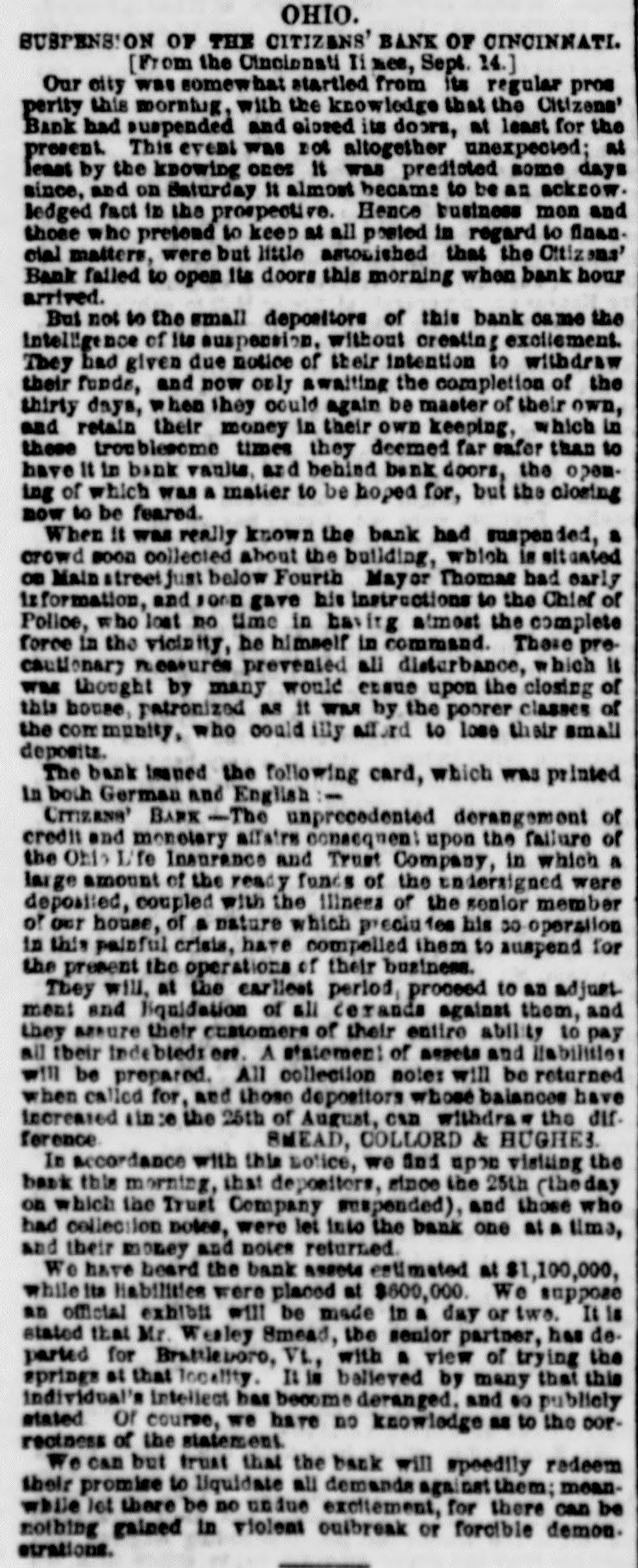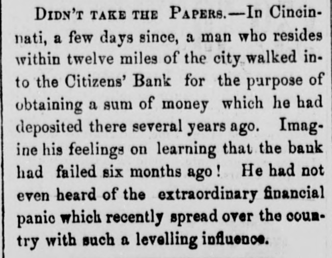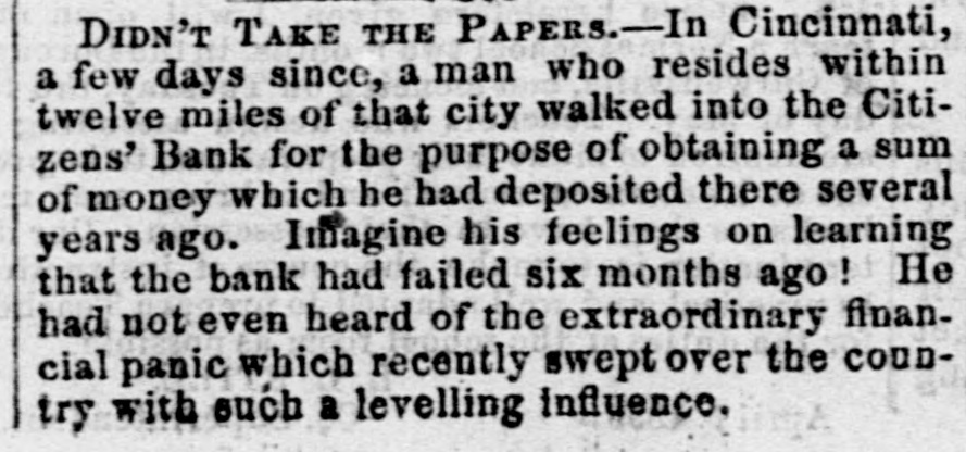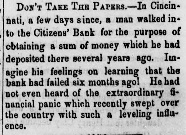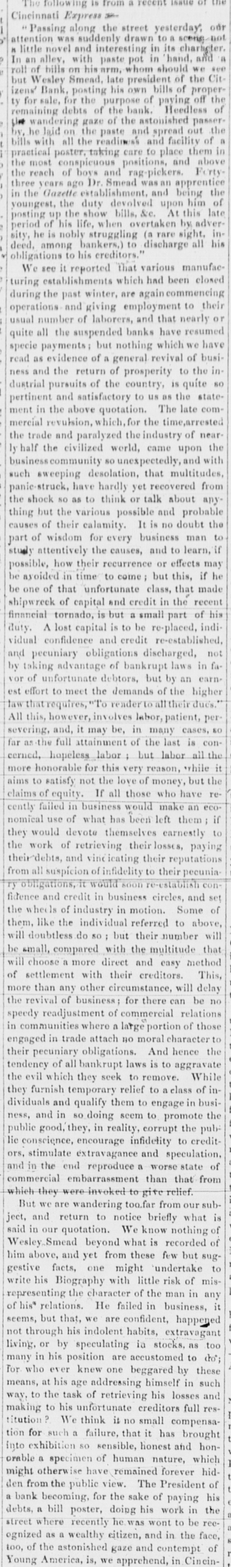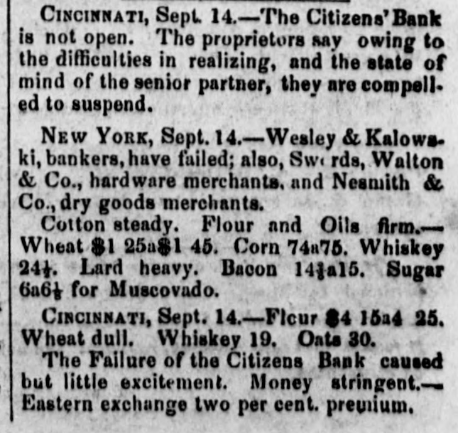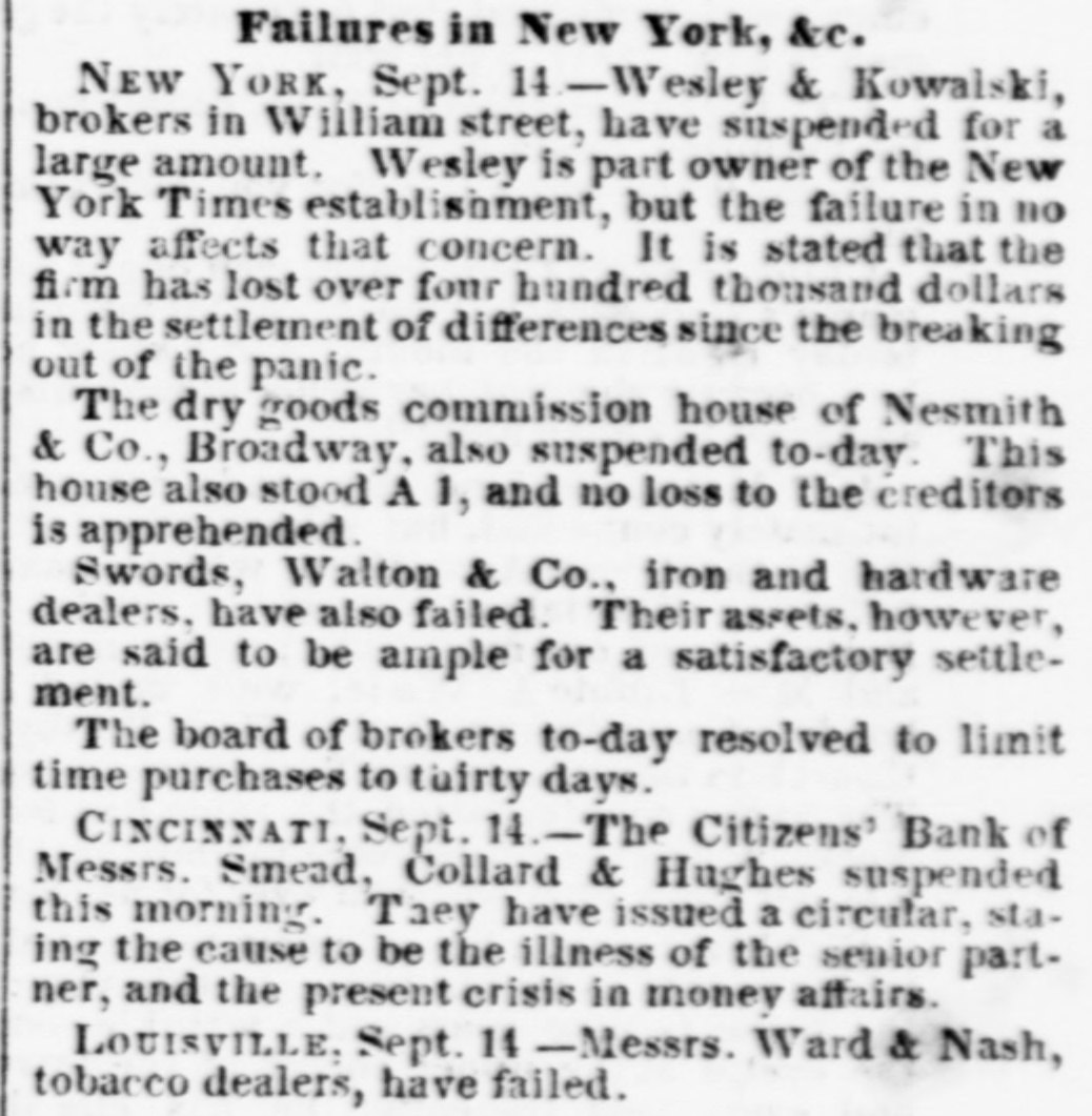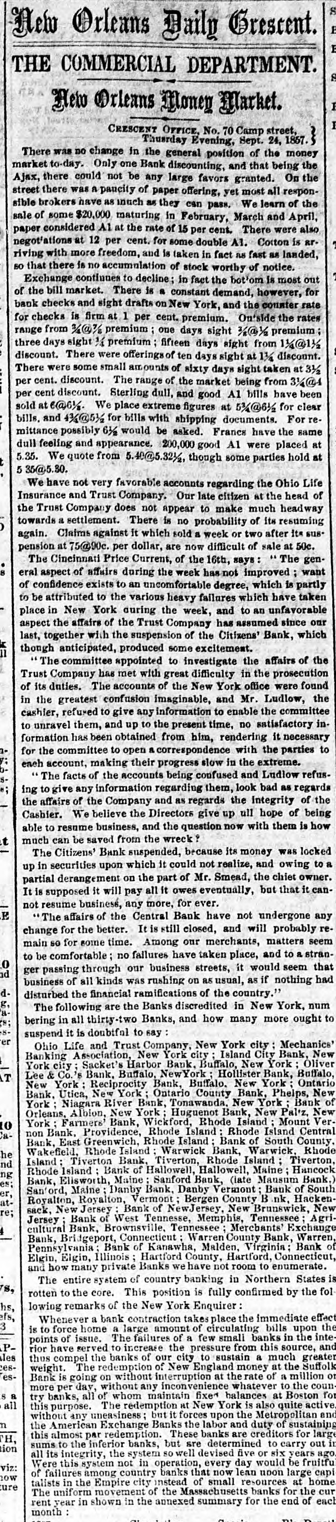 Dew Orleans Daily Grescent. THE COMMERCIAL DEPARTMENT. New Orleans Money Market. CRESCENT OFFICE. No. 70 Camp street, Thurrday Evening, Sept. 24, 1857. There was no change in the general position of the money market to-day. Only one Bank discounting, and that being the Ajax, there could not be any large favors granted. On the street there was A pancity of paper offering, yet most all responsible brokers have as much as they can pass. We learn of the sale of some $20,000 maturing in February, March and April, paper considered A1 at the rate of 15 per cent. There were also negotiations at 12 per cent. for some double A1. Cotton is Rr. riving with more freedom, and is taken in fact as fast as landed, so that there is no accumulation of stock worthy of notice. Exchange continues to decline; in fact the bot'om is most out of the bill market. There is a constant demand, however, for bank checks and sight drafts on New York, and the counter rate for checks is firm at 1 per cent. premium. Outside the rates range from 3/4% premium one days sight premium three days sight 1/4 premium fifteen days sight from 11/411/2 discount. There were offerings of ten days sight at 11/4 discount. There were some small amounts of sixty days sight taken at 31/2 per cent. discount. The range of the market being from 31/44 per cent discount. Sterling dull, and good A1 bills have been sold at 6@61/2. We place extreme figures at 53/@61/2 for clear bills. and 43/4551/2 for bills with shipping documents. For remittance possibly 61/2 would be asked. Francs have the same dull feeling and appearance. 200,000 good A1 were placed at 5.35. We quote from 5.40@5.321/2, though some parties hold at 5 35@5.30. We have not very favorable accounts regarding the Ohio Life Insurance and Trust Company. Our late citizen at the head of the Trust Company does not appear to make much headway towards a settlement. There is no probability of its resuming again. Claims against it which sold a week or two after its sus* pension at 75@90c. per dollar, are now difficult of sale at 50c. The Cincinnati Price Current, of the 16th, says The general aspect of affairs during the week has not improved want of confidence exists to an uncomfortable degree, which is partly to be attributed to the various heavy failures which have taken place in New York during the week, and to an unfavorable aspect the affairs of the Trust Company has assumed since our last, together with the suspension of the Citizens Bank, which though anticipated, produced some excitement. The committee appointed to investigate the affairs of the Trust Company has met with great difficulty in the prosecution of its duties. The accounts of the New York office were found in the greatest confusion imaginable, and Mr. Ludlow, the cashier, refused to give any information to enable the committee to unravel them, and up to the present time, no satisfactory in. formation has been obtained from him, rendering it necessary to for the committee to open a correspondence with the parties each account, making their progress slow in the extreme. The facts of the accounts being confused and Ludiow refusing to give any information regarding them, look bad as regards the affairs of the Company and as regards the Integrity of the Cashier. We believe the Directors give up ull hope of being able to resume business, and the question now with them is how t much can be saved from the wreck The Citizens' Bank suspended, because its money was locked up in securities upon which it could not realize, and owing to a partial derangement on the part of Mr. Smead, the chiet owner. It is supposed it will pay all it owes eventually, but that it cannot resume business, any more, for ever. E The affairs of the Central Bank have not undergone any change for the better. It is still closed, and will probably remain so for some time. Among our merchants, matters seem to be comfortable; no failures have taken place, and to a strano nd ger passing through our business streets, it would seem that business of all kinds was rushing on as usual, as if nothing had ddisturbed the financial ramifications of the country.' g. aThe following are the Banks discredited in New York, num 's: bering in all thirty-two Banks, and how many more ought to 8. suspend it is doubtful to say er Ohio Life and Trust Company, New York city Mechanics Banking Association, New York city Island City Bank, New York city ; Sacket's Harbor Bank. Buffalo, New York : Oliver T Lee & Co.'s Bank, Buffalo, NewYork Hollister Bank, Buffalo, New York : Reciprocity Bank, Buffalo. New York: Ontario Bank. Utica, New York Ontario County Bank, Phelps, New York: Niagara River Bank, Tonawanda, New York Bank of Albion, New York ; Huguenot Bank, New Paltz. New 10 Orleans, York: Farmers' Bank, Wickford, Rhode Island Mount VerCaBank, Providence, Rhode Island Rhode Island Central non East Greenwich, Rhode Island Bank of South County the Bank. Wakefield, Rhode Island Warwick Bank, Warwick, Rhode nd Island Tiverton Bank. Tiverton, Rhode Island Tiverton, ng Rhode Island ; Bank of Hallowell, Hallowell, Maine; Hancock es: Elisworth, Maine Sanford Bank, (late Mansum Bank. er, Bank, Maine Danby Bank Danby Vermont Bank of South atSanford, Royalton, Royalton, Vermont Bergen County B nk. Hackenre; sack. New Jersey Bank of NewJersey, New Brunswick, New Bank of West Tennesse, Memphis, Tennessee Agri4 cultural Jersey Bank, Brownsville, Tennessee ; Merchants' Exchange Bank, Bridgeport, Connecticut : Warren County Bank, Warren, Pennsylvania Bank of Kanawha, Malden, Virginia: Bank of Elgin, Elgin, Illinois Hartford County, Hartford, Connecticut, and how many private Banks we have not room to enumerate. The entire system of country banking in Northern States is s, rotten to the core. This position is fully confirmed by the fol hs, lowing remarks of the New York Enquirer efs, Whenever a bank contraction takes place the immediate effect 3 is to force home a large amount of circulating bills upon the 