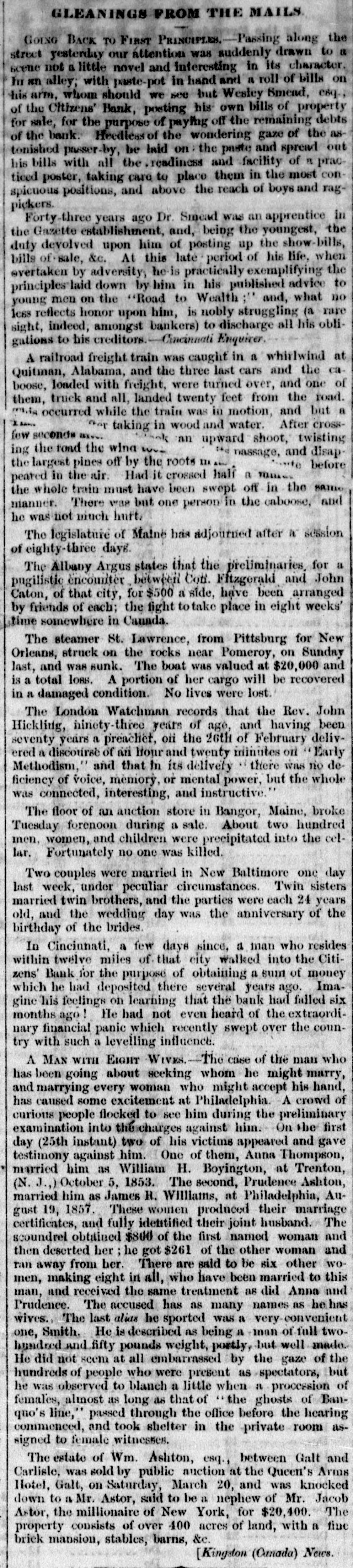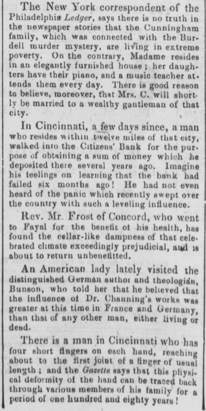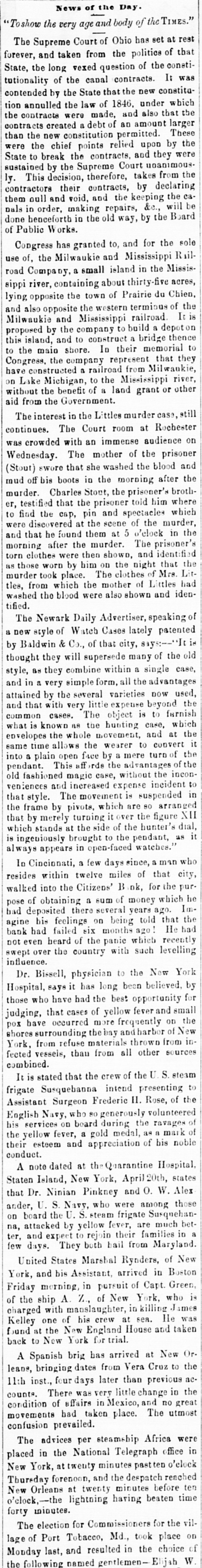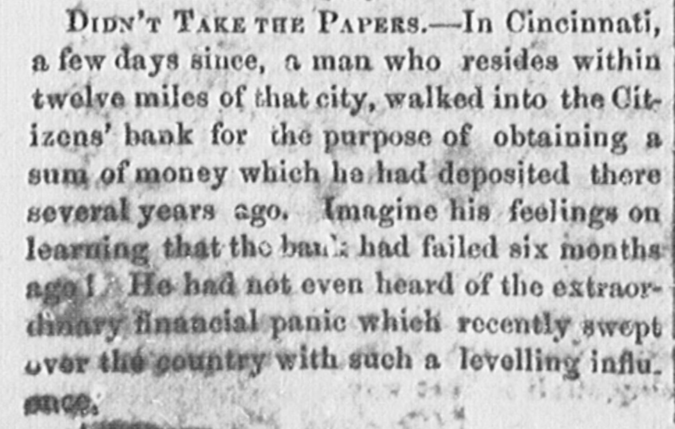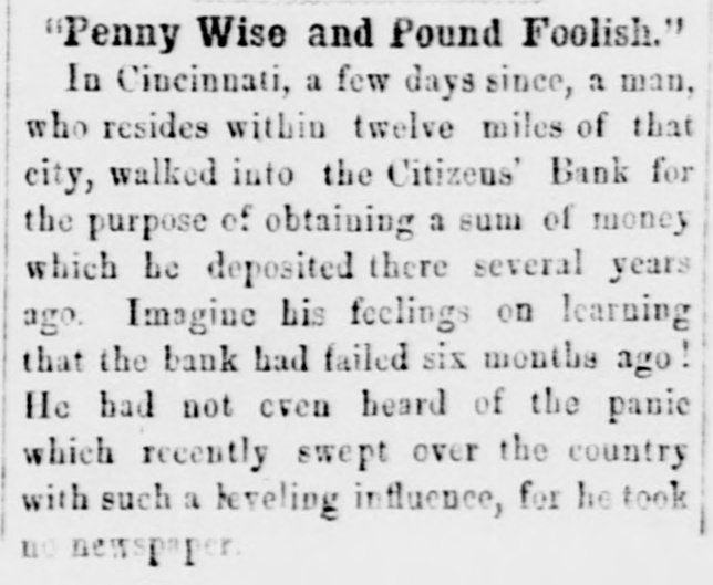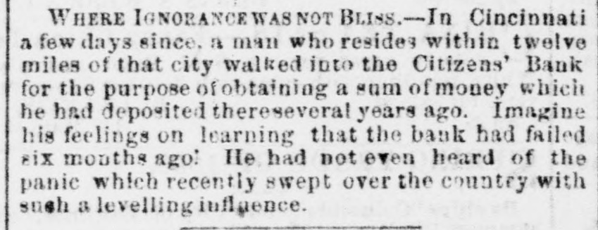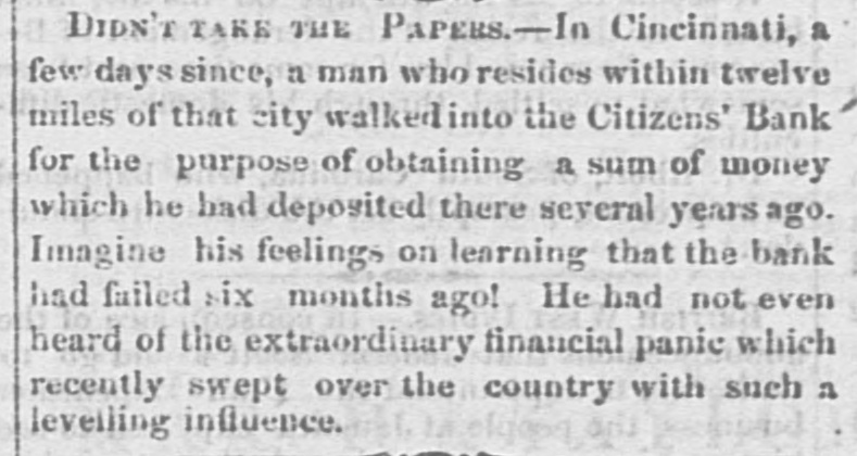 Dew Orleans Daily Grescent. THE COMMERCIAL DEPARTMENT. New Orleans Money Market. CRESCENT OFFICE. No. 70 Camp street, Thurrday Evening, Sept. 24, 1857. There was no change in the general position of the money market to-day. Only one Bank discounting, and that being the Ajax, there could not be any large favors granted. On the street there was A pancity of paper offering, yet most all responsible brokers have as much as they can pass. We learn of the sale of some $20,000 maturing in February, March and April, paper considered A1 at the rate of 15 per cent. There were also negotiations at 12 per cent. for some double A1. Cotton is Rr. riving with more freedom, and is taken in fact as fast as landed, so that there is no accumulation of stock worthy of notice. Exchange continues to decline; in fact the bot'om is most out of the bill market. There is a constant demand, however, for bank checks and sight drafts on New York, and the counter rate for checks is firm at 1 per cent. premium. Outside the rates range from 3/4% premium one days sight premium three days sight 1/4 premium fifteen days sight from 11/411/2 discount. There were offerings of ten days sight at 11/4 discount. There were some small amounts of sixty days sight taken at 31/2 per cent. discount. The range of the market being from 31/44 per cent discount. Sterling dull, and good A1 bills have been sold at 6@61/2. We place extreme figures at 53/@61/2 for clear bills. and 43/4551/2 for bills with shipping documents. For remittance possibly 61/2 would be asked. Francs have the same dull feeling and appearance. 200,000 good A1 were placed at 5.35. We quote from 5.40@5.321/2, though some parties hold at 5 35@5.30. We have not very favorable accounts regarding the Ohio Life Insurance and Trust Company. Our late citizen at the head of the Trust Company does not appear to make much headway towards a settlement. There is no probability of its resuming again. Claims against it which sold a week or two after its sus* pension at 75@90c. per dollar, are now difficult of sale at 50c. The Cincinnati Price Current, of the 16th, says The general aspect of affairs during the week has not improved want of confidence exists to an uncomfortable degree, which is partly to be attributed to the various heavy failures which have taken place in New York during the week, and to an unfavorable aspect the affairs of the Trust Company has assumed since our last, together with the suspension of the Citizens Bank, which though anticipated, produced some excitement. The committee appointed to investigate the affairs of the Trust Company has met with great difficulty in the prosecution of its duties. The accounts of the New York office were found in the greatest confusion imaginable, and Mr. Ludlow, the cashier, refused to give any information to enable the committee to unravel them, and up to the present time, no satisfactory in. formation has been obtained from him, rendering it necessary to for the committee to open a correspondence with the parties each account, making their progress slow in the extreme. The facts of the accounts being confused and Ludiow refusing to give any information regarding them, look bad as regards the affairs of the Company and as regards the Integrity of the Cashier. We believe the Directors give up ull hope of being able to resume business, and the question now with them is how t much can be saved from the wreck The Citizens' Bank suspended, because its money was locked up in securities upon which it could not realize, and owing to a partial derangement on the part of Mr. Smead, the chiet owner. It is supposed it will pay all it owes eventually, but that it cannot resume business, any more, for ever. E The affairs of the Central Bank have not undergone any change for the better. It is still closed, and will probably remain so for some time. Among our merchants, matters seem to be comfortable; no failures have taken place, and to a strano nd ger passing through our business streets, it would seem that business of all kinds was rushing on as usual, as if nothing had ddisturbed the financial ramifications of the country.' g. aThe following are the Banks discredited in New York, num 's: bering in all thirty-two Banks, and how many more ought to 8. suspend it is doubtful to say er Ohio Life and Trust Company, New York city Mechanics Banking Association, New York city Island City Bank, New York city ; Sacket's Harbor Bank. Buffalo, New York : Oliver T Lee & Co.'s Bank, Buffalo, NewYork Hollister Bank, Buffalo, New York : Reciprocity Bank, Buffalo. New York: Ontario Bank. Utica, New York Ontario County Bank, Phelps, New York: Niagara River Bank, Tonawanda, New York Bank of Albion, New York ; Huguenot Bank, New Paltz. New 10 Orleans, York: Farmers' Bank, Wickford, Rhode Island Mount VerCaBank, Providence, Rhode Island Rhode Island Central non East Greenwich, Rhode Island Bank of South County the Bank. Wakefield, Rhode Island Warwick Bank, Warwick, Rhode nd Island Tiverton Bank. Tiverton, Rhode Island Tiverton, ng Rhode Island ; Bank of Hallowell, Hallowell, Maine; Hancock es: Elisworth, Maine Sanford Bank, (late Mansum Bank. er, Bank, Maine Danby Bank Danby Vermont Bank of South atSanford, Royalton, Royalton, Vermont Bergen County B nk. Hackenre; sack. New Jersey Bank of NewJersey, New Brunswick, New Bank of West Tennesse, Memphis, Tennessee Agri4 cultural Jersey Bank, Brownsville, Tennessee ; Merchants' Exchange Bank, Bridgeport, Connecticut : Warren County Bank, Warren, Pennsylvania Bank of Kanawha, Malden, Virginia: Bank of Elgin, Elgin, Illinois Hartford County, Hartford, Connecticut, and how many private Banks we have not room to enumerate. The entire system of country banking in Northern States is s, rotten to the core. This position is fully confirmed by the fol hs, lowing remarks of the New York Enquirer efs, Whenever a bank contraction takes place the immediate effect 3 is to force home a large amount of circulating bills upon the 