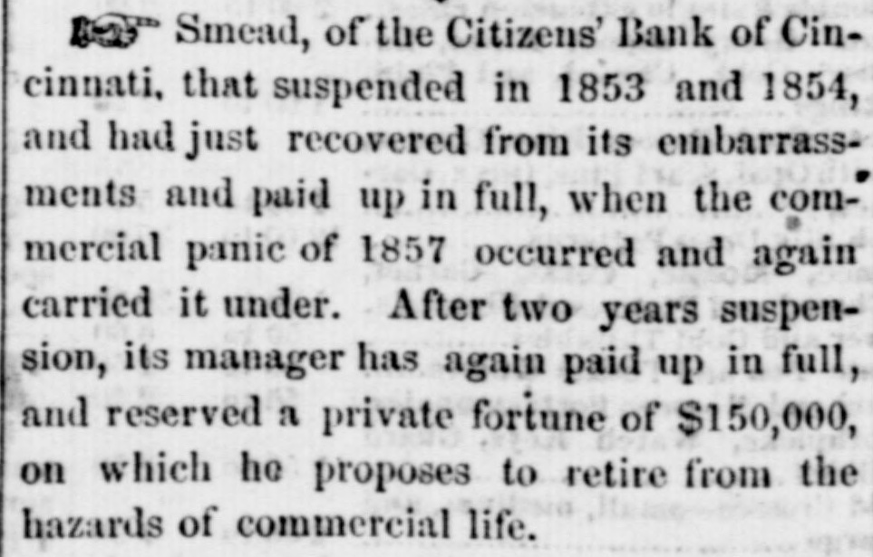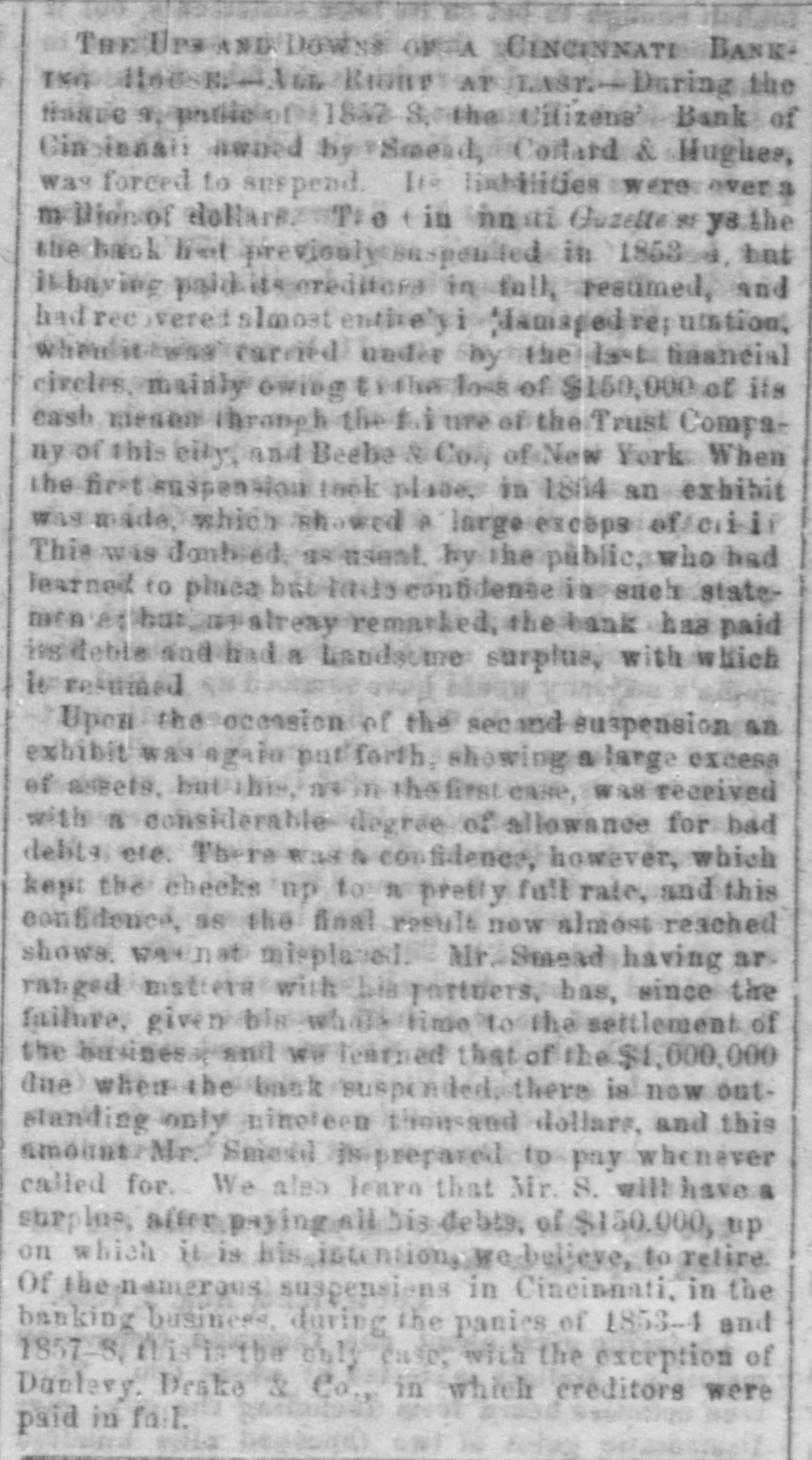 THE Upa AND Downs GRINA CINCINNATI BANK TNG Aus Review AT LAST. During the travie 9. prille 1852 S. the Citizens' Bank of Cin innai awned by Smead, Collard & Hugher, was forced to suppend. Its liabilities were over 3 m liten of dollars. The in in ai Guzette 9F ys the the back list in 1858 4, but is baying paidits creditora in fall, resumed, and had rec vered slmost entirely 'damaged re; utation, whenlie twis carried under by the last financial circles, mainly owing time loss of $160,000 of its cash mesen through the M time of the Trust Company of this bilys and Beebe & Coll of New York When the first suspension took plane. in 1804 an exhibit was made, which showed a large exceps of/eri-ir This wis donbied as usent. by the pâblic, who had learned to phica but tads confidence is suels statenea has any alreay remarked, the bank has paid its debts and had a linudsture surplus, with which le resumed Upon the ocession of the second suspension an exhibit was again put forth, showing a large excess of albets, but this win the first case, was received with a considerable degrée of allowance for had delite etc. There was a confidence, however, which kepit the checks to n pretty full rate, and this ear Edence, as the final result now almost reached shows. wernati misplaced Mr Smead having arranged mistiers with his partners, has, since the failure. given bis white time to the settlement of the busines unit We learned that of the $1,000, 000 due where the bank suspended there is now outstanding only nineteen thousand dollars, and this smount Mr. Smield is prepared to pay whenever called for. We alea learn that Mr. S. will have a supplies after paying all bis debts, of $150.000, up on which it is his iste nions we believe, to retire Of the numerous suspension in Cineinnati, in the banking business during the panics of 1853-4 and 1857-8, the only with the exception of Daplery Drake & Co. in which creditors were paid in fail.