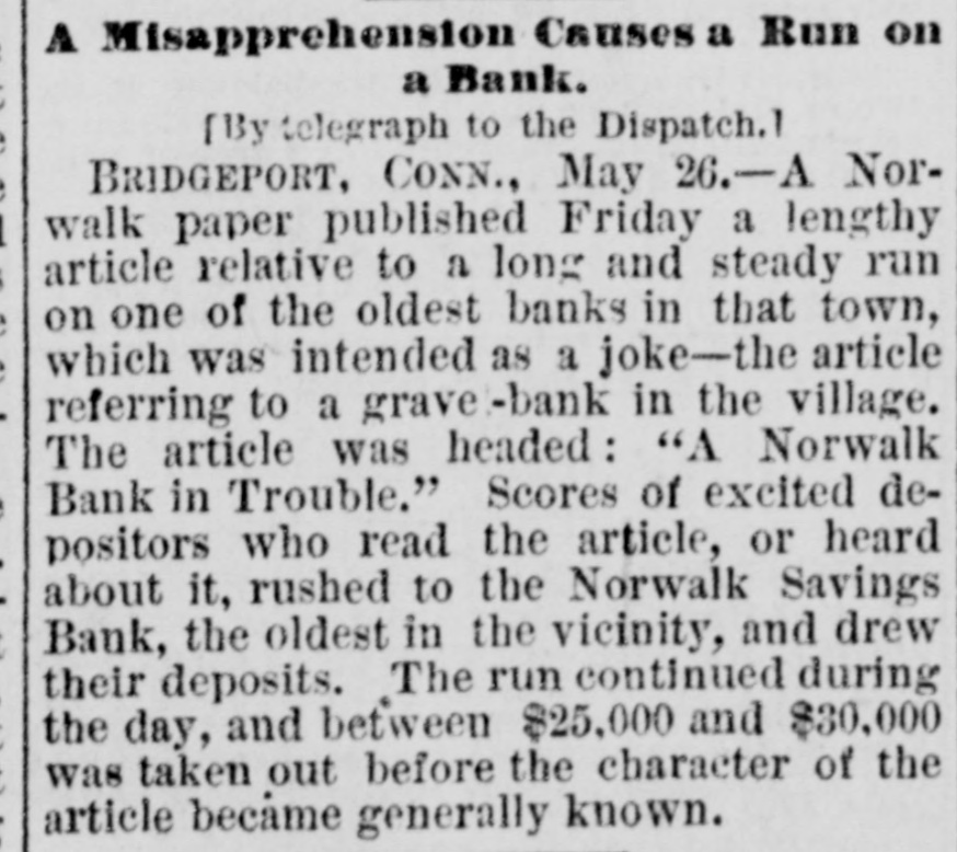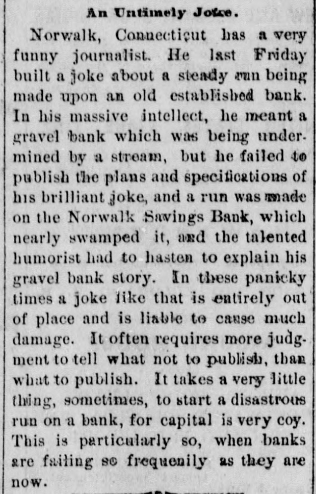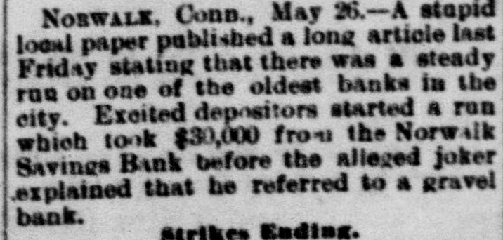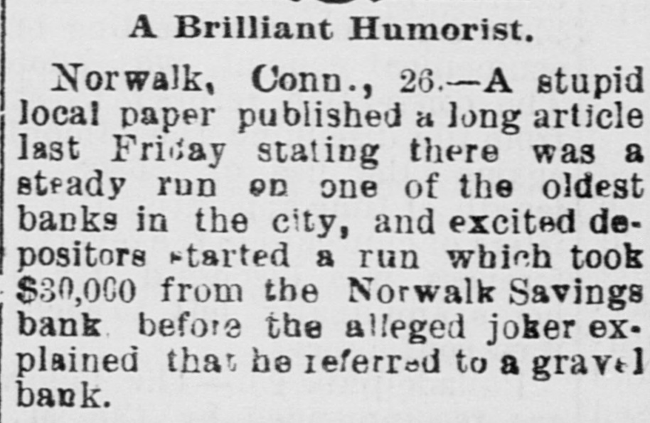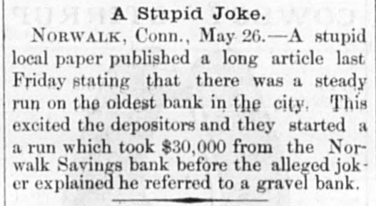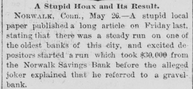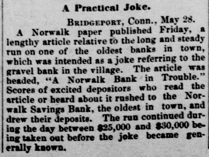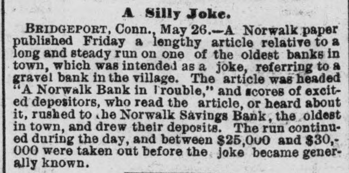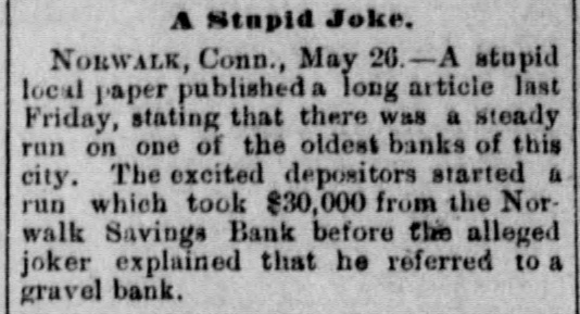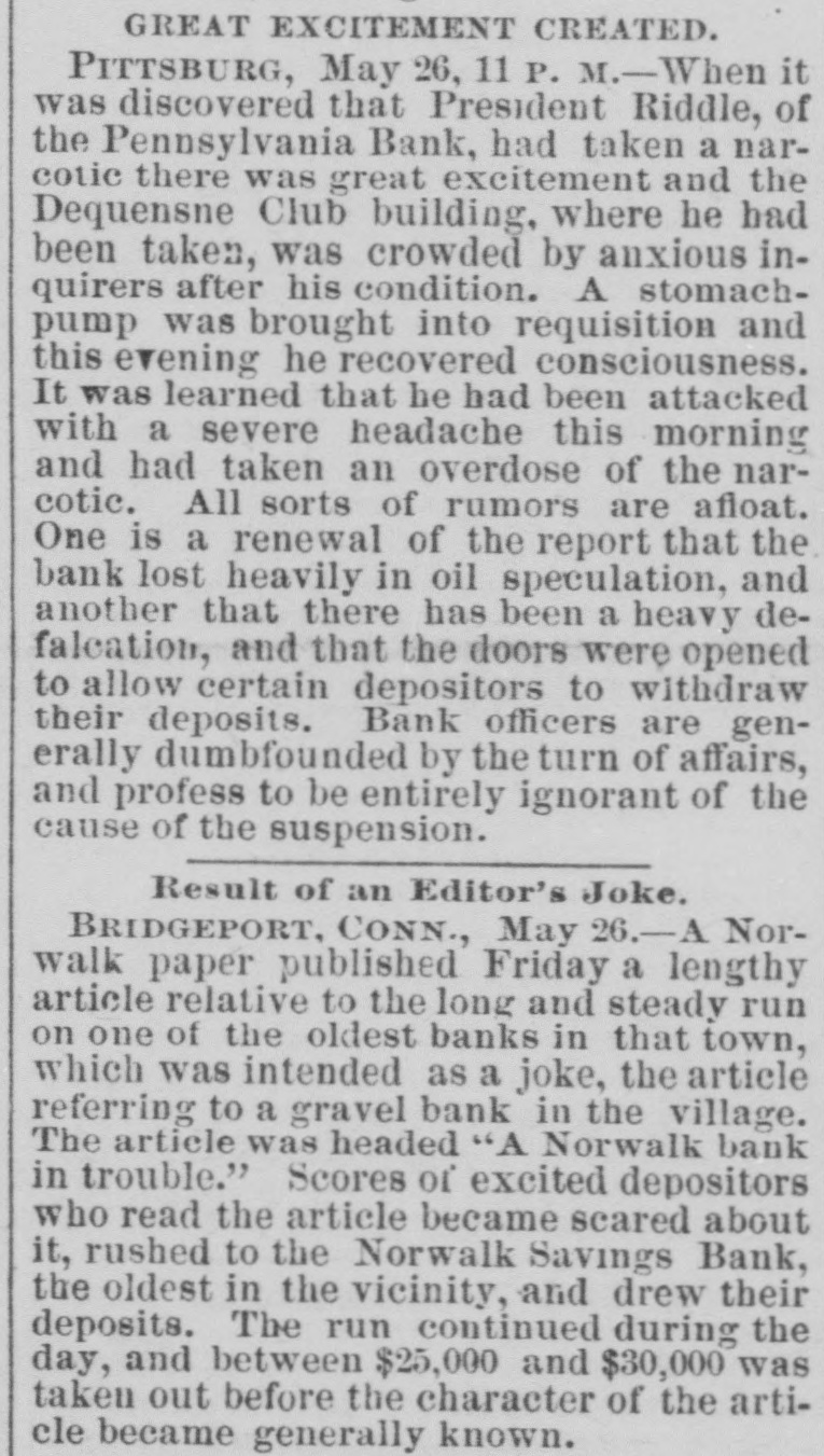 GREAT EXCITEMENT CREATED. PITTSBURG, May 26, 11 P. M.-When it was discovered that President Riddle, of the Pennsylvania Bank, had taken a narcotic there was great excitement and the Dequensne Club building, where he had been taken, was crowded by anxious inquirers after his condition. A stomachpump was brought into requisition and this evening he recovered consciousness. It was learned that he had been attacked with a severe headache this morning and had taken an overdose of the narcotic. All sorts of rumors are afloat. One is a renewal of the report that the bank lost heavily in oil speculation, and another that there has been a heavy defalcation, and that the doors were opened to allow certain depositors to withdraw their deposits. Bank officers are generally dumbfounded by the turn of affairs, and profess to be entirely ignorant of the cause of the suspension. Result of an Editor's Joke. BRIDGEPORT, CONN., May 26.-A Norwalk paper published Friday a lengthy article relative to the long and steady run on one of the oldest banks in that town, which was intended as a joke, the article referring to a gravel bank in the village. The article was headed "A Norwalk bank in trouble." Scores of excited depositors who read the article became scared about it, rushed to the Norwalk Savings Bank, the oldest in the vicinity, and drew their deposits. The run continued during the day, and between $25,000 and $30,000 was taken out before the character of the article became generally known.