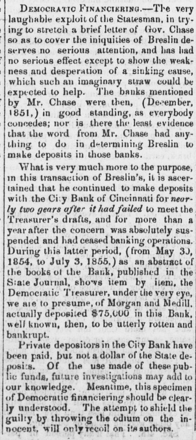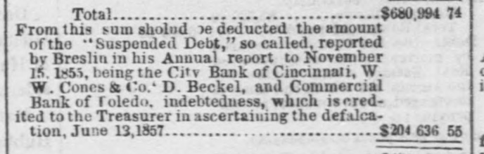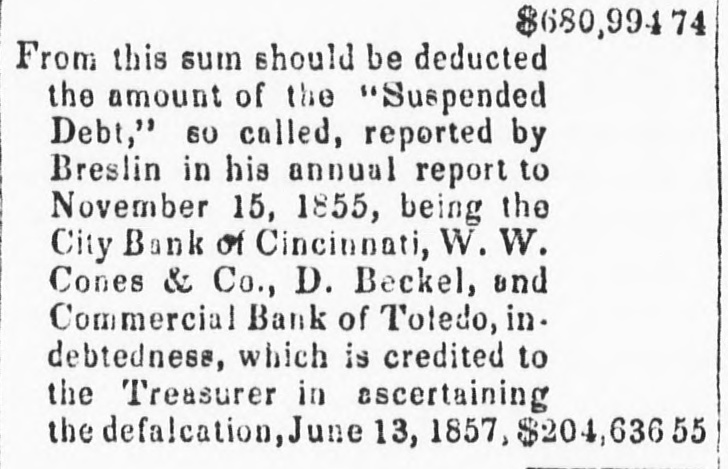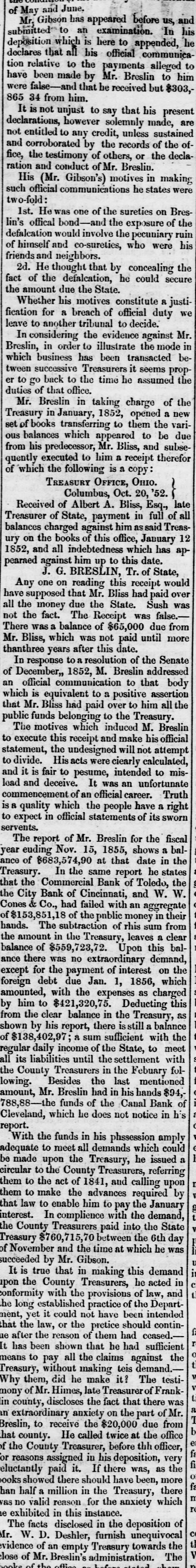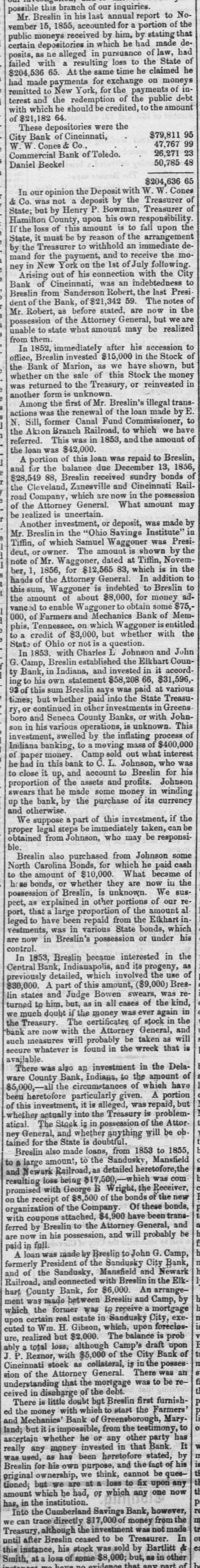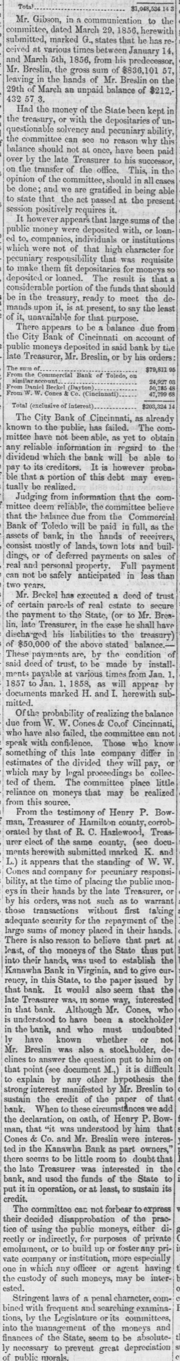 Total to the communication herewith committee, Gibson, in March a 29, 1856, that he has submitted, Mr. marked dated times G., states between his predecessor January ceived at various 5th, 1856, sum from of $836,101 on the March gross Mr. Breslin $212, 3. of unand leaving 29th Mr. Breslin, of in March the the hands an unpaid of State balance been of kept in 432 57 3 Had the money with of the the depositaries pecuniary ability, this the treasury, solvency or see and no reason been why paid the questionable: committee can not al once, to have his successor, the balance should late Treasurer office. This, all in over by the of the should in of and the we are at the $ on opinion be done; the transfer that the committee, requires act gratified passed it. in sums being present of cases able the session to state positively that large with, or loanapped institutions It however money were individuals or character public ed to, companies. It not that that high was requisite is pecuniary which were them fit depositaries The result for that moneys should that to make or loaned. of the funds meet the deready to the for be in it, is at that purpose. considerable deposited mands unavailable the upon treasury, portion present, balance to say due from least of of it, to be a on account the bank by Treasurer, the the public There City moneys appears Bank Mr. deposited of Cincinnati Breslin, in said or by his $79,811 orders: Countries 24,927 The late sum Commercial Bank of Toledo, on From W. W. Cones From similarace Beckel & (Day Co. (Cincinnati) $203,324.14 From Total (exclusive of interest) of Cincinnati, as The already comThe City Bank public, has failed. as yet to obtain the known have to the not been able, in regard able to to It is any mittee reliable which information the bank will however be proba- evenble that a dividend pay to its creditors. portion of this debt may the comtually be realized. from information committee that believe Judging deem reliable, from the the Commercial as the mittee that the balance will due be paid in of full, receivers, Bank of Toledo bank, in the hands town lots and buil- of assets of of lands, on sales consist mostly of deferred payments Full payment than real dings, and or personal safely property. anticipated in less trust can two Mr. not years. Beckel be parcels has of executed State, real estate (or a deed to to shall Mr. of secure Bres- have of the certain payment to the in the case the he treasury) the discha-ged lin, late Treasurer, his of the liabilities above stated to condition balance.of $50,000 are, by made by installThese payments of trust, to be times from Jan. by 1, said deed payable at various as will appear subdocuments mitted. the the ments 1857 to Jan. marked 1. 1858, H. and I. herewith balance probability of realizing & Co.of Cincinnati, can not due Of from W. also W. failed, Cones the Those committee who know in who have with confidence. late company differ pay, or something speak of the this divided they will be collecestimates of by legal committee proceedings place little reliance the From ted which of may them. on moneys The that may be P. realized BowHamilton from this source. testimony of Henry county, corrobTreasman, that of county, Treasurer of R. C. Hazlewood, (300 docuit appears for the public orated urer ments L.) elect herewith and by of company the that submitted same the placing standing pecuniary marked Treasurer, of responsi- K. W. mon- and W. Cones at the time of the late warrant eys in bility, their hands was by not such as first to taking his orders, without of the by transactions the repayment hands. those security for placed in their adequate of money believe that part large sums also reason to the State thus the put There of is the moneys of used to establish curleast, their hands, in was Virginia, and to issued give by to the that the into Kanawha in this Bank State, would also paper seem interested rency, that bank. It was, in some way, Cones, who late Treasurer bank. Although Mr. a stockholder in that to have been undoubted is bank, and whether in understood the known who must stoch holder, or not de- on lv have was also a to him Mr. Breslin answer the question M., put it is difficult the point (see any other Mr. Breslin to to interest of the paper we sustain strong that clines explain to the by credit manifested document circumstances by hypothesis of Bow- that add When to these of Henry P. that bank. the declaration, on understood oath, by him interes& Co. and Bank as part Cones man, in that the Kanawha "it was Mr. Breslin room to were doubt owners, that the there ted seems to be little was interested State in to to forbear bank, put the it late in and Treasurer operation, used the or funds at least, of the to sustain express its their tice credit. The of decided committee using the disapprobation public car for not purposes moneys, of of either the any private prac- pri- directly or indirectly, to build up or foster especially having emolument, vate which or or institution, more agent may company any officer or be interthe one custody in of such moneys, ested. laws of a penal searching character, examina- comwith frequent or its committees, and bined Stringent by the Legislature and of the moneys tions, into the management seem to be absolutepublic morals. ly finances necessary of the to State, prevent great depreciation