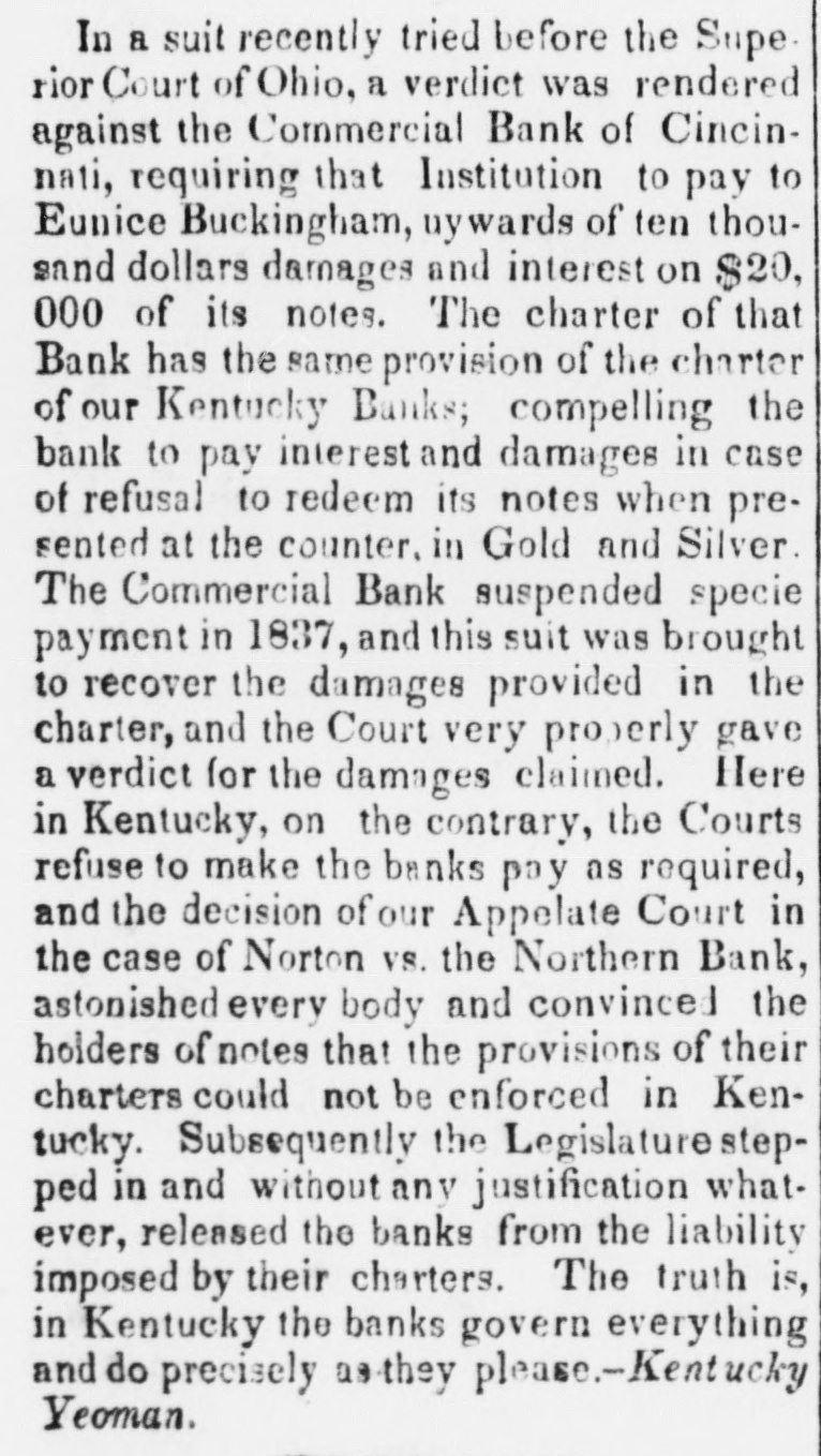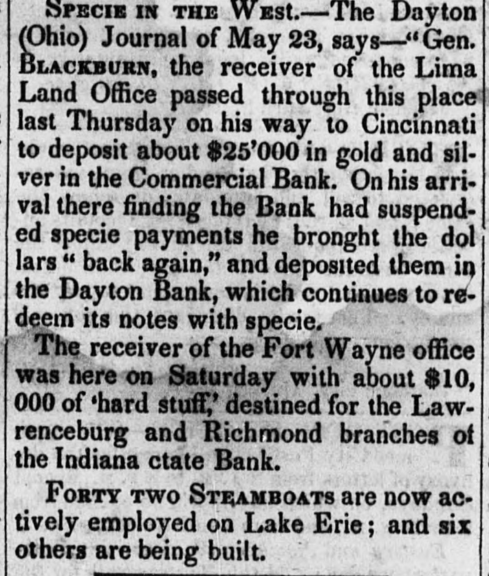 SPECIE IN THE WESt.-The Dayton (Ohio) Journal of May 23, says-" Gen. BLACKBURN, the receiver of the Lima Land Office passed through this place last Thursday on his way to Cincinnati to deposit about $25'000 in gold and silver in the Commercial Bank. On his arrival there finding the Bank had suspended specie payments he bronght the dol lars back again," and deposited them in the Dayton Bank, which continues to redeem its notes with specie. The receiver of the Fort Wayne office was here on Saturday with about $10, 000 of 'hard stuff,' destined for the Lawrenceburg and Richmond branches of the Indiana ctate Bank. FORTY TWO STEAMBOATS are now actively employed on Lake Erie; and six others are being built.