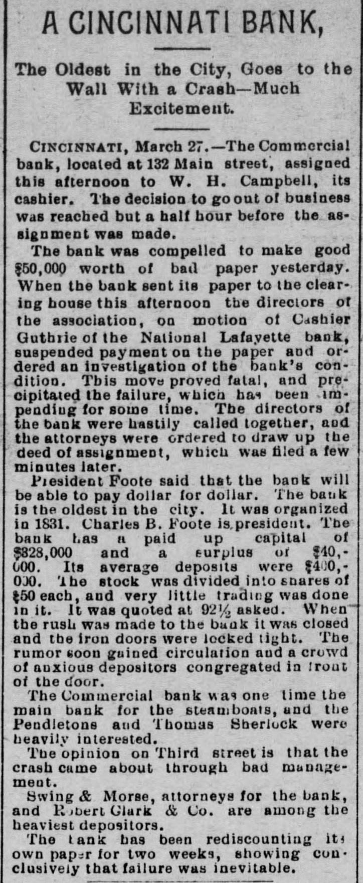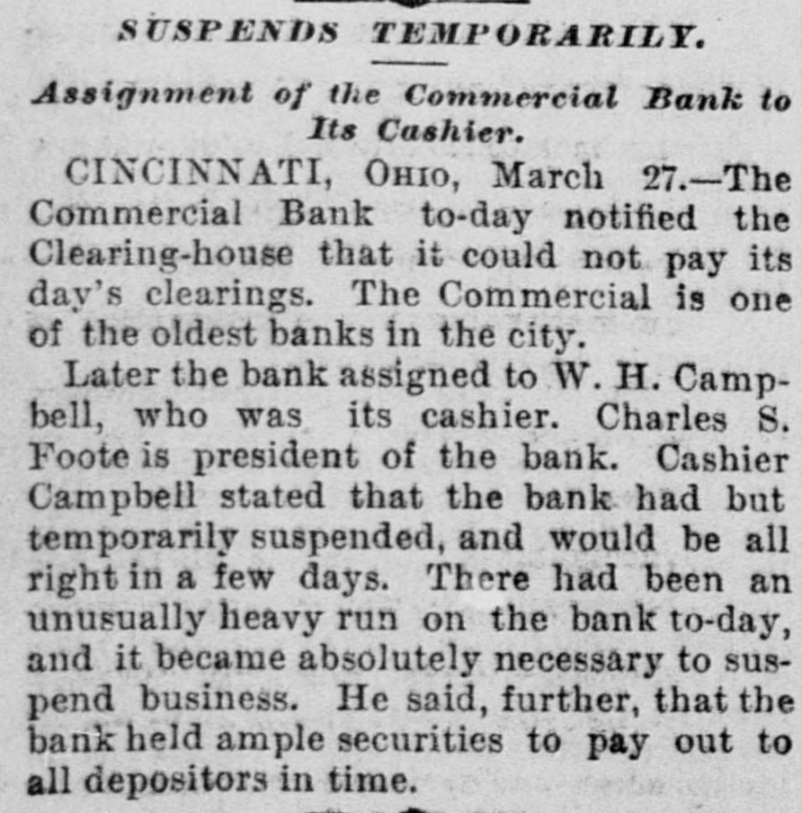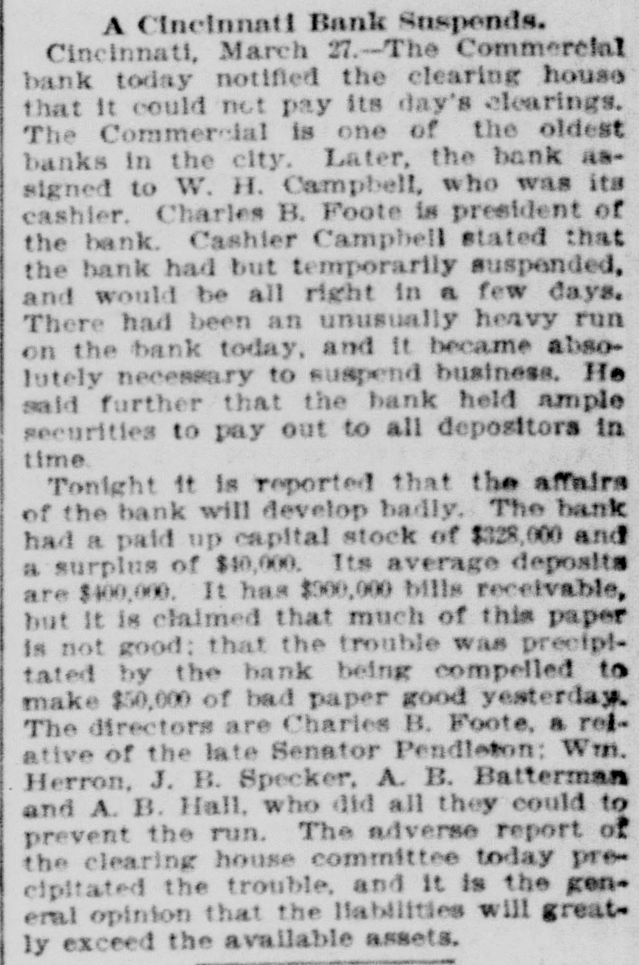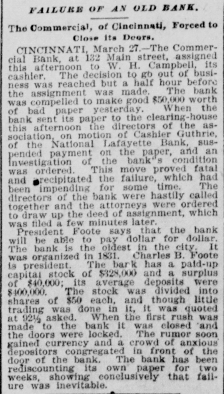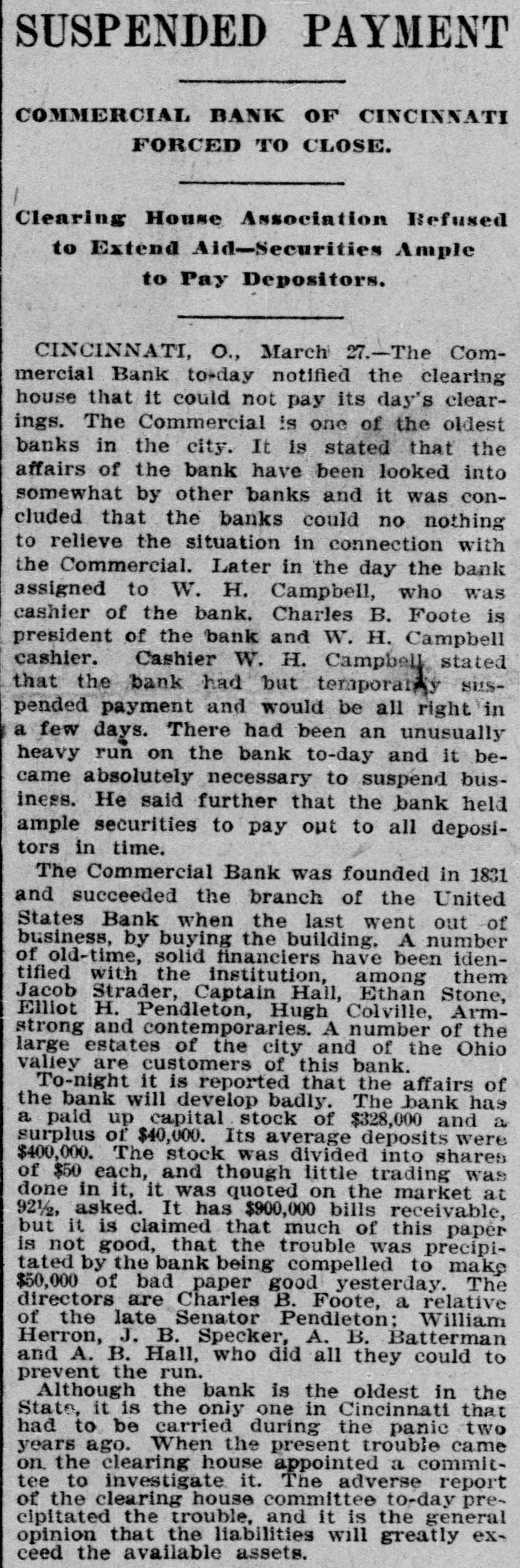 SUSPENDED PAYMENT COMMERCIAL BANK OF CINCINNATI FORCED TO CLOSE. Clearing House Association Refused to Extend Aid-Securities Ample to Pay Depositors. CINCINNATI, O., March 27.-The Commercial Bank to-day notified the clearing house that it could not pay its day's clearings. The Commercial is one of the oldest banks in the city. It is stated that the affairs of the bank have been looked into somewhat by other banks and it was concluded that the banks could no nothing to relieve the situation in connection with the Commercial. Later in the day the bank assigned to W. H. Campbell, who was cashier of the bank. Charles B. Foote is president of the bank and W. H. Campbell cashier. Cashier W. H. Campbell stated that the bank had but temporary suspended payment and would be all right in a few days. There had been an unusually heavy run on the bank to-day and it became absolutely necessary to suspend business. He said further that the bank held ample securities to pay out to all depositors in time. The Commercial Bank was founded in 1831 and succeeded the branch of the United States Bank when the last went out of business, by buying the building, A number of old-time, solid financiers have been identified with the institution, among them Jacob Strader, Captain Hall, Ethan Stone, Elliot H. Pendleton, Hugh Colville, Armstrong and contemporaries. A number of the large estates of the city and of the Ohio valiey are customers of this bank. To-night it is reported that the affairs of the bank will develop badly. The bank has a paid up capital stock of $328,000 and a surplus of $40,000. Its average deposits were $400,000. The stock was divided into shares of $50 each, and though little trading was done in it, it was quoted on the market at 921/2, asked. It has $900,000 bills receivable, but it is claimed that much of this paper is not good, that the trouble was precipitated by the bank being compelled to make $50,000 of bad paper good yesterday. The directors are Charles B. Foote, a relative of the late Senator Pendleton: William Herron, J. B. Specker, A. B. Batterman and A. B. Hall, who did all they could to prevent the run. Although the bank is the oldest in the State, it is the only one in Cincinnati that had to be carried during the panic two years ago. When the present trouble came on the clearing house appointed a committee to investigate it. The adverse report of the clearing house committee to-day precipitated the trouble, and it is the general opinion that the liabilities will greatly exceed the available assets.