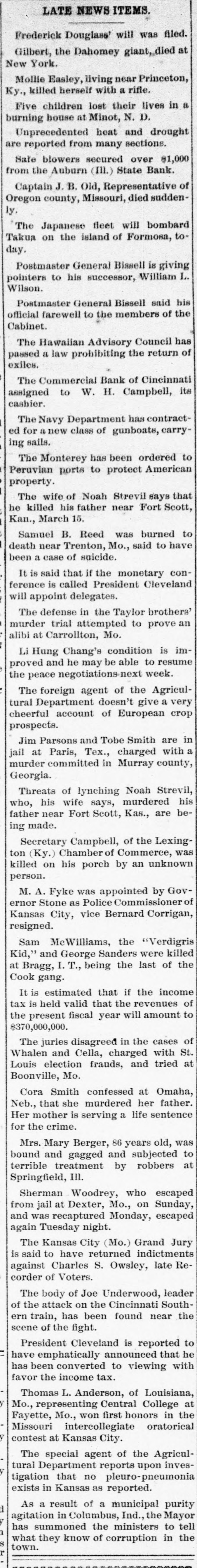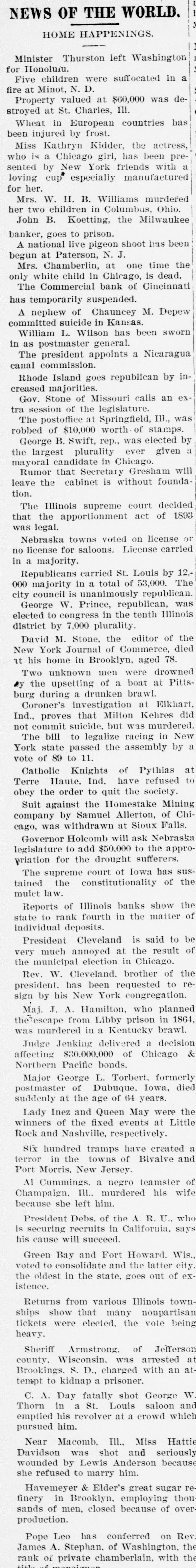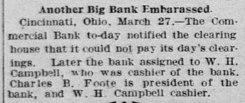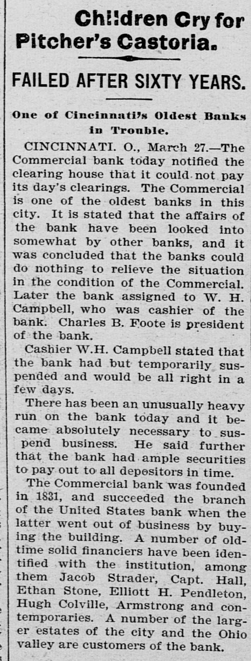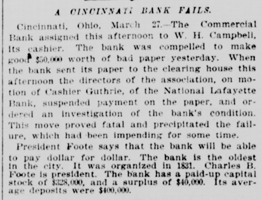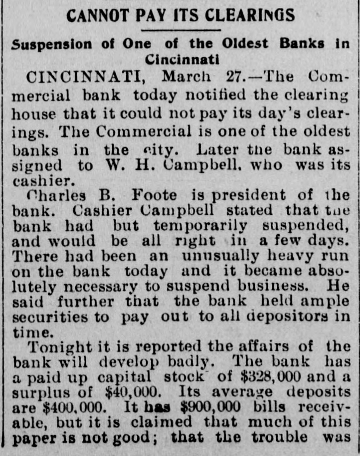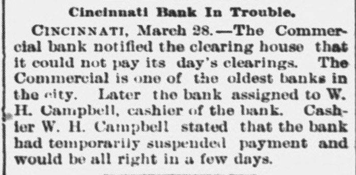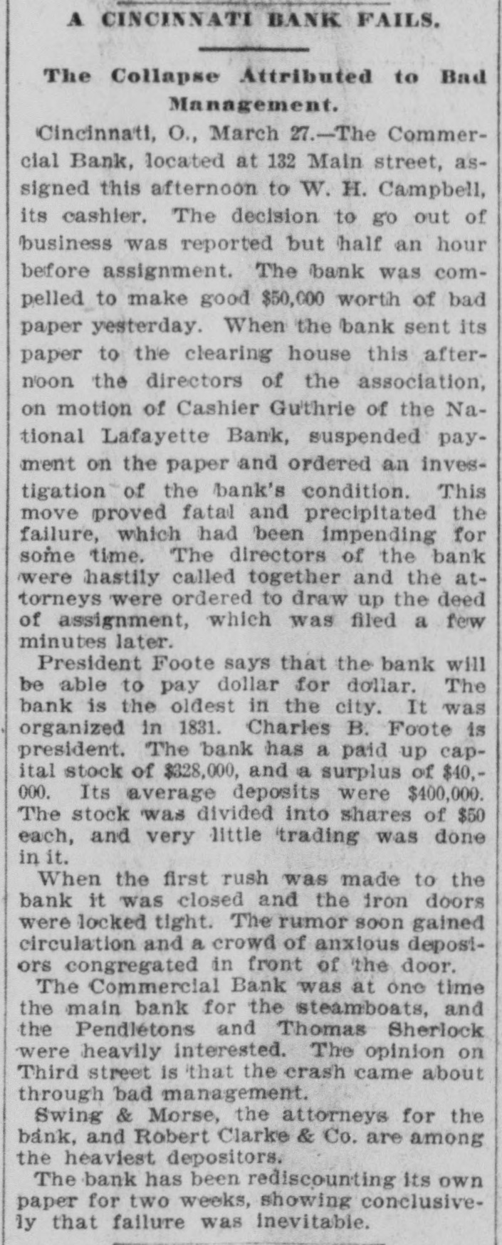SUSPENDED PAYMENT COMMERCIAL BANK OF CINCINNATI FORCED TO CLOSE. Clearing House Association Refused to Extend Aid-Securities Ample to Pay Depositors. CINCINNATI, O., March 27.-The Commercial Bank to-day notified the clearing house that it could not pay its day's clearings. The Commercial is one of the oldest banks in the city. It is stated that the affairs of the bank have been looked into somewhat by other banks and it was concluded that the banks could no nothing to relieve the situation in connection with the Commercial. Later in the day the bank assigned to W. H. Campbell, who was cashier of the bank. Charles B. Foote is president of the bank and W. H. Campbell cashier. Cashier W. H. Campbell stated that the bank had but temporary suspended payment and would be all right in a few days. There had been an unusually heavy run on the bank to-day and it became absolutely necessary to suspend business. He said further that the bank held ample securities to pay out to all depositors in time. The Commercial Bank was founded in 1831 and succeeded the branch of the United States Bank when the last went out of business, by buying the building, A number of old-time, solid financiers have been identified with the institution, among them Jacob Strader, Captain Hall, Ethan Stone, Elliot H. Pendleton, Hugh Colville, Armstrong and contemporaries. A number of the large estates of the city and of the Ohio valiey are customers of this bank. To-night it is reported that the affairs of the bank will develop badly. The bank has a paid up capital stock of $328,000 and a surplus of $40,000. Its average deposits were $400,000. The stock was divided into shares of $50 each, and though little trading was done in it, it was quoted on the market at 921/2, asked. It has $900,000 bills receivable, but it is claimed that much of this paper is not good, that the trouble was precipitated by the bank being compelled to make $50,000 of bad paper good yesterday. The directors are Charles B. Foote, a relative of the late Senator Pendleton: William Herron, J. B. Specker, A. B. Batterman and A. B. Hall, who did all they could to prevent the run. Although the bank is the oldest in the State, it is the only one in Cincinnati that had to be carried during the panic two years ago. When the present trouble came on the clearing house appointed a committee to investigate it. The adverse report of the clearing house committee to-day precipitated the trouble, and it is the general opinion that the liabilities will greatly exceed the available assets.
