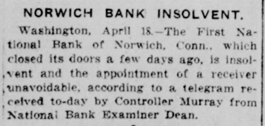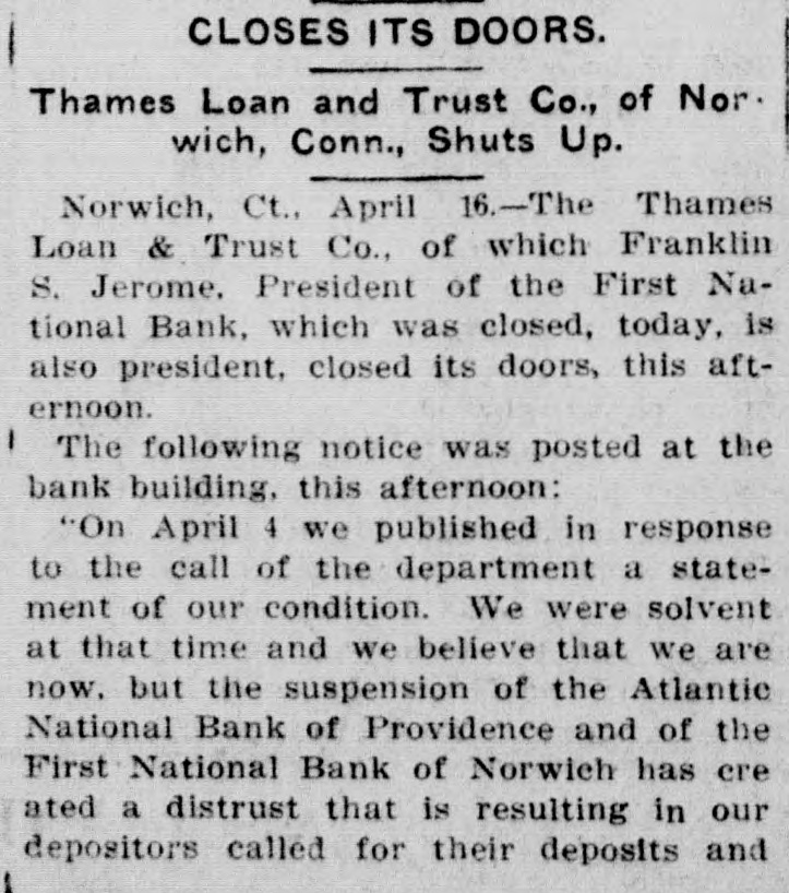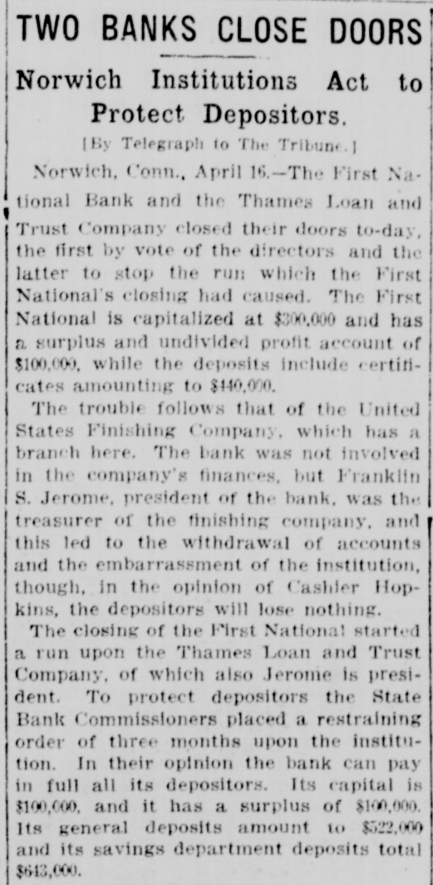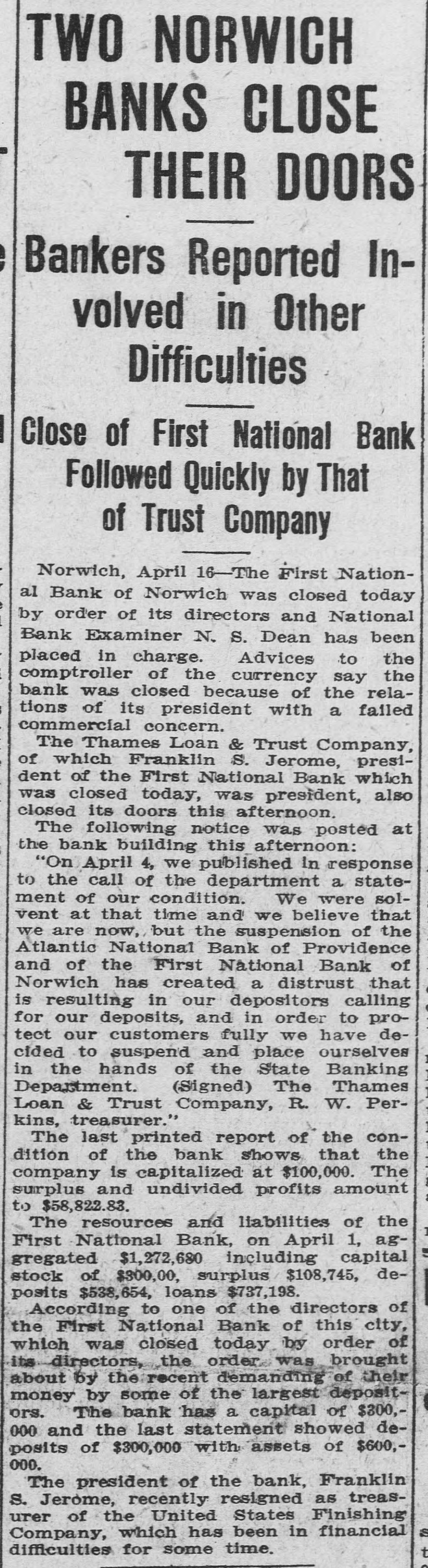 TWO NORWICH BANKS CLOSE THEIR DOORS Bankers Reported Involved in Other Difficulties Close of First National Bank Followed Quickly by That of Trust Company Norwich, April 16-The First National Bank of Norwich was closed today by order of its directors and National Bank Examiner N. S. Dean has been placed in charge. Advices to the comptroller of the currency say the bank was closed because of the relations of its president with a failed commercial concern. The Thames Loan & Trust Company, of which Franklin S. Jerome, president of the First National Bank which was closed today, was president, also closed its doors this afternoon. The following notice was posted at the bank building this afternoon: "On April 4, we published in response to the call of the department a statement of our condition. We were solvent at that time and we believe that we are now, but the suspension of the Atlantic National Bank of Providence and of the First National Bank of Norwich has created a distrust that is resulting in our depositors calling for our deposits, and in order to protect our customers fully we have decided to suspend and place ourselves in the hands of the State Banking Department. (Signed) The Thames Loan & Trust Company, R. W. Perkins, treasurer." The last printed report of the condition of the bank shows that the company is capitalized at $100,000. The surplus and undivided profits amount to $58,822.83. The resources and liabilities of the First National Bank, on April 1, aggregated $1,272,680 including capital stock of $300,00, surplus $108,745, deposits $538,654, loans $737,198. According to one of the directors of the First National Bank of this city, which was closed today by order of its directors, the order was brought about by the recent demanding of their money by some of the largest depositors. The bank has a capital of $300,000 and the last statement showed deposits of $300,000 with assets of $600,000. The president of the bank, Franklin S. Jerome, recently resigned as treasurer of the United States Finishing Company, which has been in financial difficulties for some time.