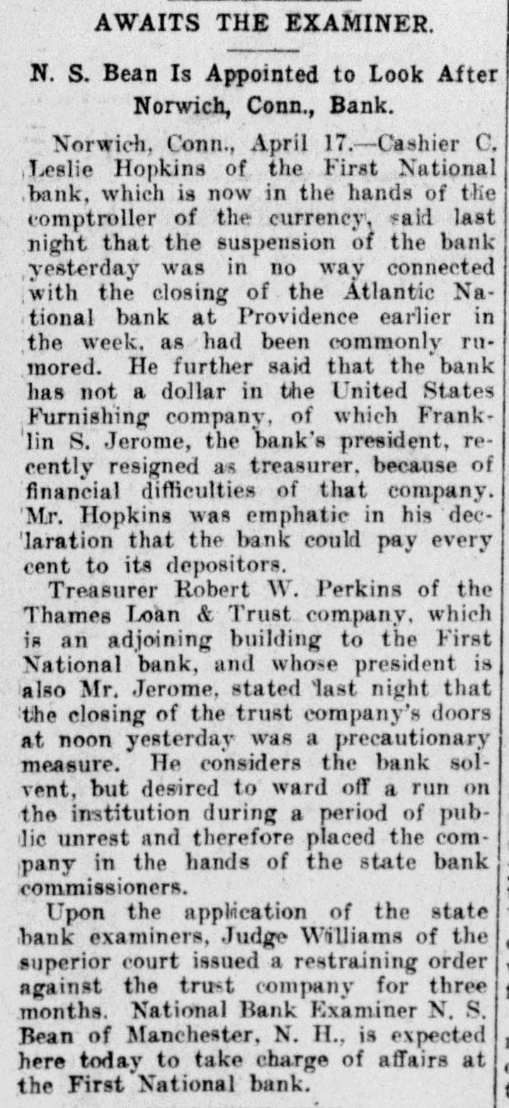 AWAITS THE EXAMINER. N. S. Bean Is Appointed to Look After Norwich, Conn., Bank. Norwich, Conn., April 17.-Cashier C. Leslie Hopkins of the First National bank, which is now in the hands of the comptroller of the currency, said last night that the suspension of the bank yesterday was in no way connected with the closing of the Atlantic National bank at Providence earlier in the week. as had been commonly rumored. He further said that the bank has not a dollar in the United States Furnishing company, of which Franklin S. Jerome, the bank's president, recently resigned as treasurer, because of financial difficulties of that company. Mr. Hopkins was emphatic in his declaration that the bank could pay every cent to its depositors. Treasurer Robert W. Perkins of the Thames Loan & Trust company, which is an adjoining building to the First National bank, and whose president is also Mr. Jerome, stated last night that the closing of the trust company's doors at noon yesterday was a precautionary measure. He considers the bank solvent, but desired to ward off a run on the institution during a period of public unrest and therefore placed the company in the hands of the state bank commissioners. Upon the application of the state bank examiners, Judge Williams of the superior court issued a restraining order against the trust company for three months. National Bank Examiner N. S. Bean of Manchester, N. H., is expected here today to take charge of affairs at the First National bank.